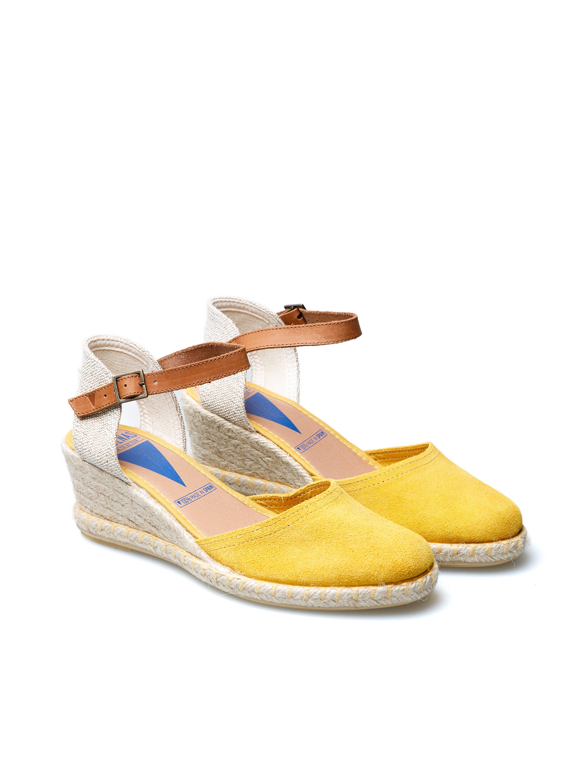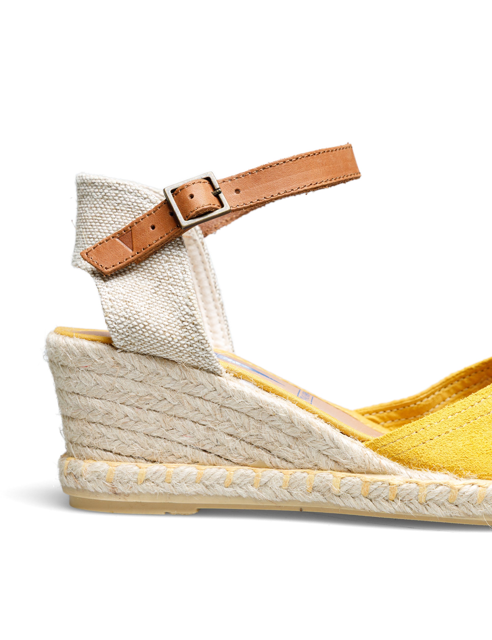 Alpargatas con Cuña Malena Serraje en color Ambar. Confeccionadas con material de Serraje, forro y planta de piel y suela de yute y goma. Altura de la cuña 5.5 cm. Fabricadas en España. Malena es la cuña icónica de Verbenas. Su cosido y cuña de yute conectan con las raíces del mar y la tierra, mientras que su material natural honra el legado de los artesanos. Con cada paso, el modelo Malena te transporta a esas cálidas tardes de verano, donde lo moderno y lo tradicional se encuentran.