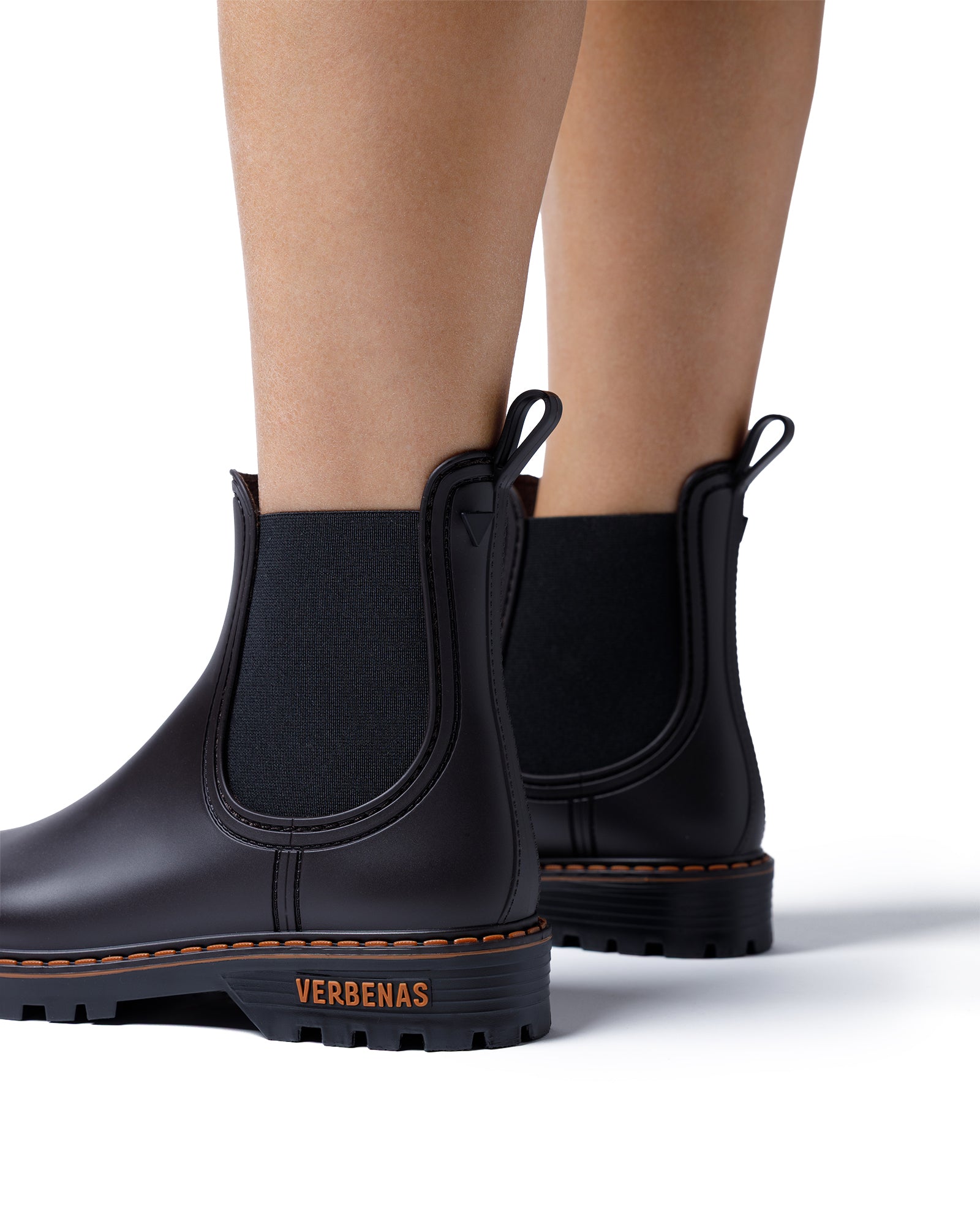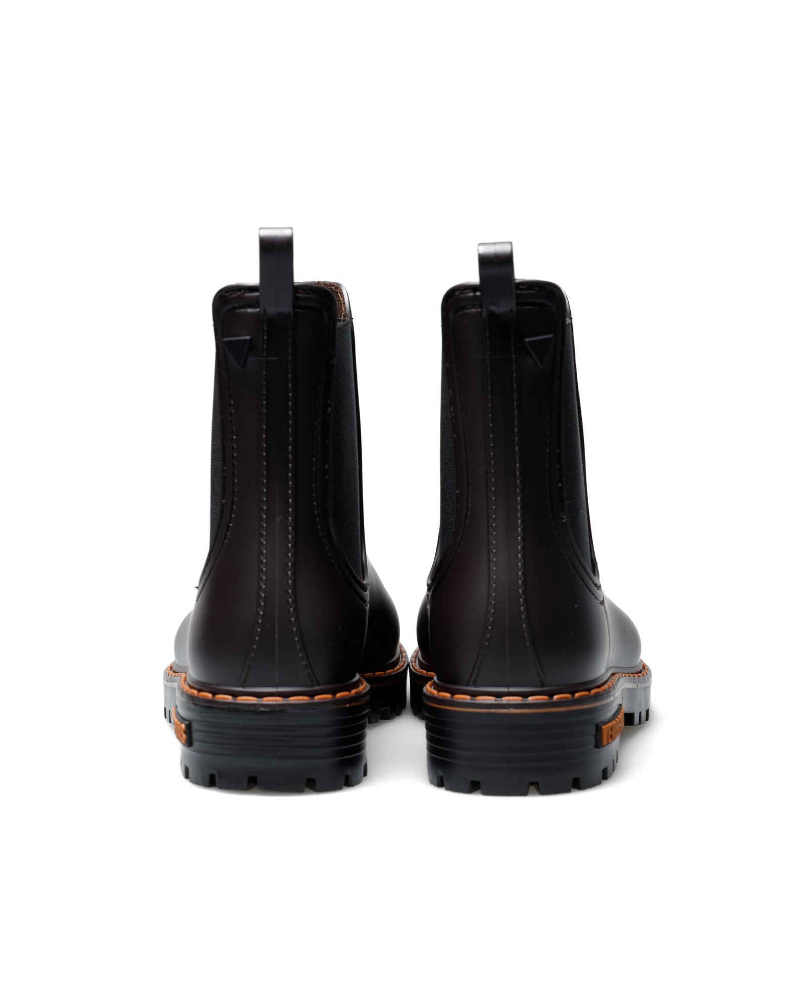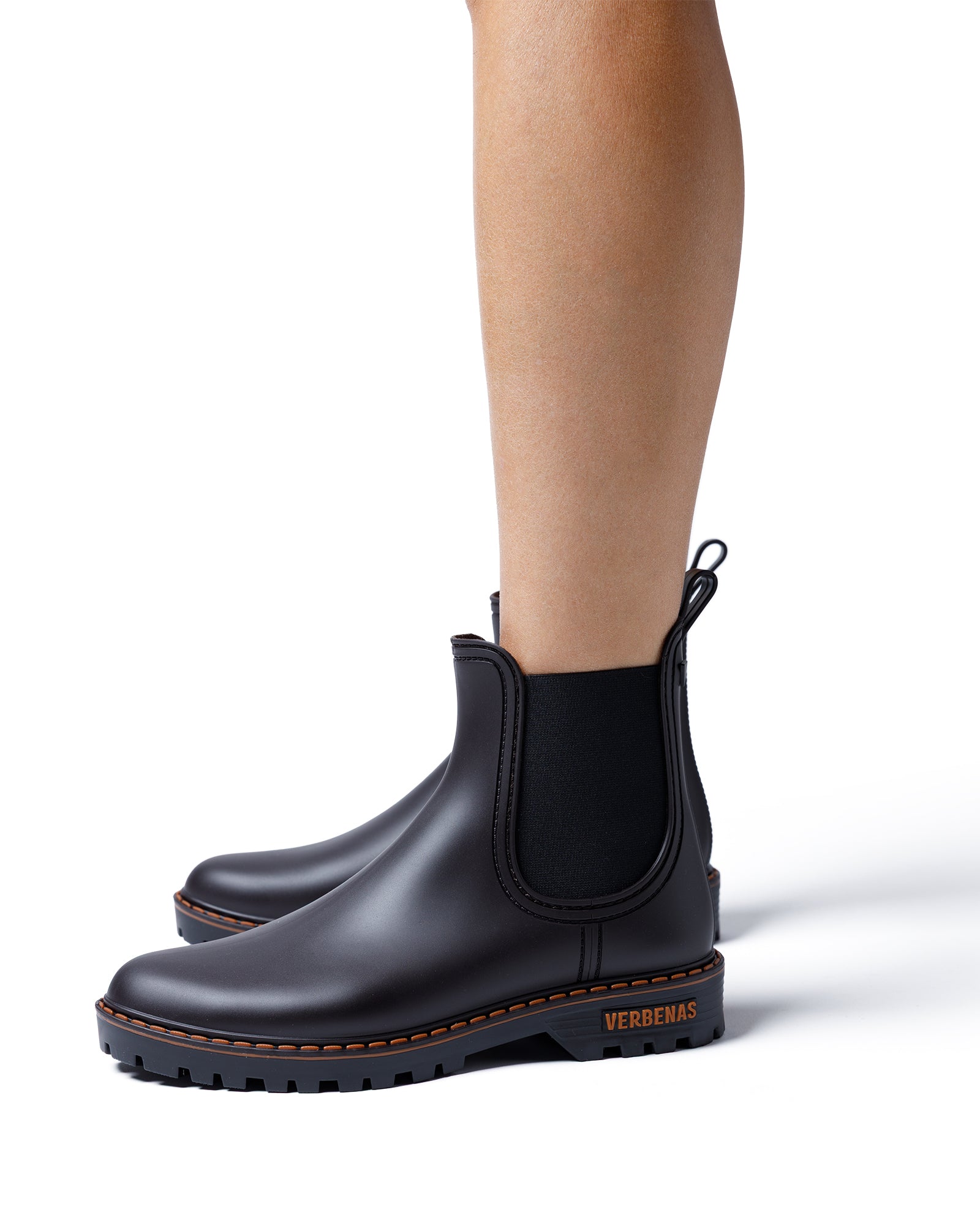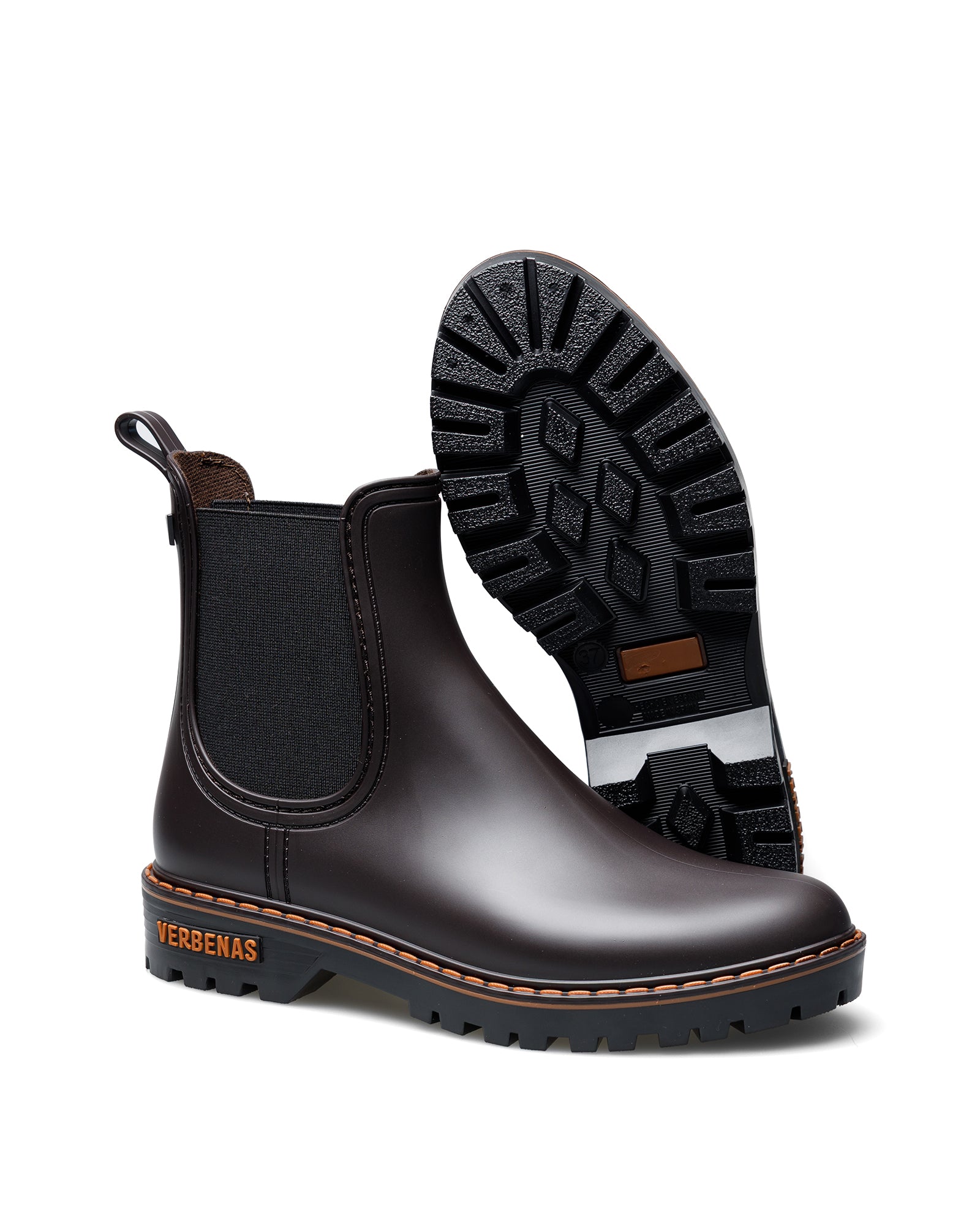 Bota de Agua Gaudí Countryside en color Marrón oscuro. Confeccionadas con corte sintético. forro y planta textil y suela de goma. Altura caña de la bota: 14 cm. Incorpora una suela dentada y costuras simuladas como señas de identidad Fusiona la sofisticación londinense con el encanto natural de la campiña inglesa.Tonos terrosos combinados con suela negra que aportan versatilidad, convirtiéndola en la opción perfecta tanto para recorrer la ciudad como para escapadas en clave rural.
