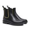 Bota de Agua Gaudí Mate Glitter en color Negro-Oro. Confeccionadas con corte sintético. forro y planta textil y suela de goma. Altura caña de la bota: 14 cm. Inspiradas en la clásica bota Chelsea,reinterpretan su esencia con un toque urbano al más puro estilo londinense. La versión Gaudí Glitter eleva el diseño con un detalle en glitter metalizado en el elástico, aportando un brillo sutil que realza su estilo. Una silueta atemporal con alma moderna que combina sofisticación y funcionalidad en cada paso.