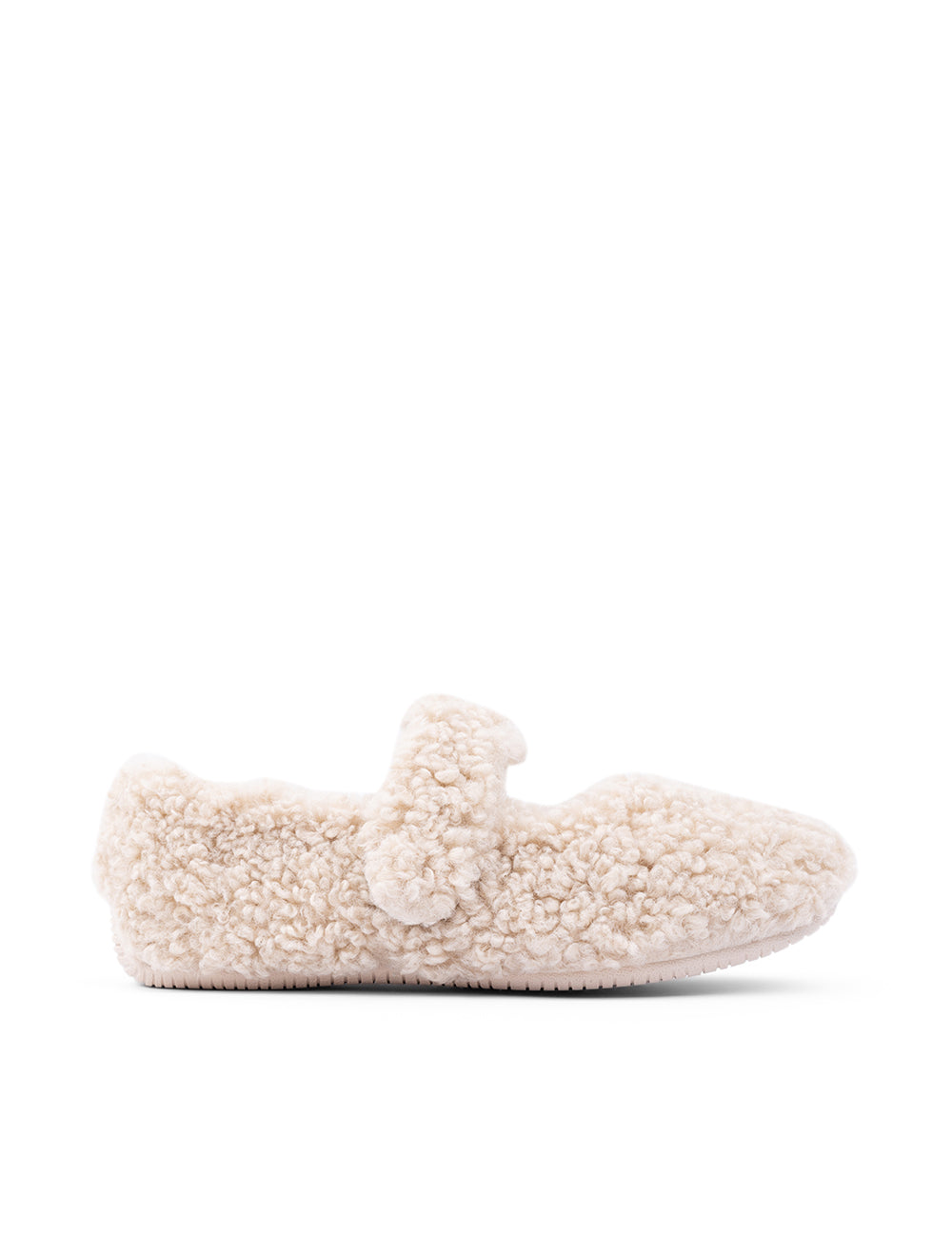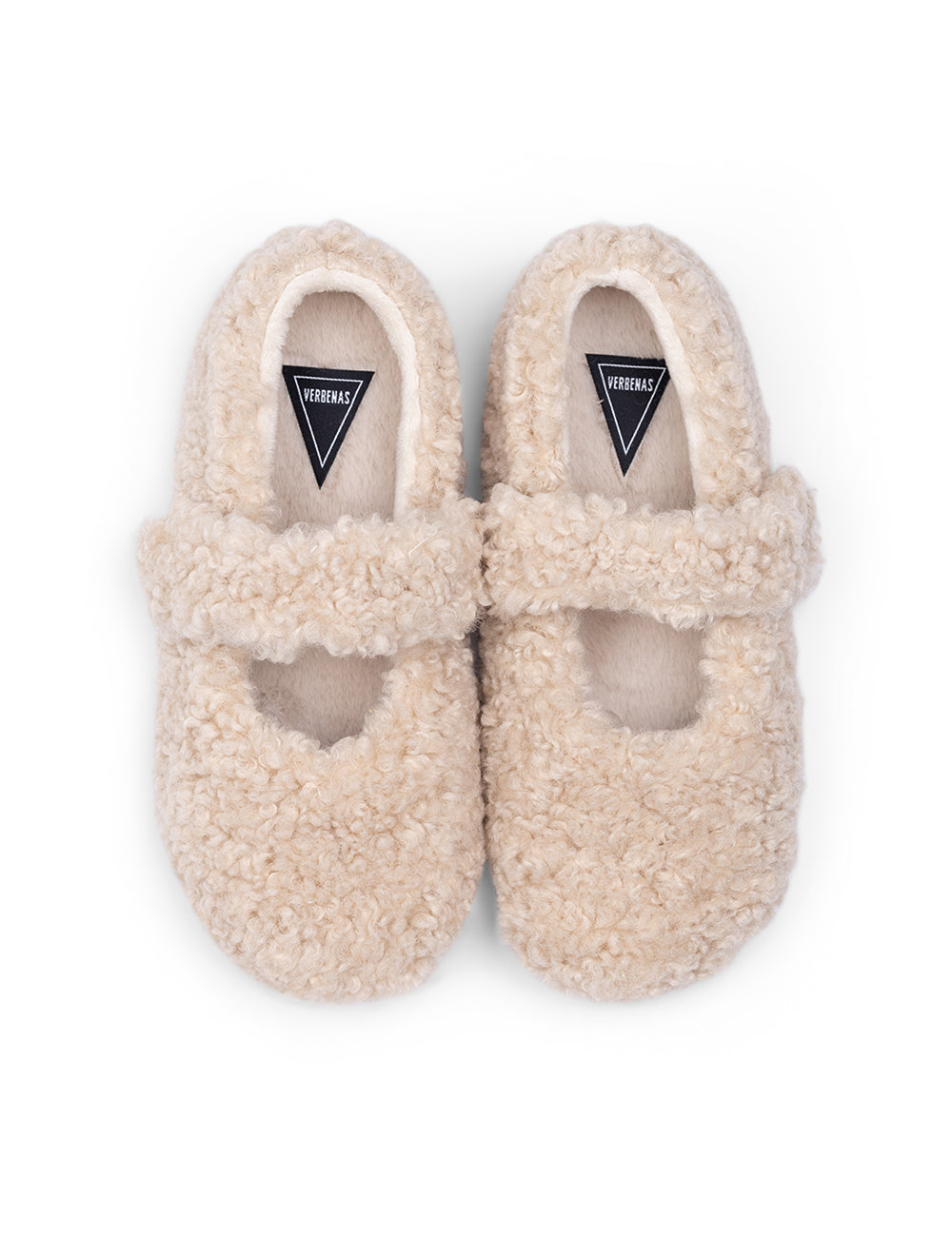 Zapatillas de casa Yina Curly en color Beig. Confeccionadas con corte 100% PES, forro y planta 100% PES, y suela 100% de caucho. Fabricadas en España. Destaca su parte exterior con borrego largo rizado y su forro de pelo en su interior.  Inspirada en la silueta Mary Jane, Yina es la versión más cool de nuestras zapatillas de estar por casa. Perfecta para quienes desean mantener el estilo incluso en la comodidad de su propio hogar.