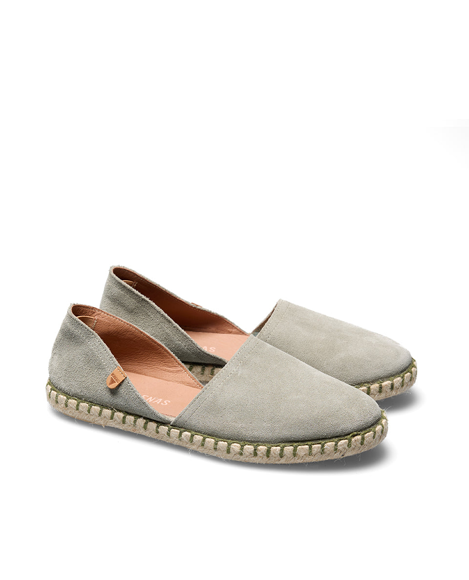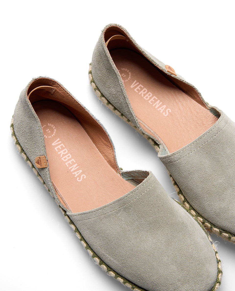 Flache Espadrilles von Carmen Serraje in der Farbe Bosco. Hergestellt aus gespaltenem Wildleder, Futter und Sohle aus Leder, Jute und Gummisohle. Hergestellt in Spanien. Carmen ist die Ikone von Verbenas, eine Espadrille, die Zeit und Jahreszeiten überdauert. Mit ihrem exklusiven Design, das Tradition und Moderne vereint, passt sich dieses Modell sowohl der Stadt als auch der Küste an und ist damit der perfekte Schuh für jede Gelegenheit. Inspiriert von den spanischen Wurzeln, erinnert sein Name an die Festlichkeit der Virgen del Carmen und die sommerlichen Verbenas.