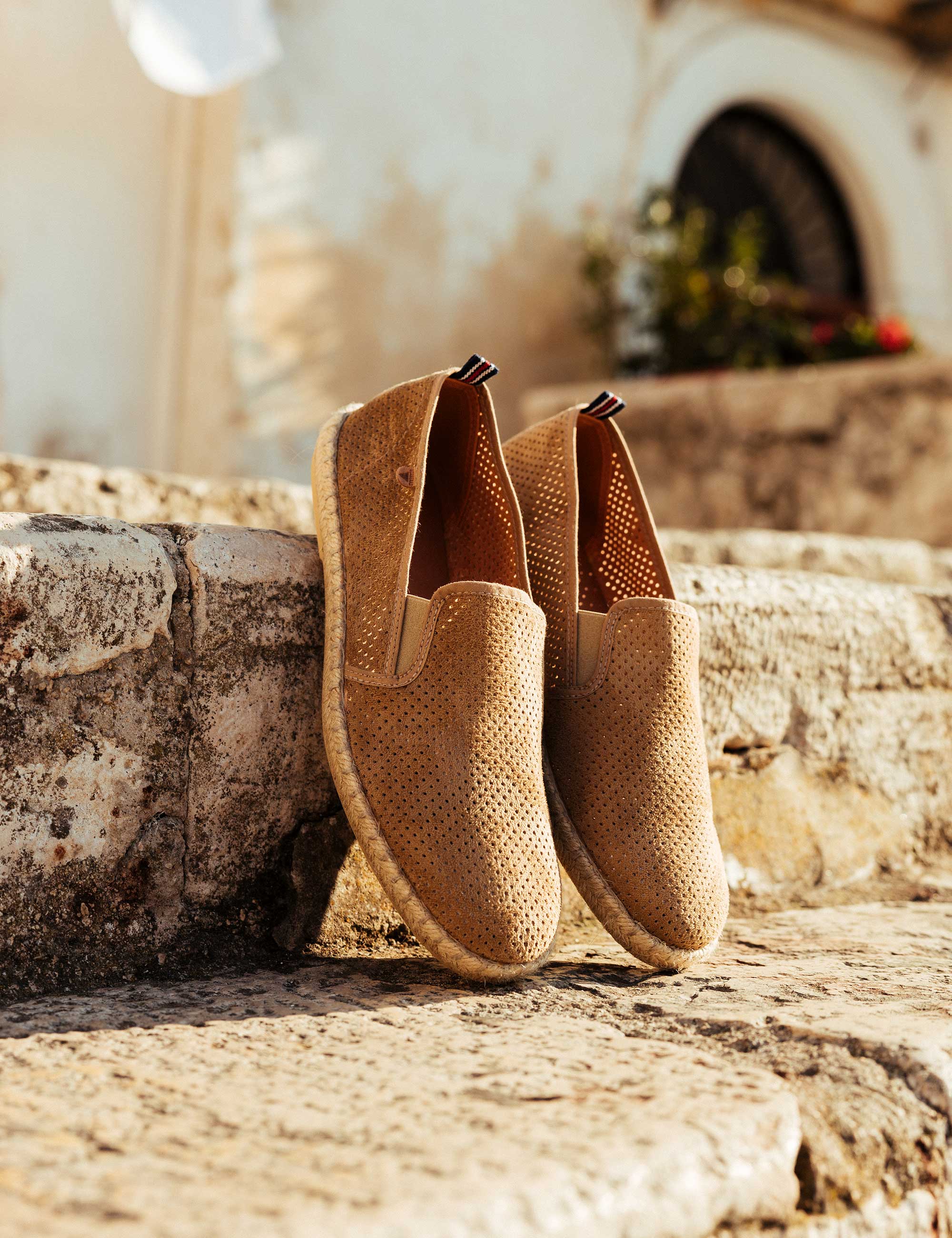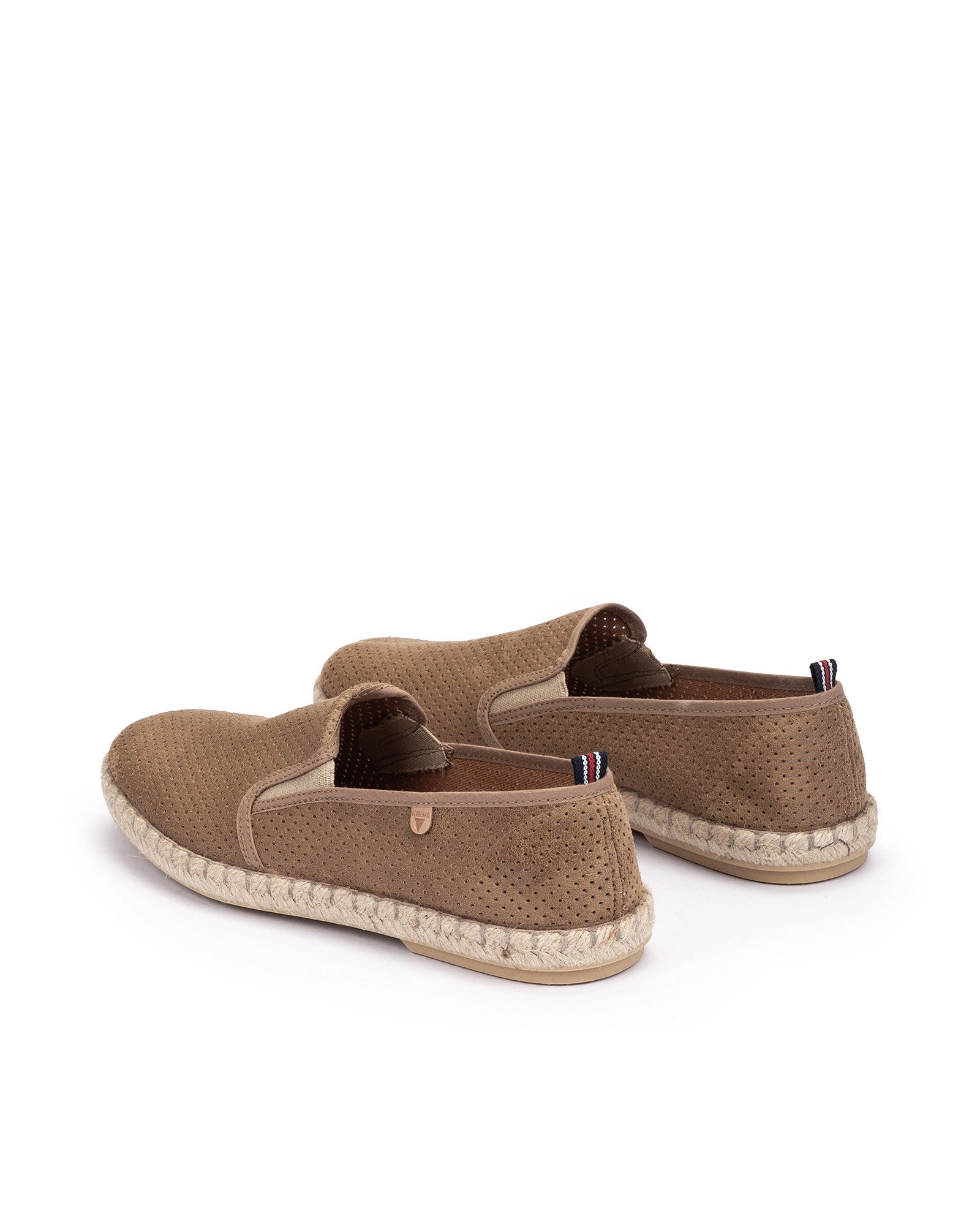 Tom Hole/Micro Espadrilles in der Farbe Eiche. Hergestellt in Spanien mit mikroperforiertem Textilmaterial, Lederfutter und -sohle sowie Jute- und Gummisohle. Sie haben zwei elastische Seiten für eine einfache Passform.Espadrilles, die nicht nur der Tradition huldigen, sondern sich auch dem modernen Lebensstil anpassen und dabei unvergleichlichen Komfort und einen Hauch von Raffinesse bieten. Mit Tom ist jeder Schritt ein stilistisches Statement, das die Frische des Mittelmeers und den zeitlosen Geist von Verbenas widerspiegelt.