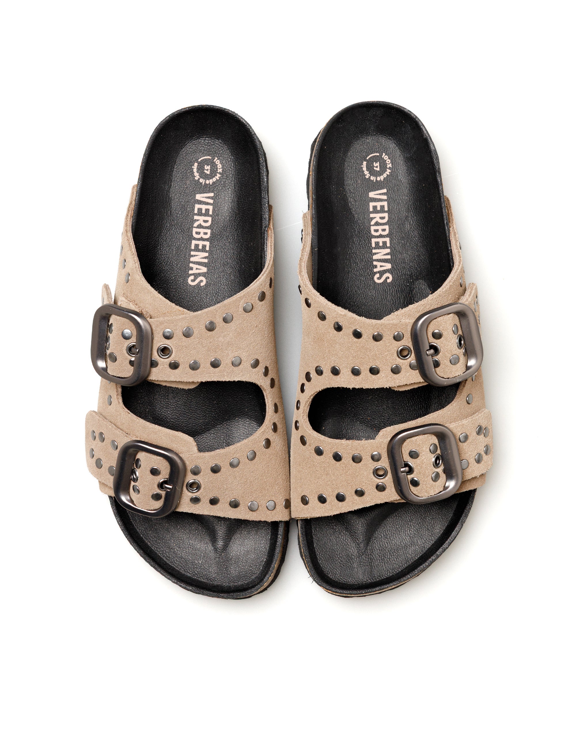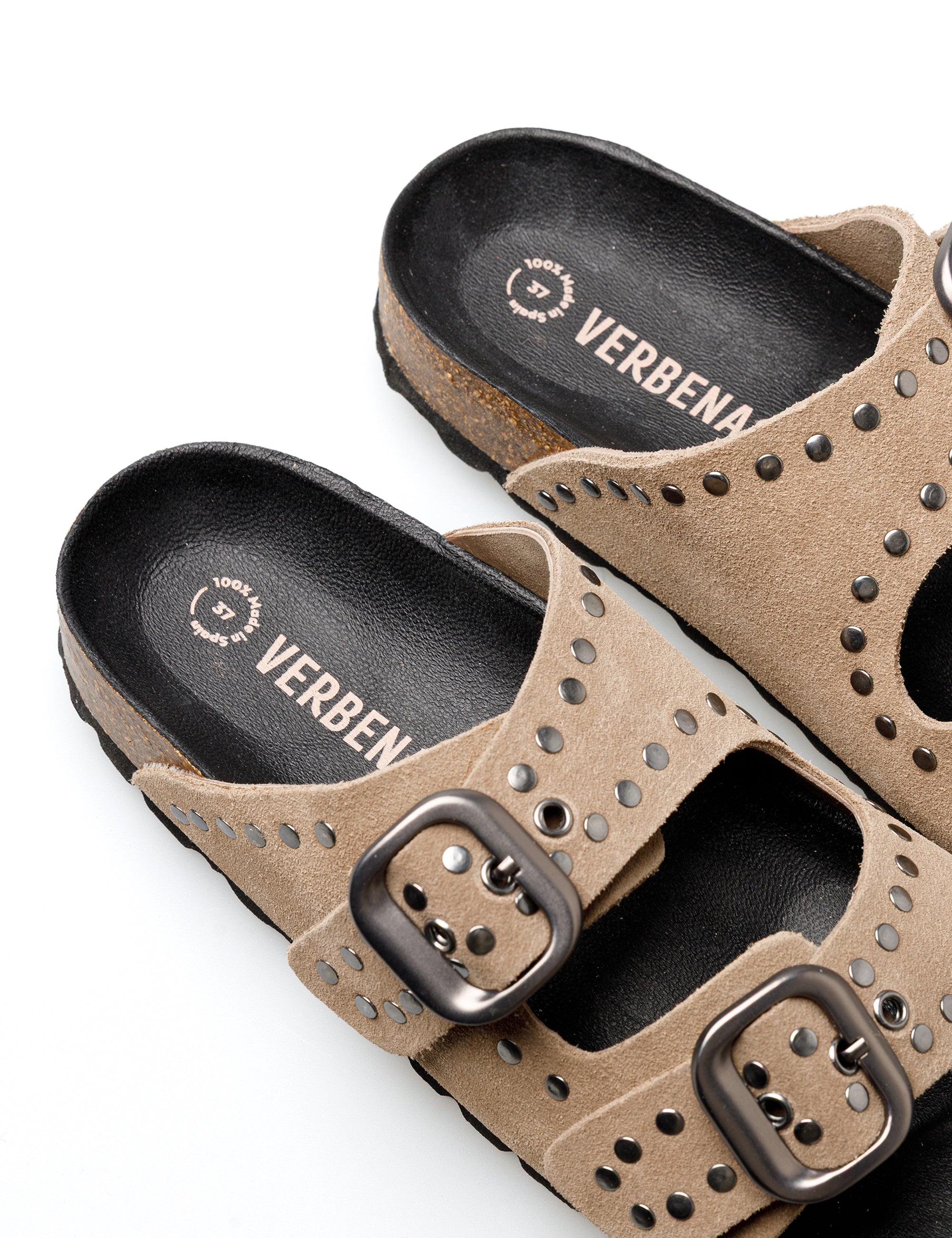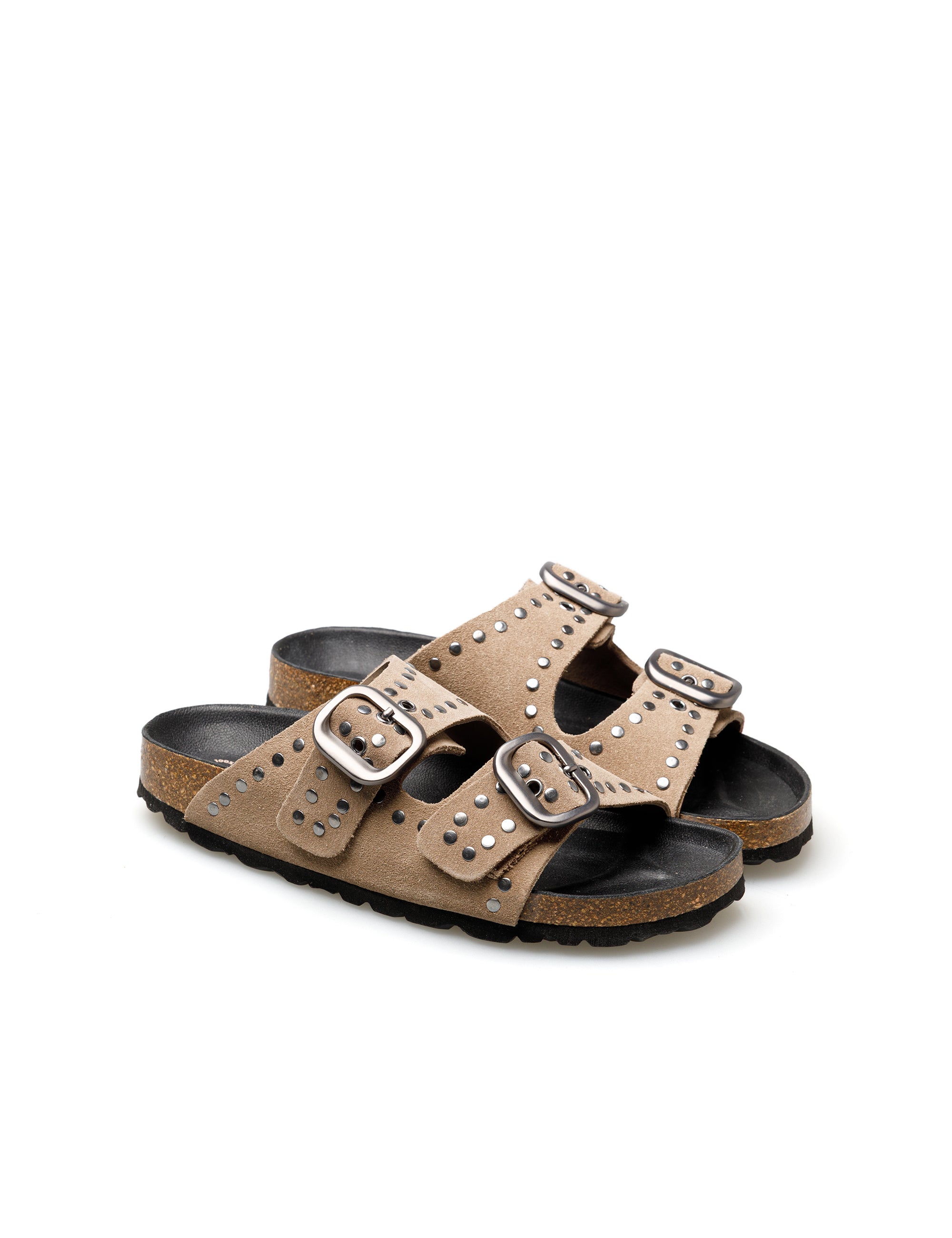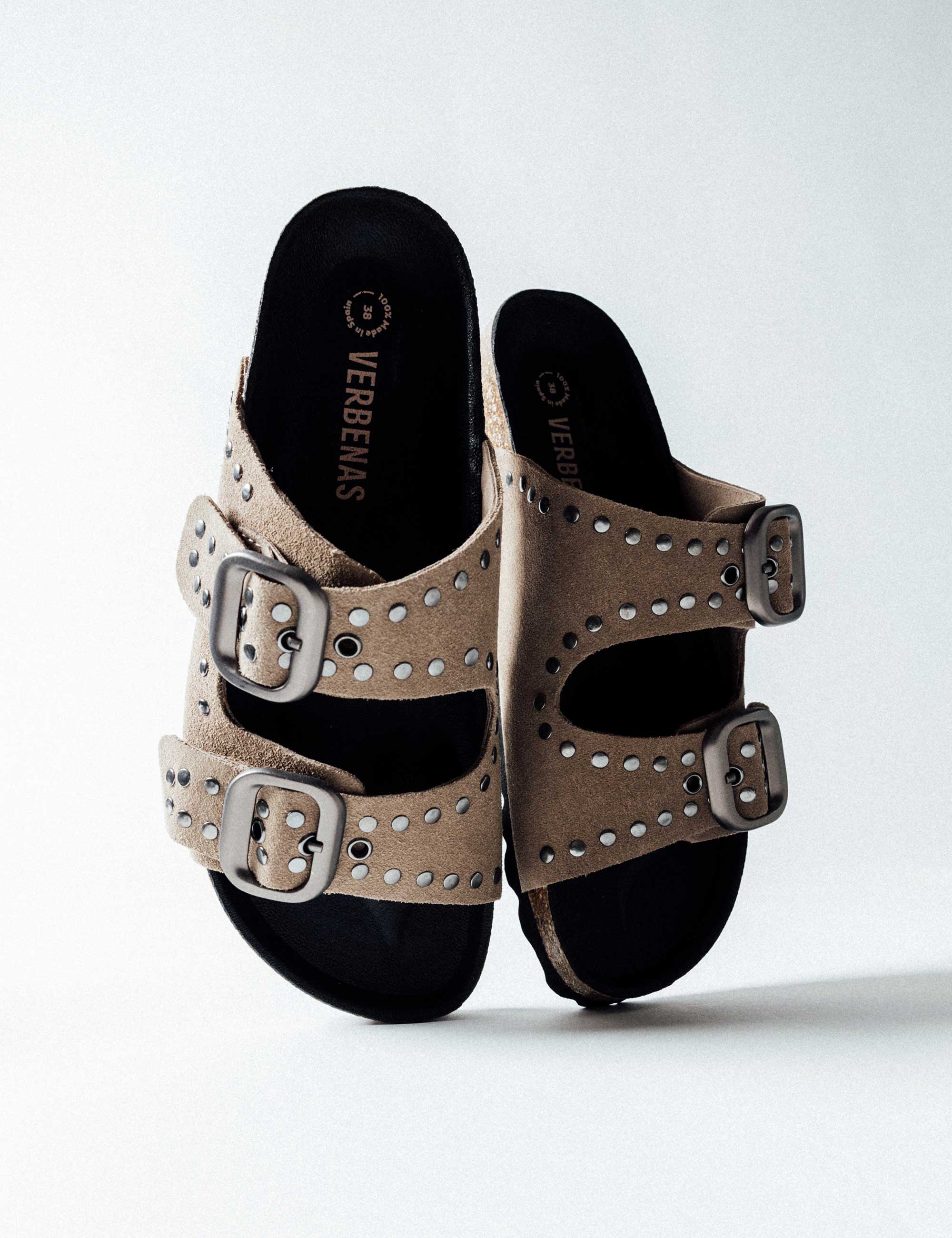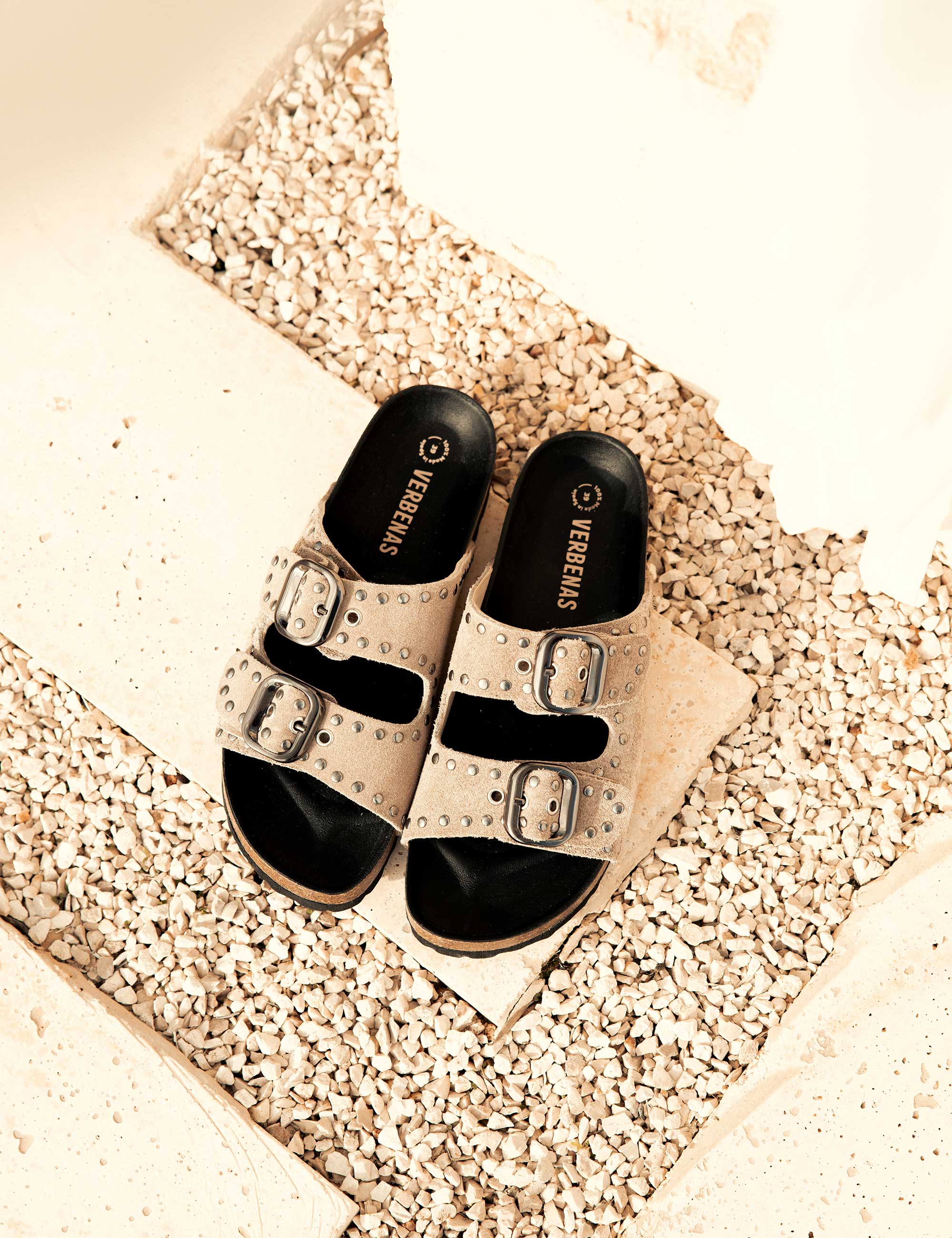 Sandalen Randel Serraje Tachas in der Farbe Stone. Hergestellt aus Wildleder, Futter und Sohle aus Leder und Sohle aus Gummi und Kork. Hergestellt in Spanien.Randel ist eine Sandale, die das Erbe der Handwerkskunst zelebriert und gleichzeitig die aktuelle Mode aufgreift. Sie wurde für diejenigen entworfen, die einen eleganten, modernen und charaktervollen Schuh suchen. Die mit dem gleichen Material gefütterten Schnallen und die Nieten sorgen für ein tadelloses Finish und einen Gesamtlook, der die perfekte Verschmelzung von Klassik und Moderne widerspiegelt.