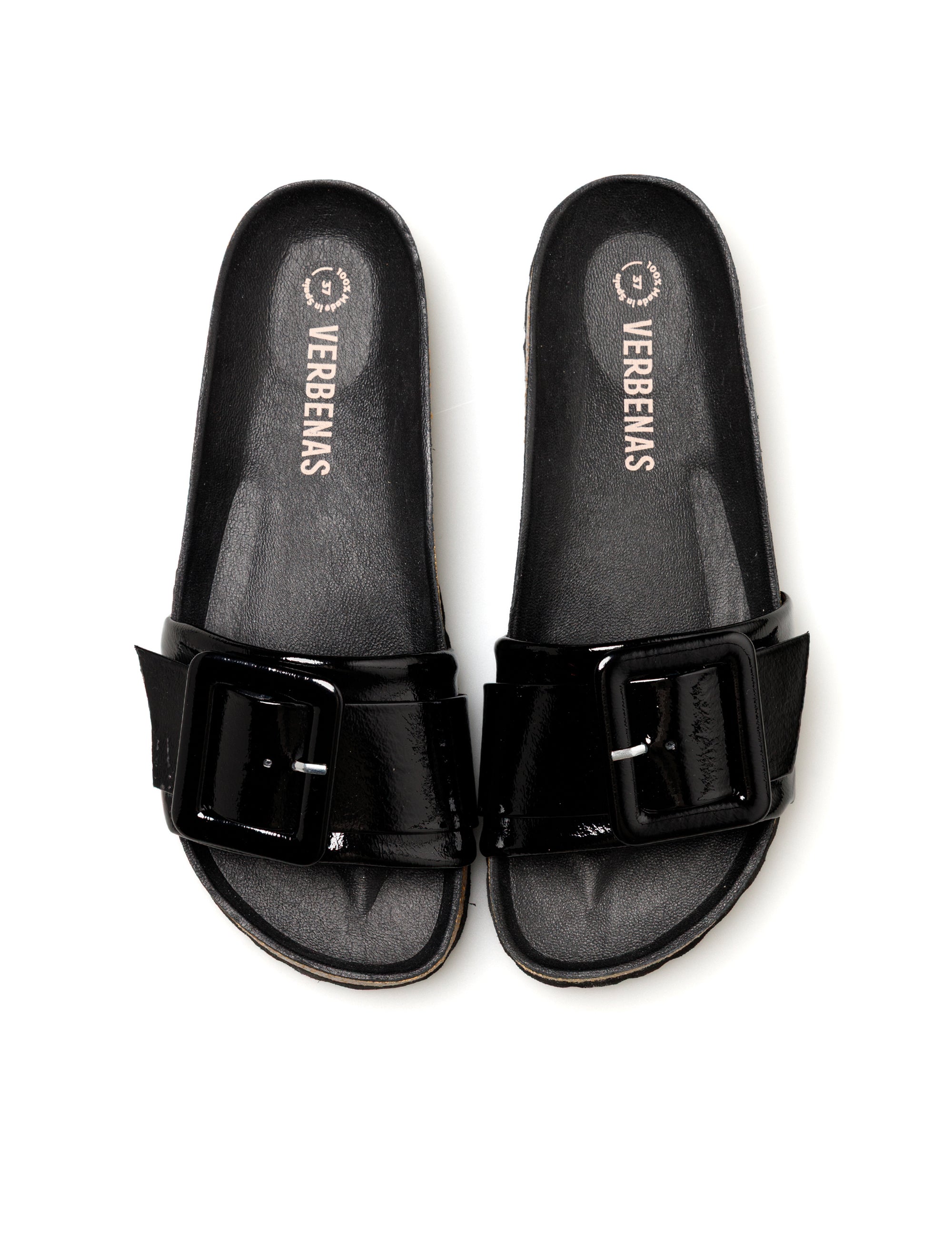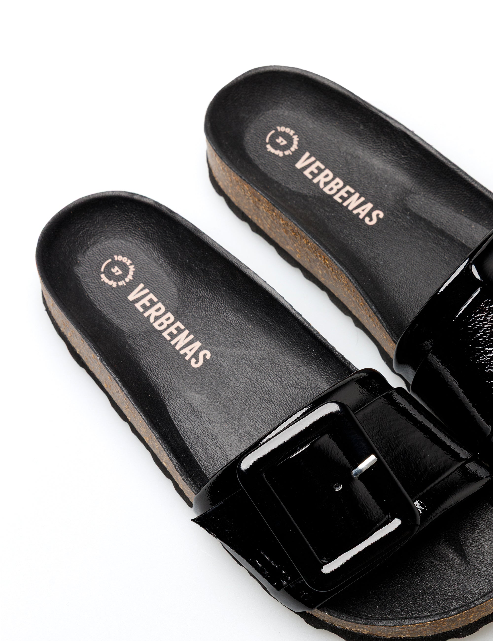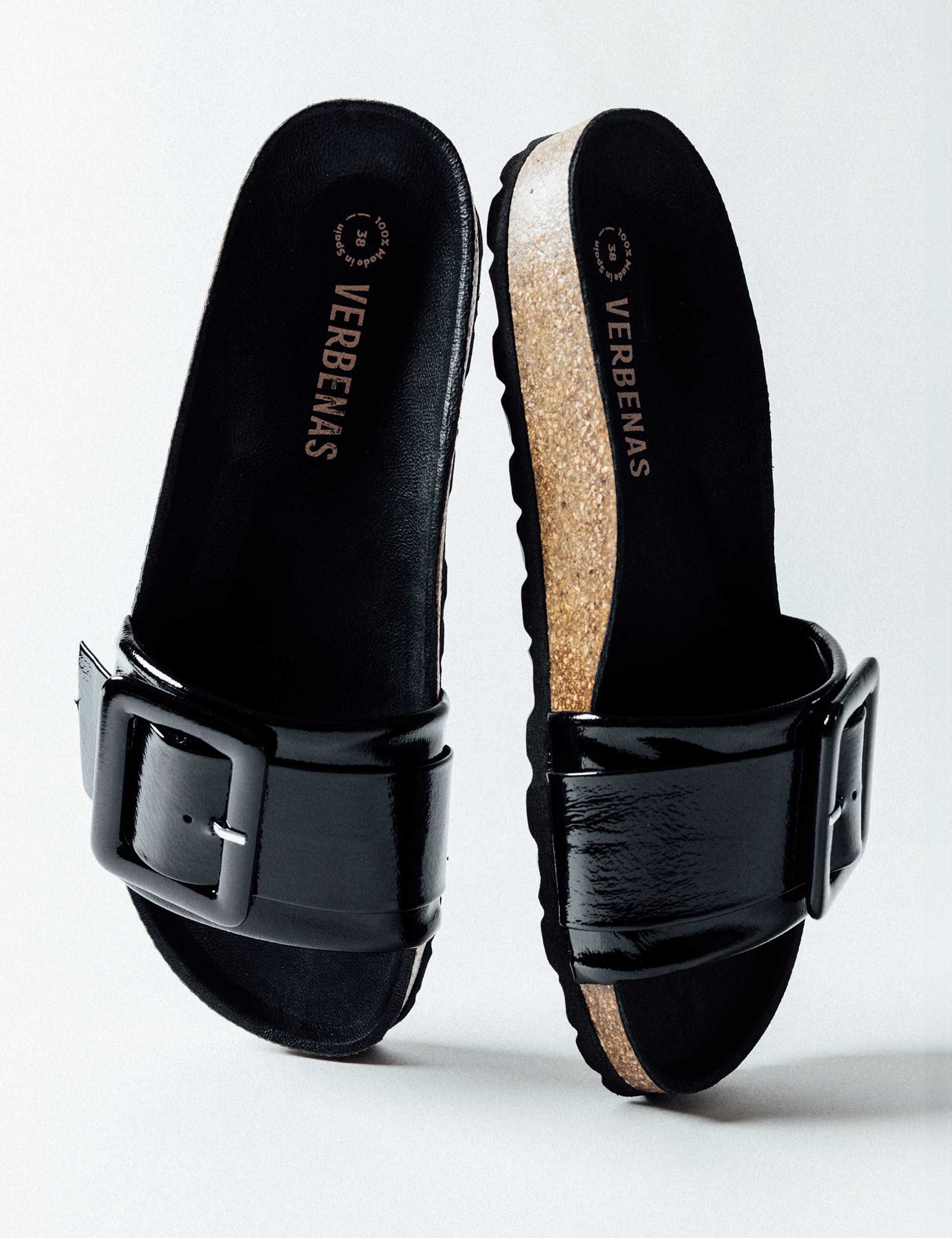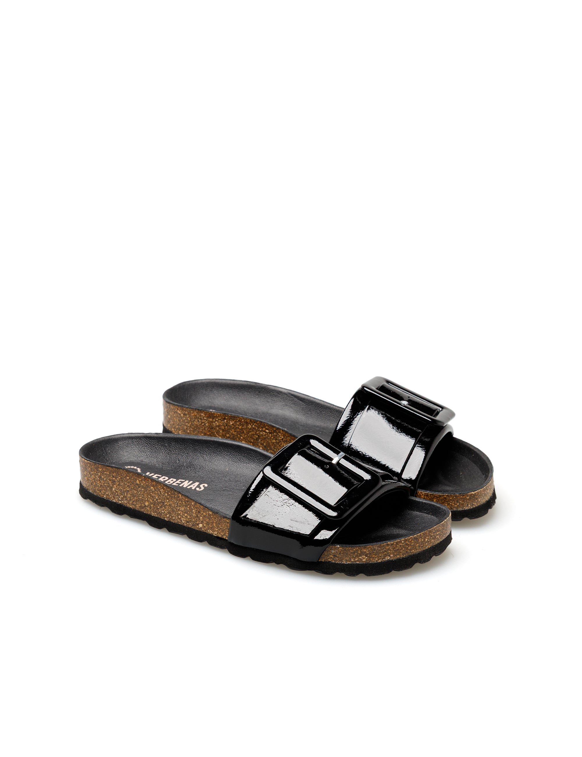 Reiko Lak Sandalen in schwarz. Hergestellt aus Lackleder, Futter und Sohle aus Leder und Sohle aus Gummi und Kork. Hergestellt in Spanien.Mit einem einzigen markanten Detail, einer Schnalle, spiegelt diese minimalistische Sandale Komfort und Eleganz in ihrer reinsten Form wider. Dieses zeitlose Essential verkörpert die Essenz von Verbenas, indem es Funktionalität und Stil mit einer klaren, frischen Ästhetik verbindet.