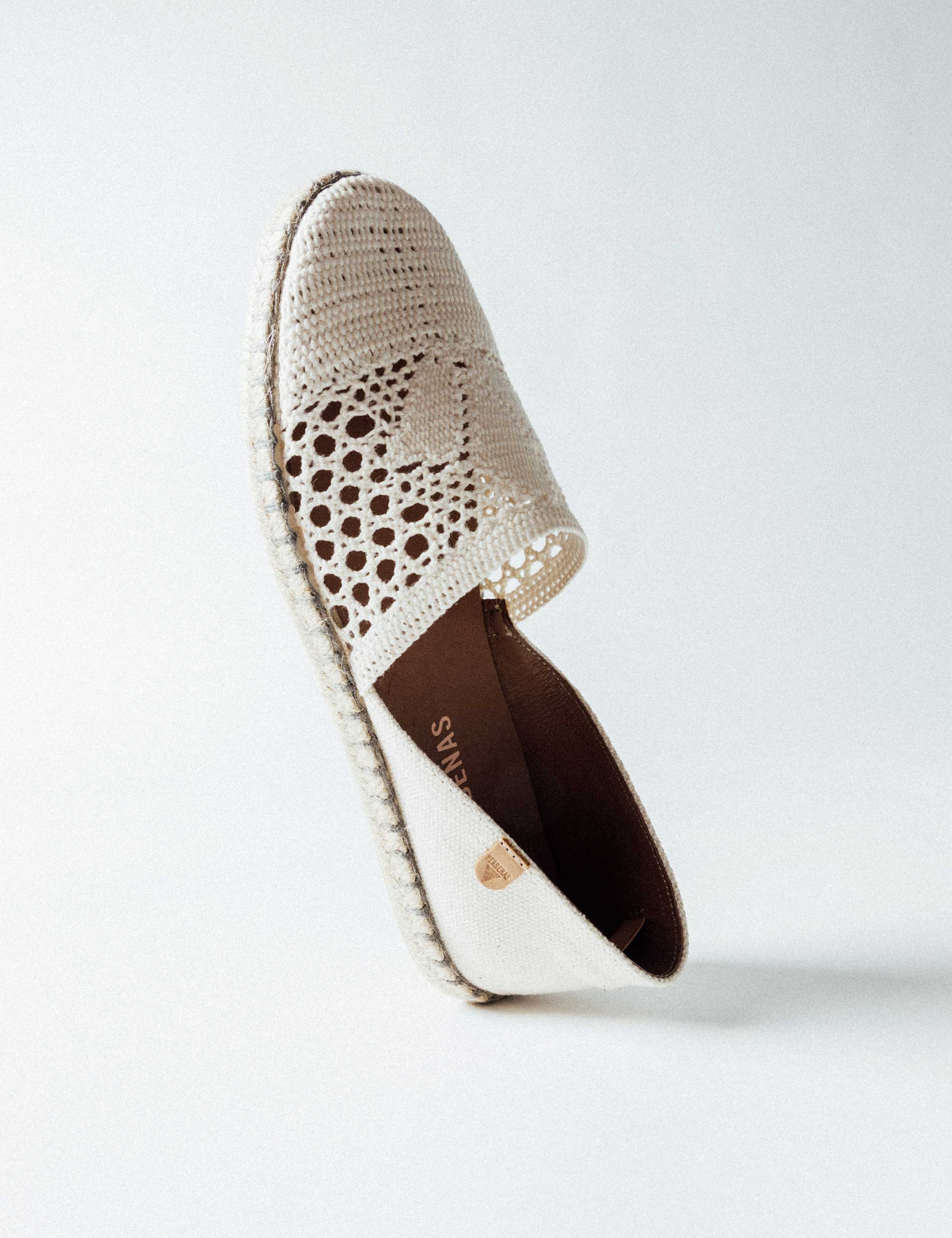 Carmen Espadrilles aus Häkel-Leinen/Wildleder in Ecru. Hergestellt aus Baumwollstoff in Häkeltechnik, Futter und Sohle aus Leder, Jute und Gummisohle. Hergestellt in Spanien. Carmen ist die Ikone von Verbenas, eine Espadrille, die Zeit und Jahreszeiten überdauert. Mit ihrem exklusiven Design, das Tradition und Moderne vereint, passt sich dieses Modell sowohl der Stadt als auch der Küste an und ist damit der perfekte Schuh für jede Gelegenheit. Inspiriert von den spanischen Wurzeln, erinnert sein Name an die Festlichkeit der Virgen del Carmen und die sommerlichen Verbenas.