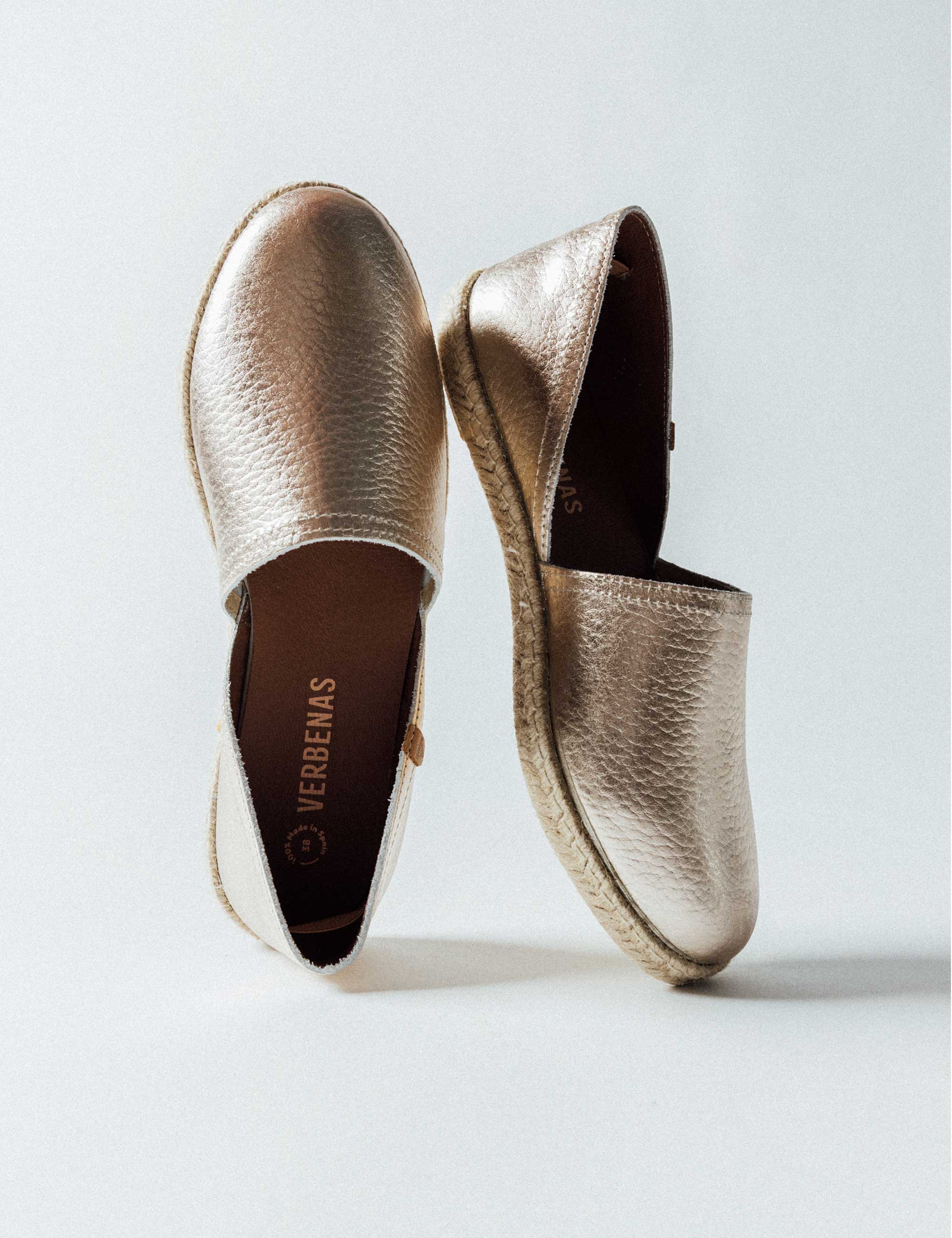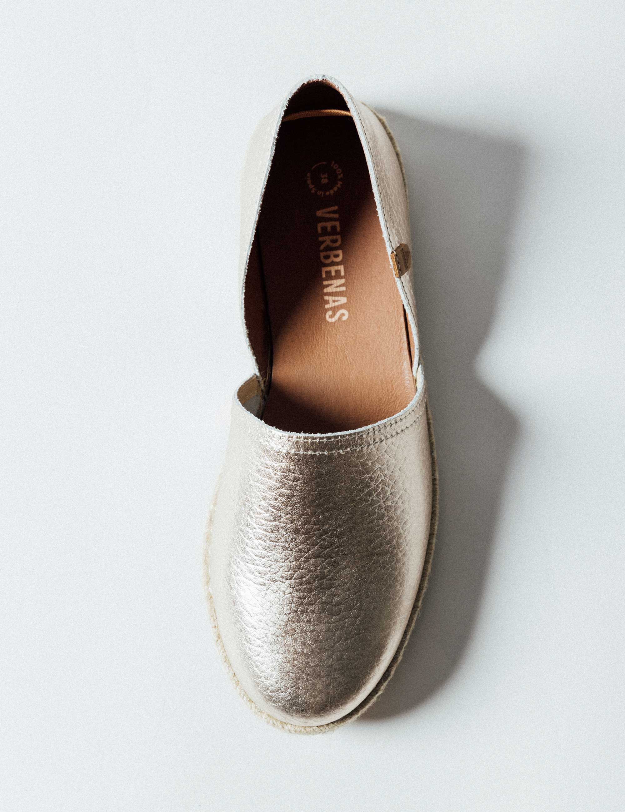 Carmen Nucleo Metall flache Espadrilles in Gold. Hergestellt aus Nappaleder mit eingravierter Metallstruktur, Futter und Sohle aus Leder, Jute und Gummisohle. Hergestellt in Spanien. Carmen ist die Ikone von Verbenas, eine Espadrille, die Zeit und Jahreszeiten überdauert. Mit seinem exklusiven Design, das Tradition und Moderne vereint, passt sich dieses Modell sowohl an die Stadt als auch an die Küste an und ist somit der perfekte Schuh für jede Gelegenheit. Inspiriert von den spanischen Wurzeln, erinnert sein Name an die Festlichkeit der Virgen del Carmen und die sommerlichen Verbenas.