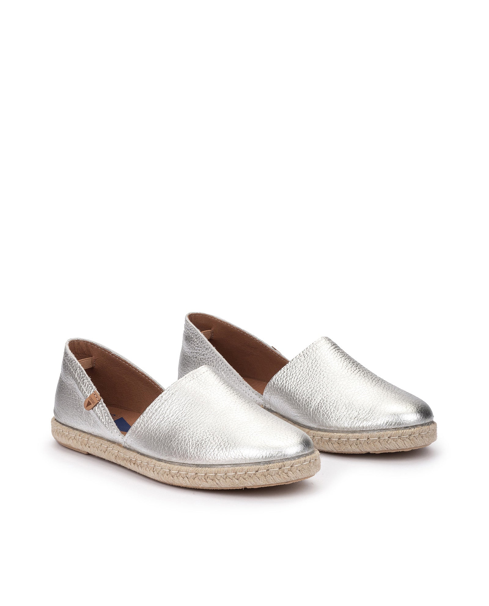 Flache Espadrilles Carmen Nucleo Metal in Silber. Hergestellt aus Nappaleder mit eingravierter Metallstruktur, Futter und Sohle aus Leder, Jute und Gummisohle. Hergestellt in Spanien. Carmen ist die Ikone von Verbenas, eine Espadrille, die Zeit und Jahreszeiten überdauert. Mit seinem exklusiven Design, das Tradition und Moderne vereint, passt sich dieses Modell sowohl an die Stadt als auch an die Küste an und ist somit der perfekte Schuh für jede Gelegenheit. Inspiriert von den spanischen Wurzeln, erinnert sein Name an die Festlichkeit der Virgen del Carmen und die sommerlichen Verbenas.