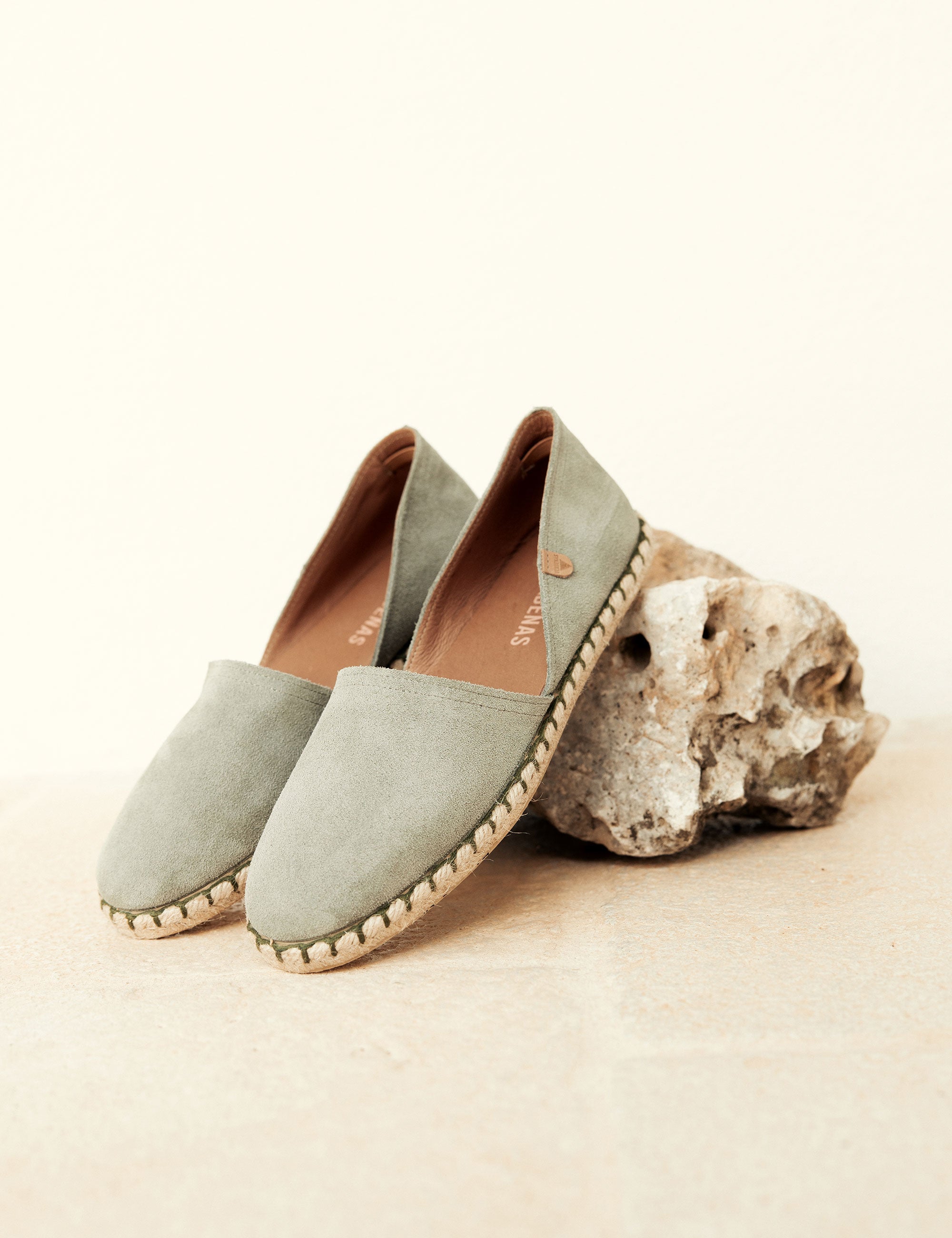 Flache Espadrilles von Carmen Serraje in der Farbe Bosco. Hergestellt aus gespaltenem Wildleder, Futter und Sohle aus Leder, Jute und Gummisohle. Hergestellt in Spanien. Carmen ist die Ikone von Verbenas, eine Espadrille, die Zeit und Jahreszeiten überdauert. Mit ihrem exklusiven Design, das Tradition und Moderne vereint, passt sich dieses Modell sowohl der Stadt als auch der Küste an und ist damit der perfekte Schuh für jede Gelegenheit. Inspiriert von den spanischen Wurzeln, erinnert sein Name an die Festlichkeit der Virgen del Carmen und die sommerlichen Verbenas.