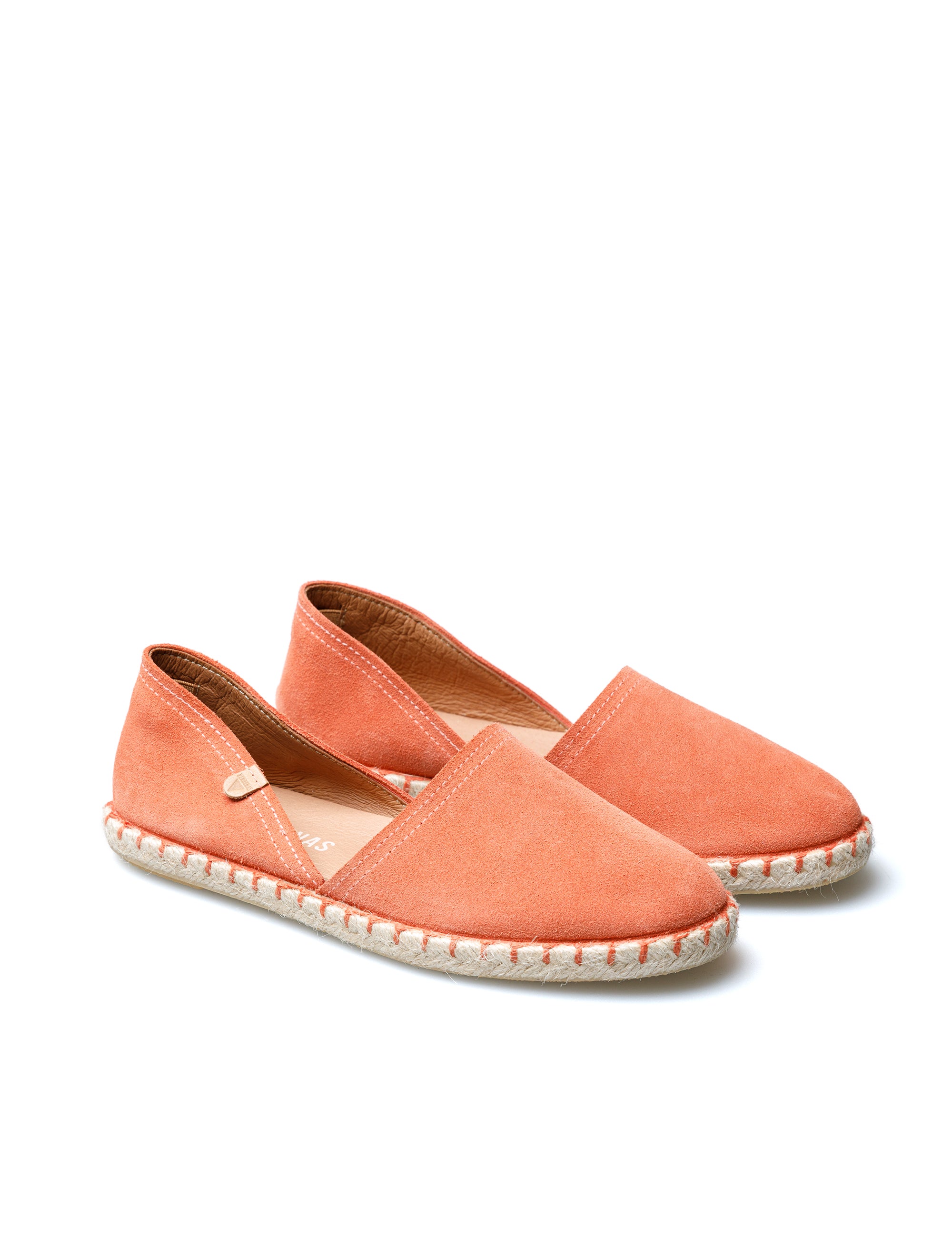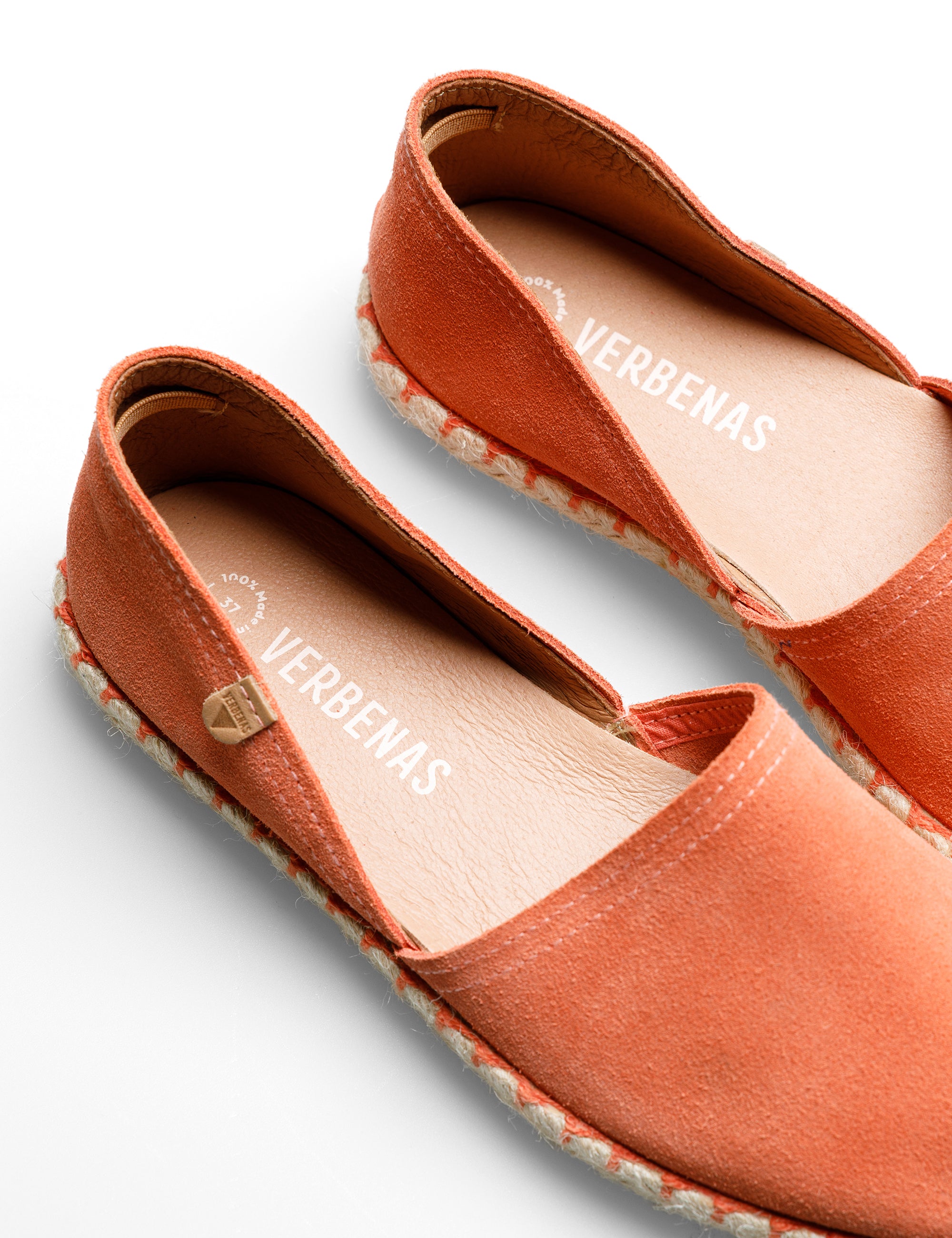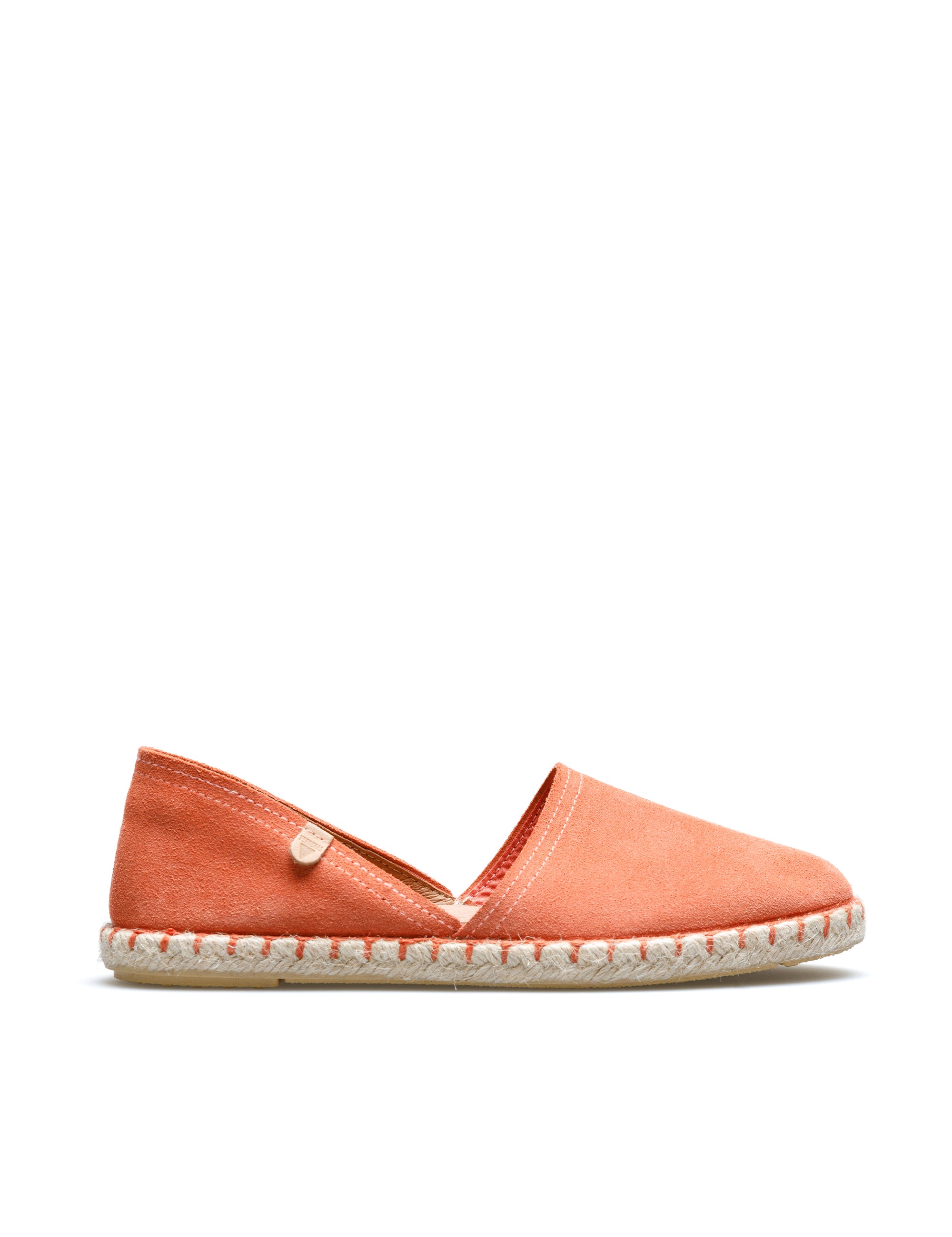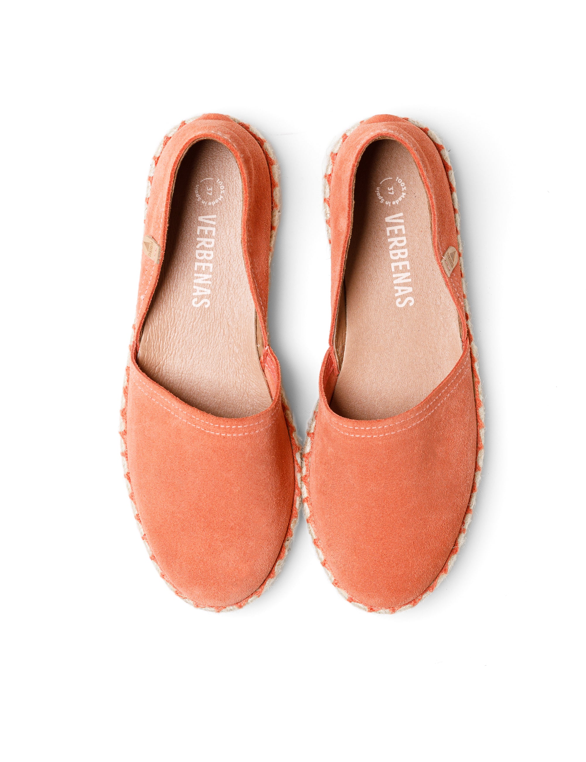 Flache Espadrilles von Carmen Serraje in der Farbe Koralle. Hergestellt aus Wildleder, Lederfutter und -sohle, Jute und Gummisohle. Hergestellt in Spanien. Carmen ist die Ikone von Verbenas, eine Espadrille, die Zeit und Jahreszeiten überdauert. Mit seinem exklusiven Design, das Tradition und Moderne vereint, passt sich dieses Modell sowohl der Stadt als auch der Küste an und ist somit der perfekte Schuh für jede Gelegenheit. Inspiriert von den spanischen Wurzeln, erinnert sein Name an die Festlichkeit der Virgen del Carmen und die sommerlichen Verbenas.