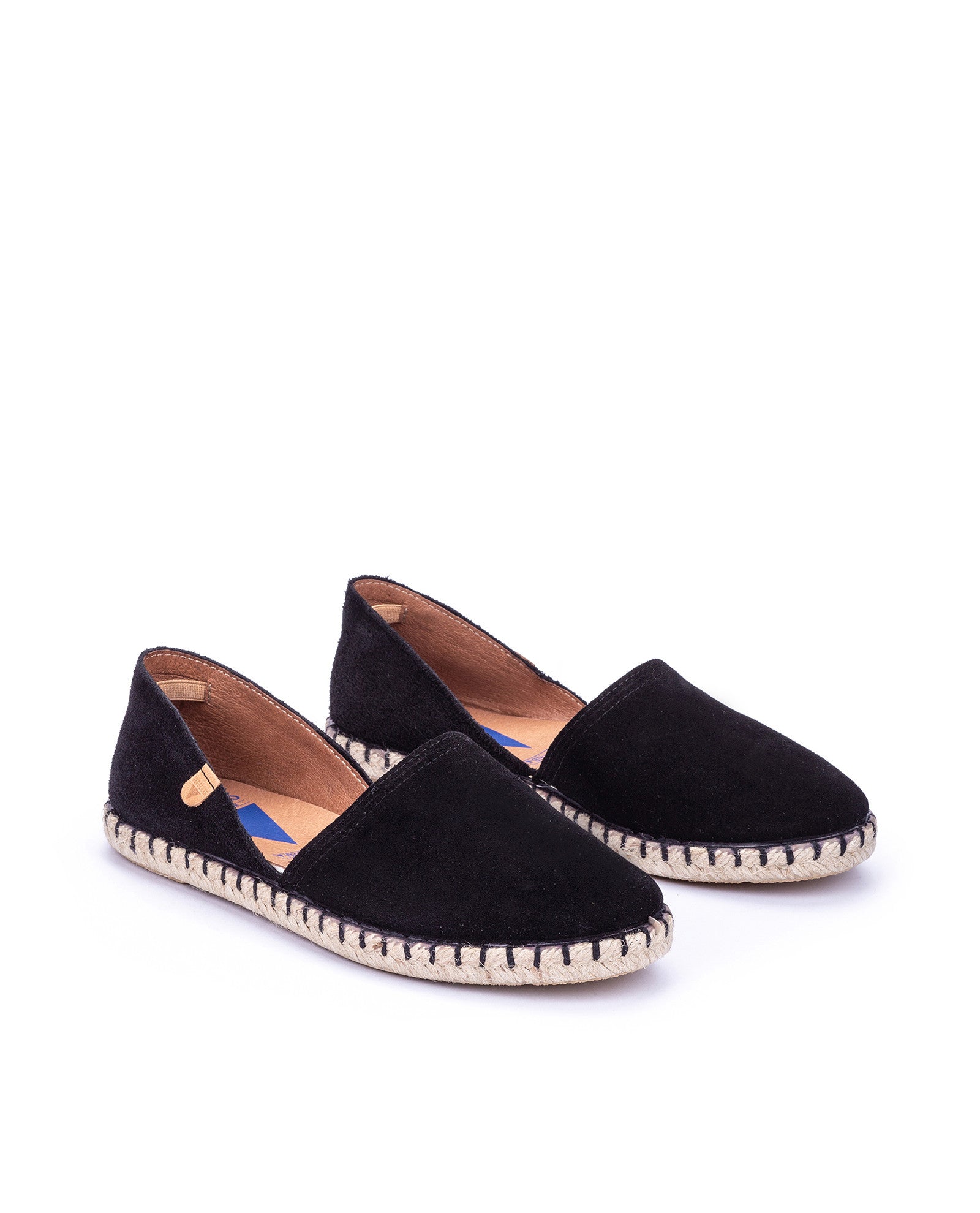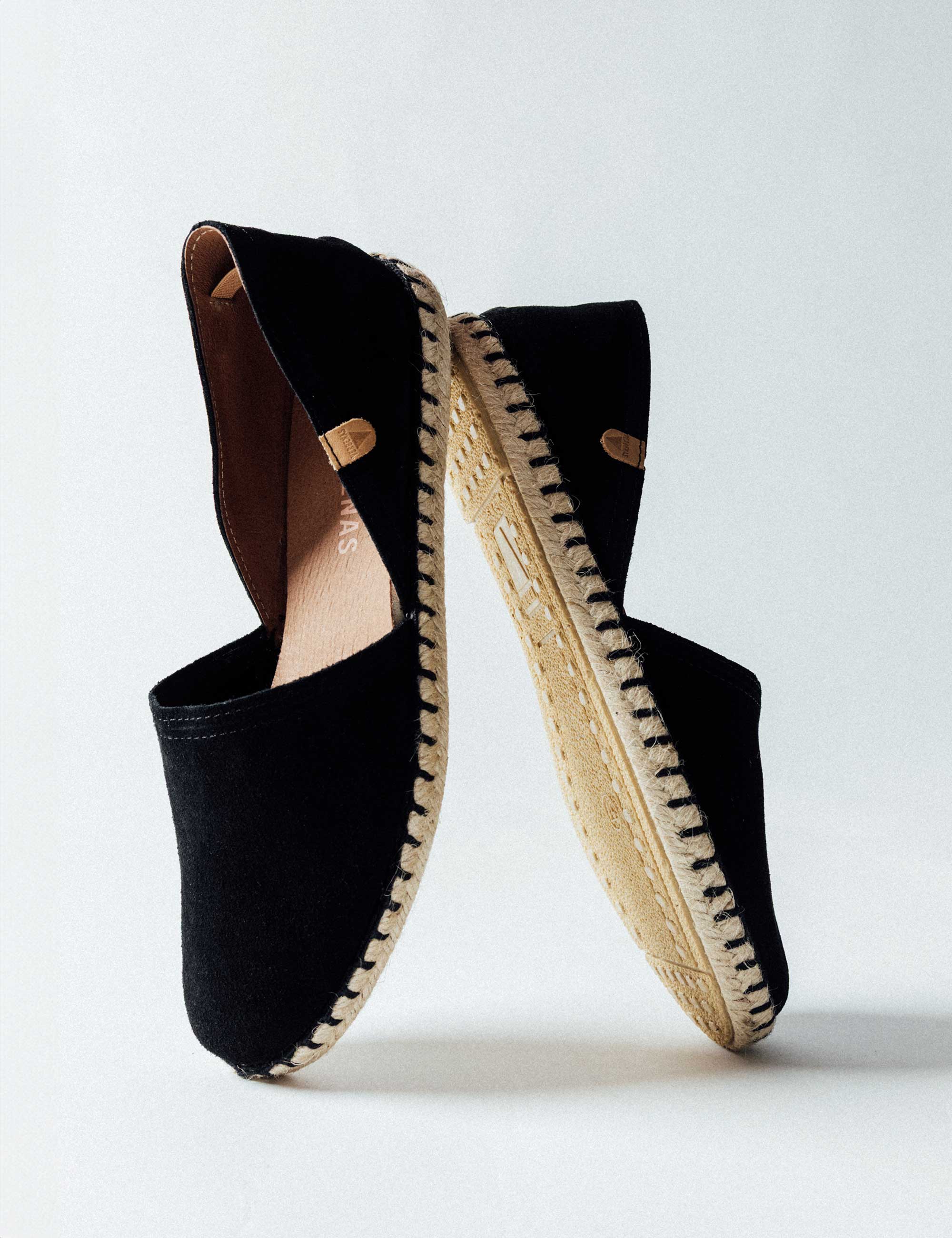 Carmen Serraje flache Espadrilles in schwarz. Hergestellt aus Wildleder, Futter und Sohle aus Leder, Jute und Gummisohle. Hergestellt in Spanien. Carmen ist die Ikone von Verbenas, eine Espadrille, die Zeit und Jahreszeiten überdauert. Mit seinem exklusiven Design, das Tradition und Moderne vereint, passt sich dieses Modell sowohl der Stadt als auch der Küste an und ist damit der perfekte Schuh für jede Gelegenheit. Inspiriert von den spanischen Wurzeln, erinnert sein Name an die Festlichkeit der Virgen del Carmen und die sommerlichen Verbenas.