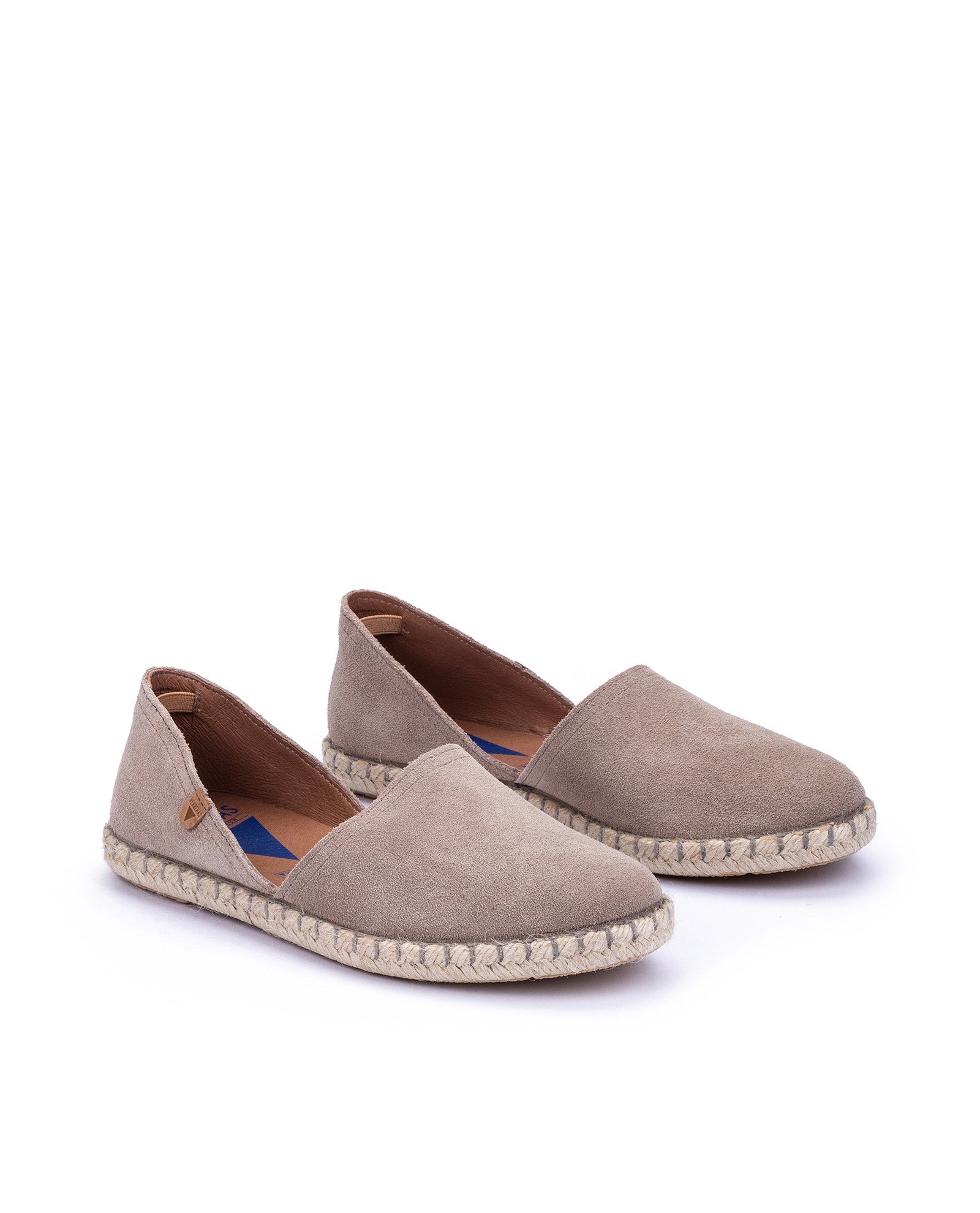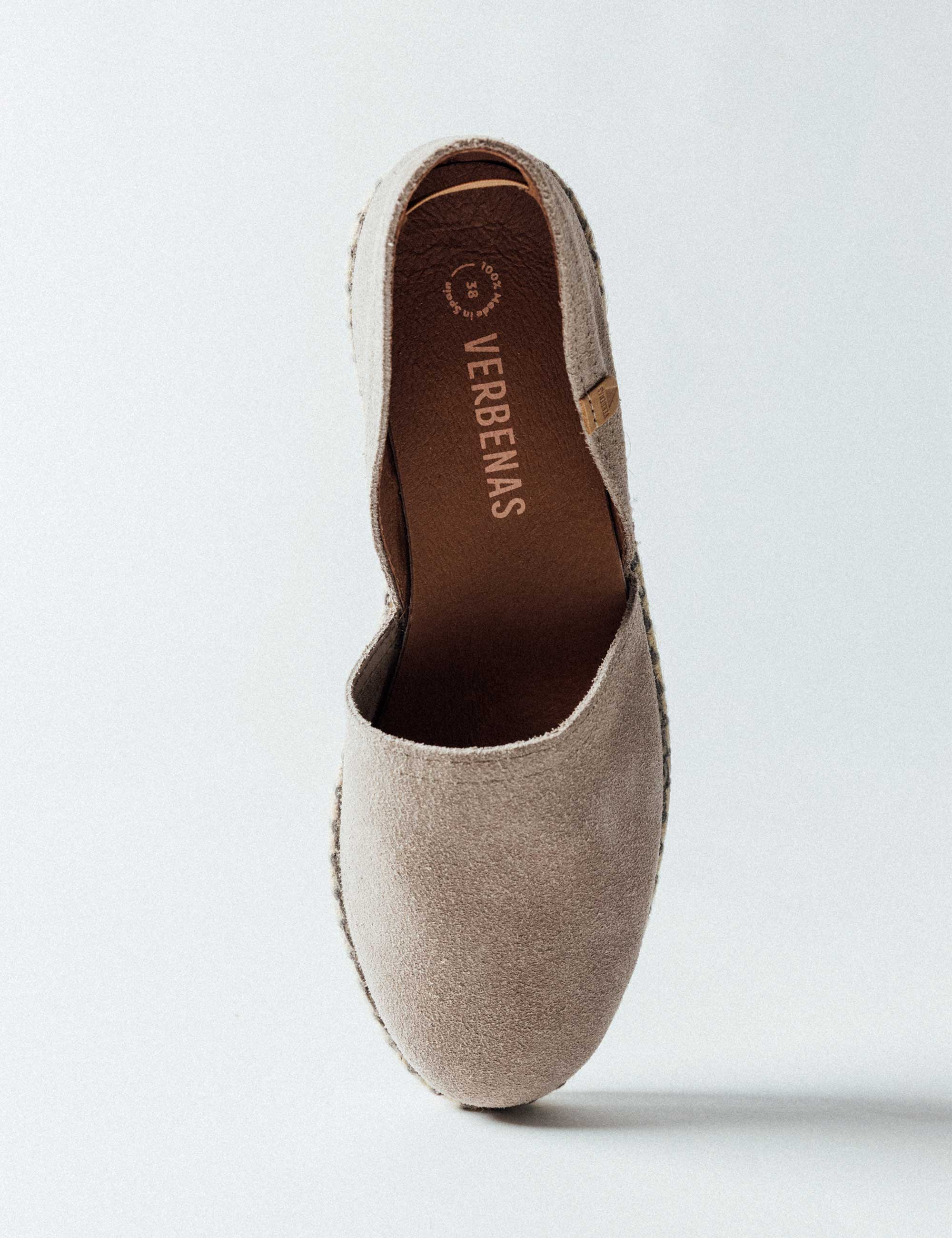 Flache Espadrilles von Carmen Serraje in der Farbe Stein. Hergestellt aus geteiltem Wildleder, Futter und Sohle aus Leder, Jute und Gummisohle. Hergestellt in Spanien. Carmen ist die Ikone von Verbenas, eine Espadrille, die Zeit und Jahreszeiten überdauert. Mit ihrem exklusiven Design, das Tradition und Moderne vereint, passt sich dieses Modell sowohl der Stadt als auch der Küste an und ist damit der perfekte Schuh für jede Gelegenheit. Inspiriert von den spanischen Wurzeln, erinnert sein Name an die Festlichkeit der Virgen del Carmen und die sommerlichen Verbenas.