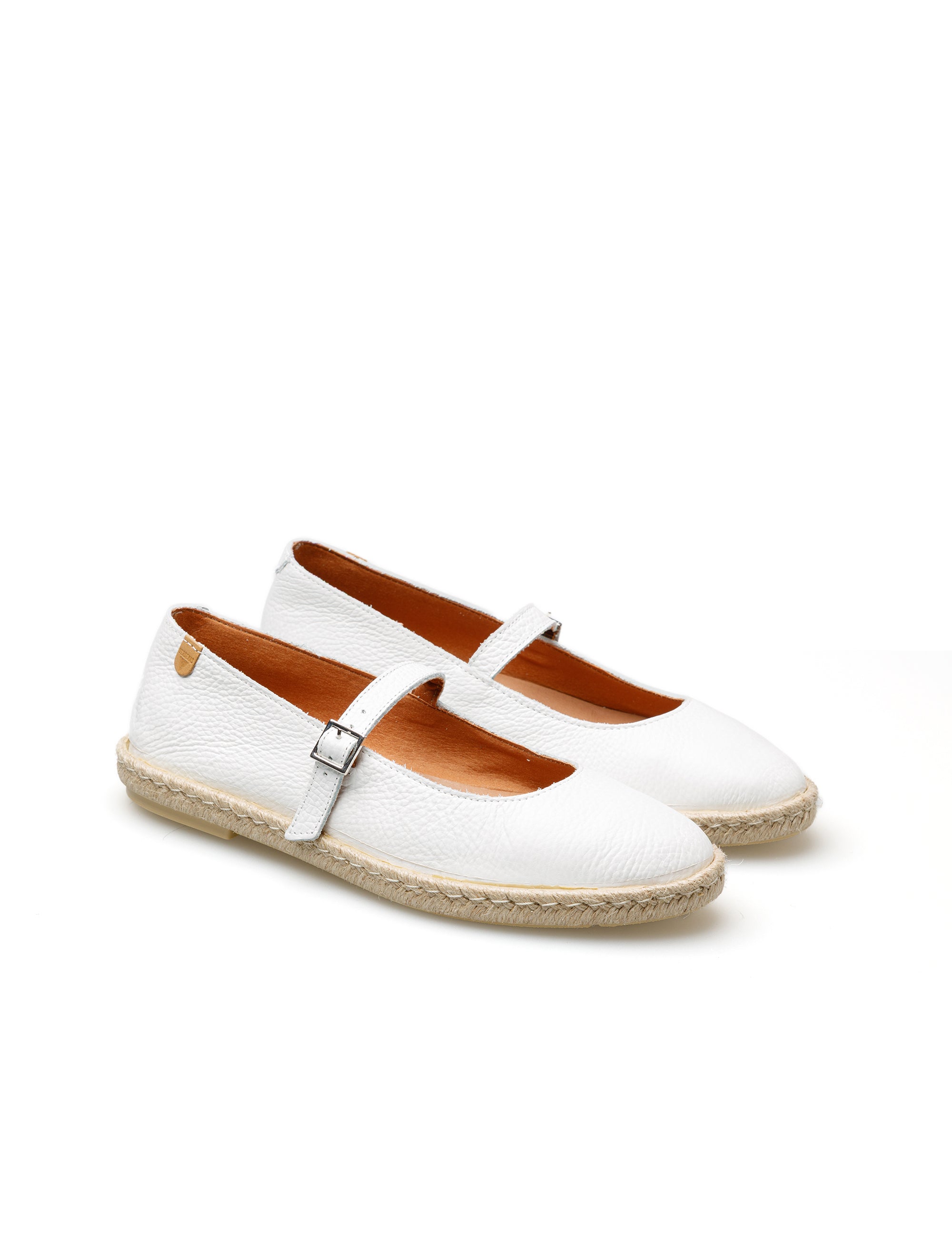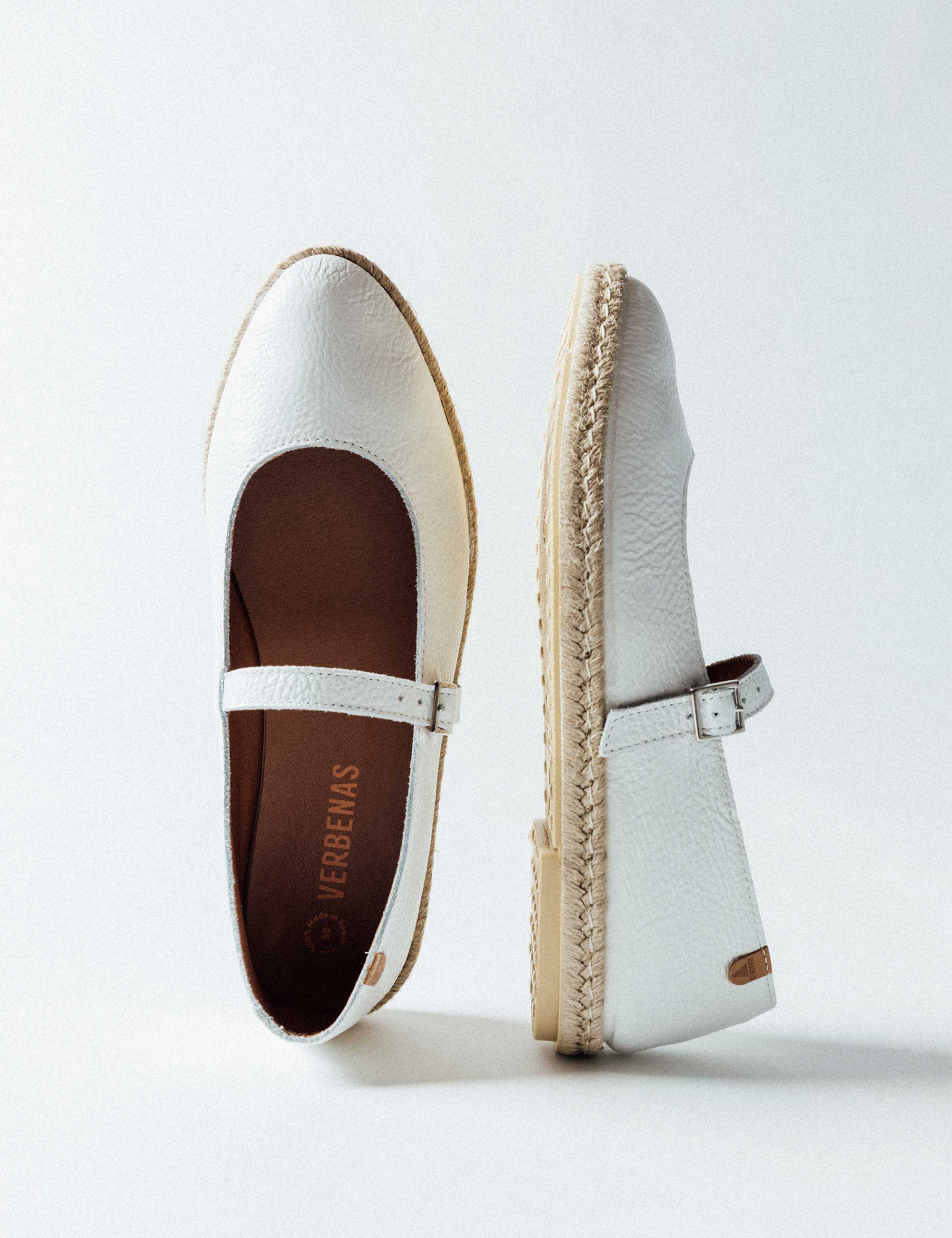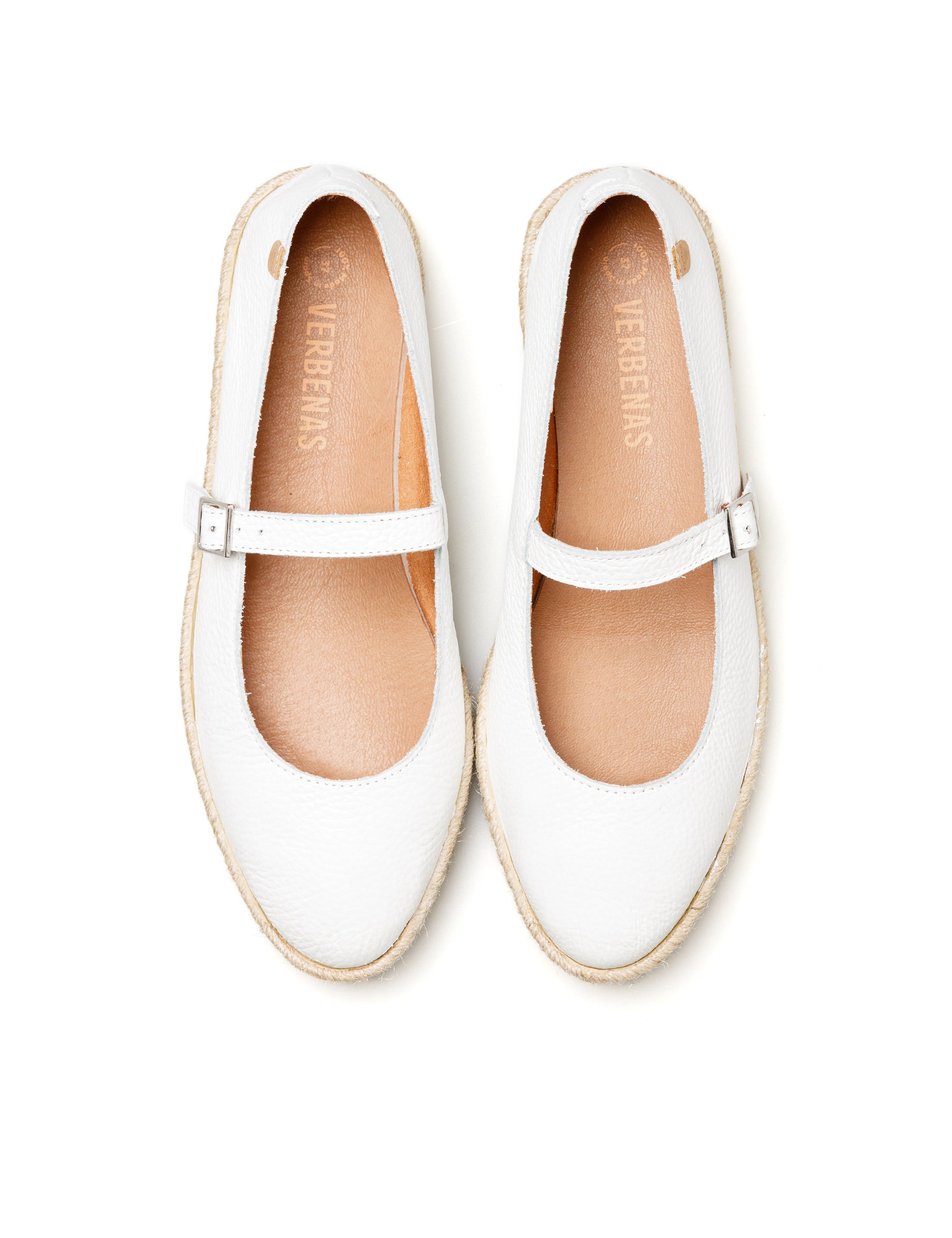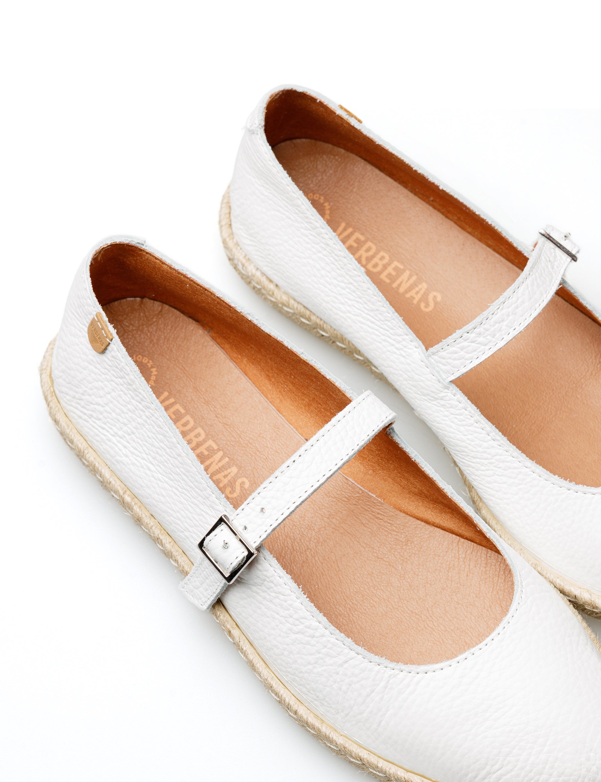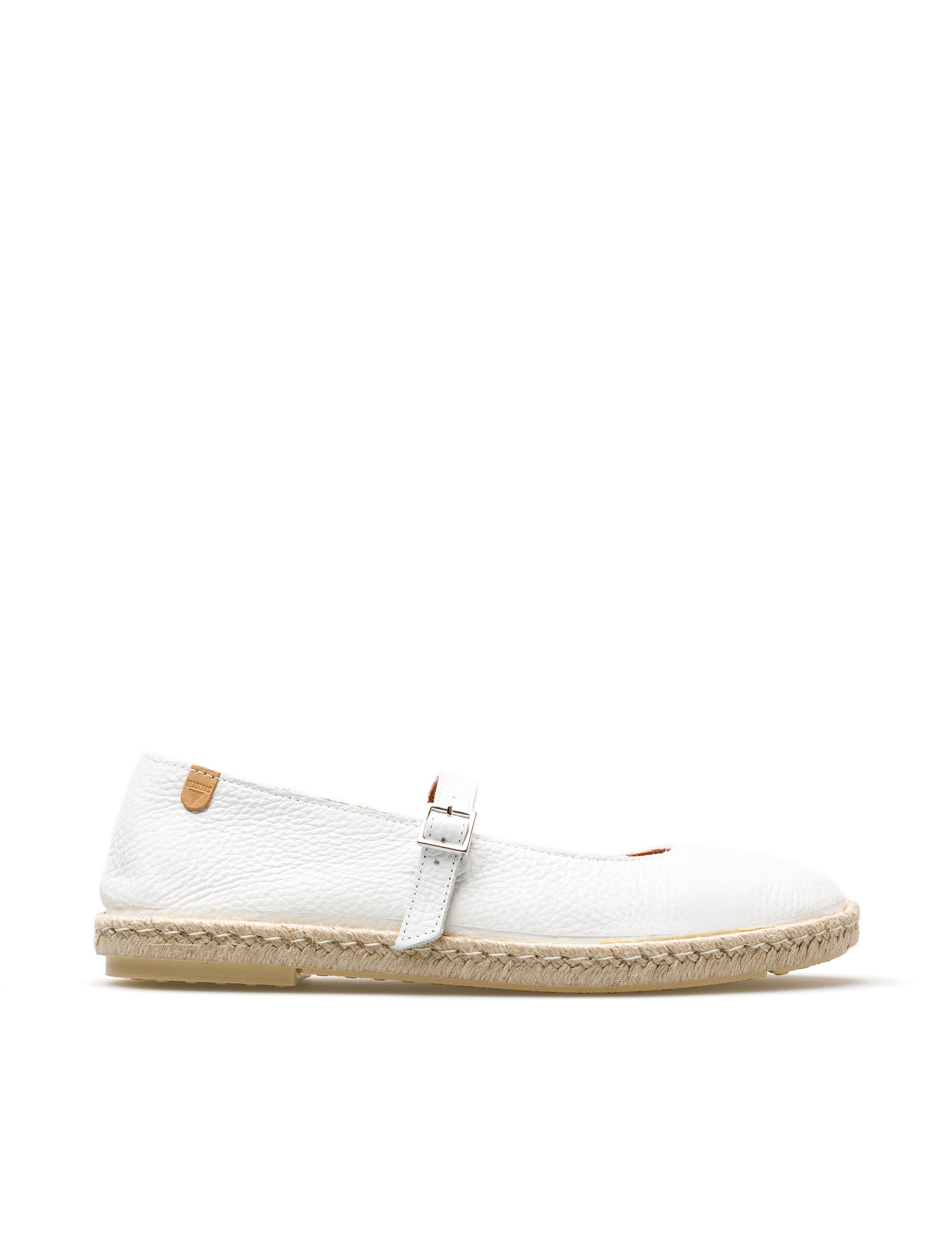 Flache Espadrilles Kendra Núcleo in Weiß. Hergestellt aus Nappaleder, Futter und Sohle aus Leder, Jute und Gummisohle. Hergestellt in Spanien. Kendra ist eine moderne Neuerfindung der klassischen Mary-Jane-Silhouette, die aktuelle Trends mit Frische und mediterranem Geist verbindet. Sein elegantes und vielseitiges Design passt sich fließend an den urbanen Rhythmus an und bewahrt gleichzeitig die handwerkliche Seele, die unsere Schuhe auszeichnet.