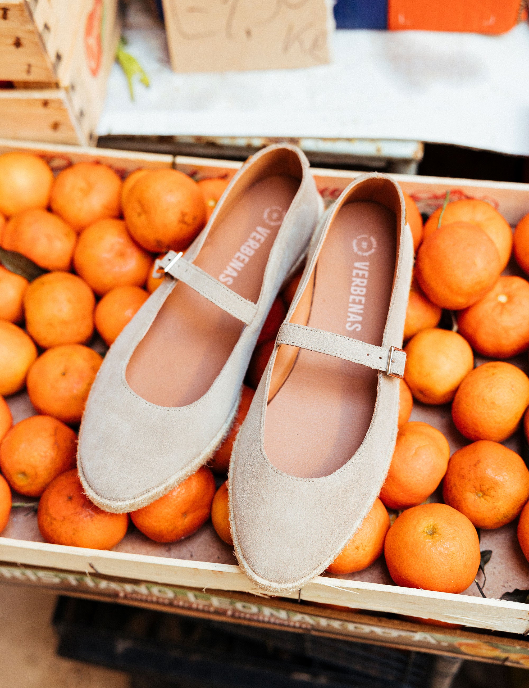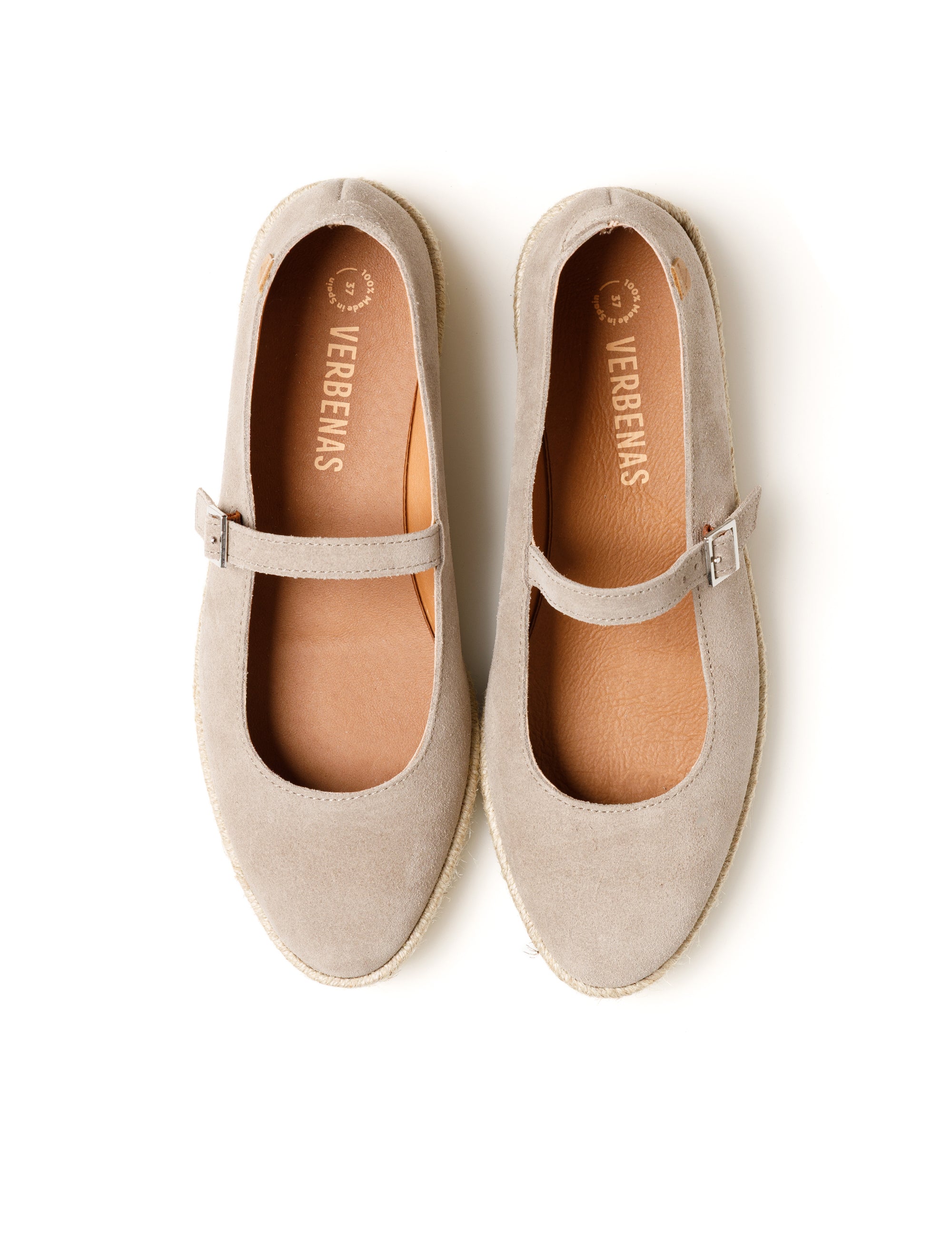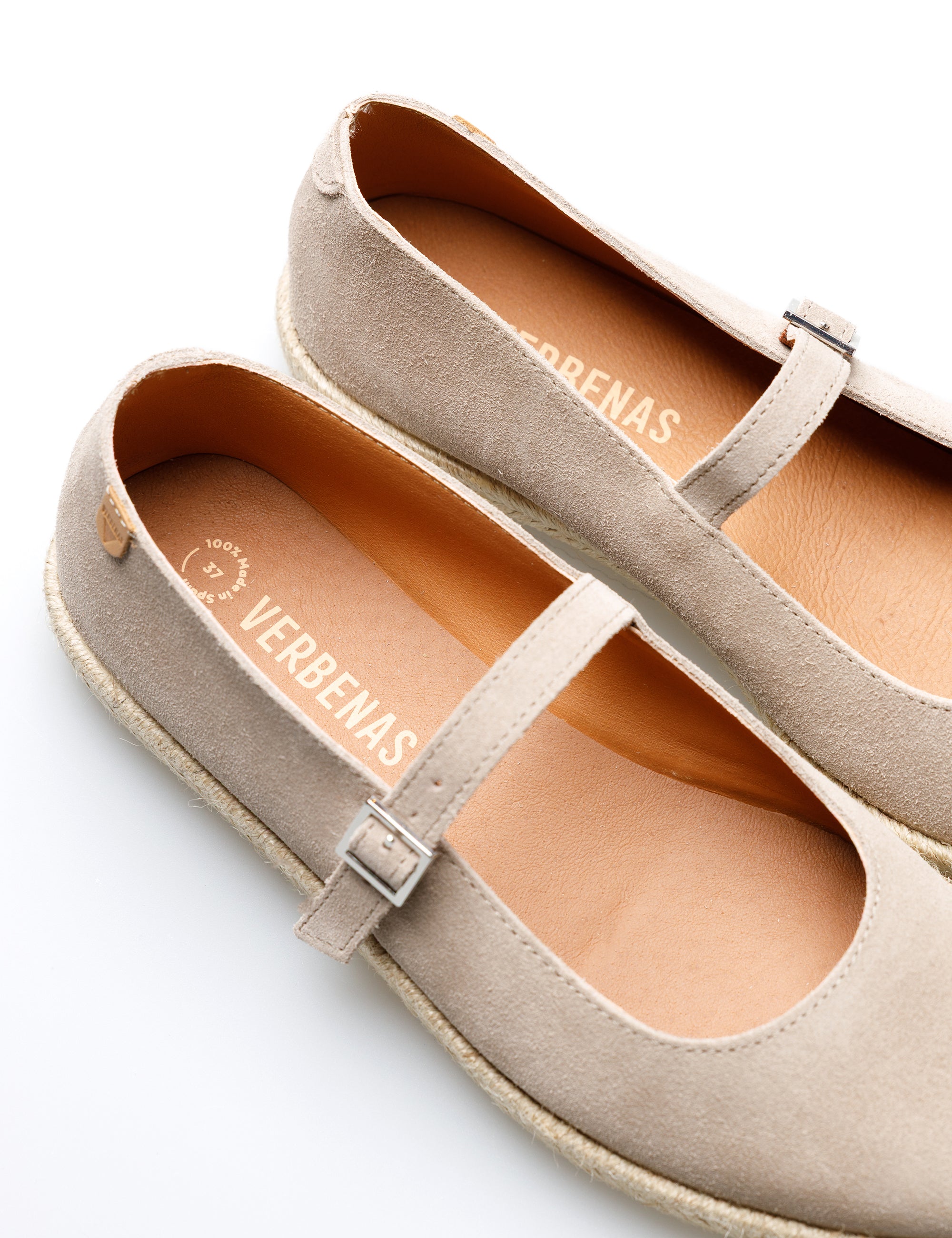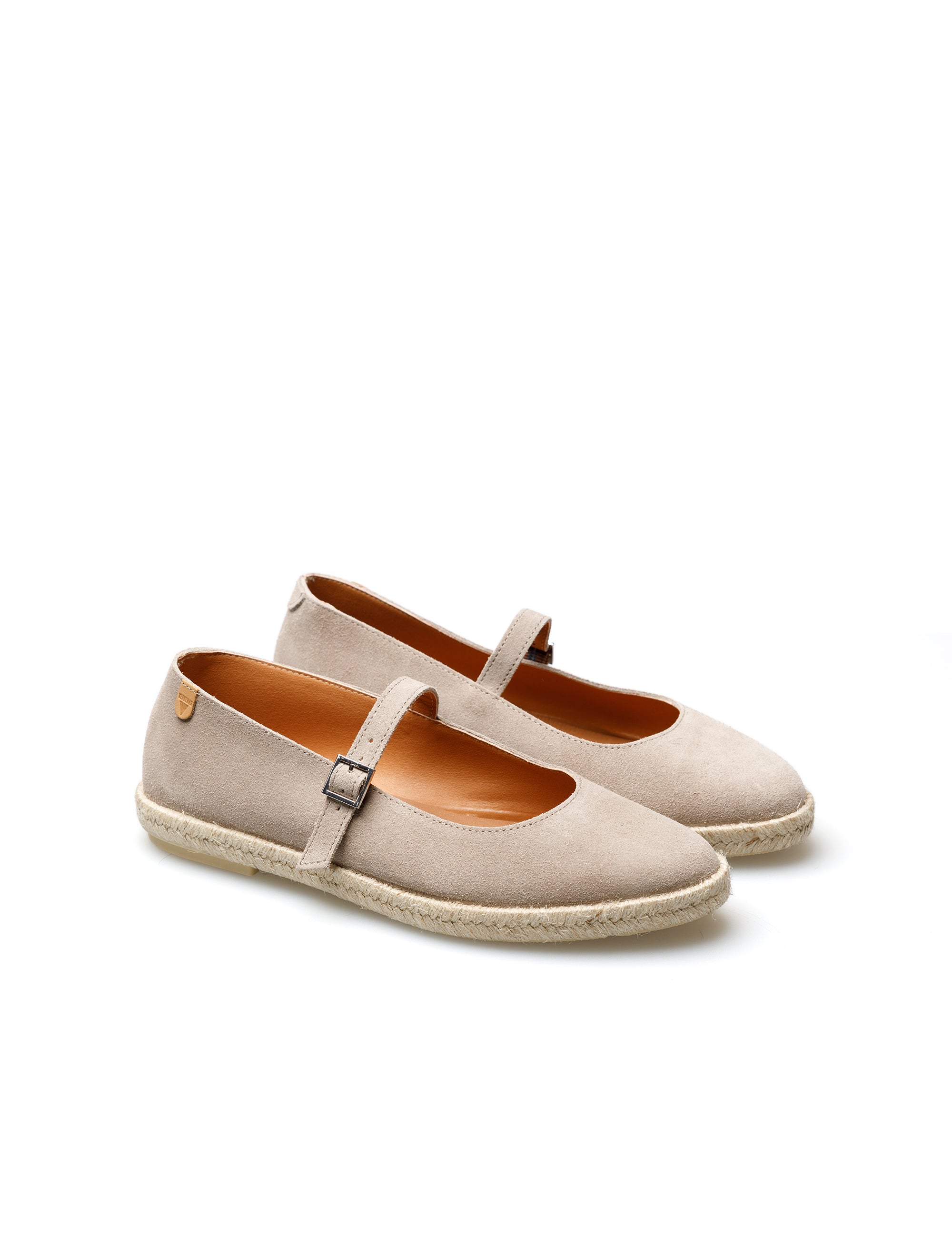 Flache Espadrilles Kendra Serraje in Steinfarbe. Hergestellt aus geteiltem Wildleder, Futter und Sohle aus Leder, Jute und Gummisohle, hergestellt in Spanien. Kendra ist eine moderne Neuerfindung der klassischen Mary-Jane-Silhouette, die aktuelle Trends mit Frische und mediterranem Geist verbindet. Sein elegantes und vielseitiges Design passt sich fließend an den urbanen Rhythmus an und bewahrt gleichzeitig die handwerkliche Seele, die unsere Schuhe auszeichnet.