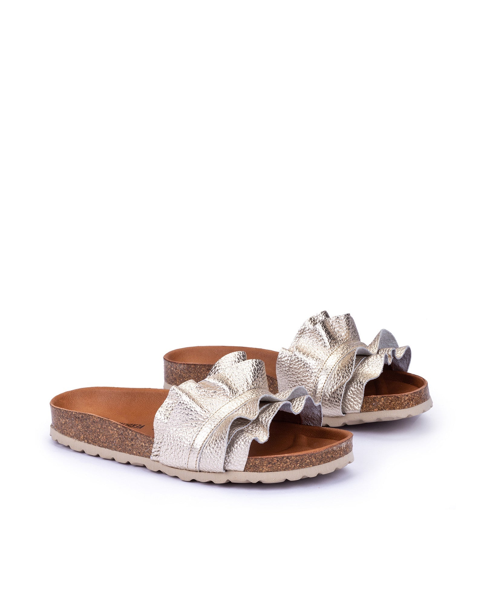 Rocio Nucleo Metal Volante Sandalen in Gold. Hergestellt aus Nappaleder mit eingravierter Metallstruktur, Futter und Sohle aus Leder, Gummi- und Korksohle. Hergestellt in Spanien.Rocio ist die Ikone unserer Sandalenfamilie, ein Stück, das die Essenz von Verbenas mit einem einfachen, aber charaktervollen Design repräsentiert. Inspiriert von zeitgenössischen Trends, zeichnet sich diese Sandale durch ihre doppelte Rüsche aus, ein Detail, das Bewegung, Frische und einen einzigartigen Stil mit sich bringt, der nicht unbemerkt bleibt.