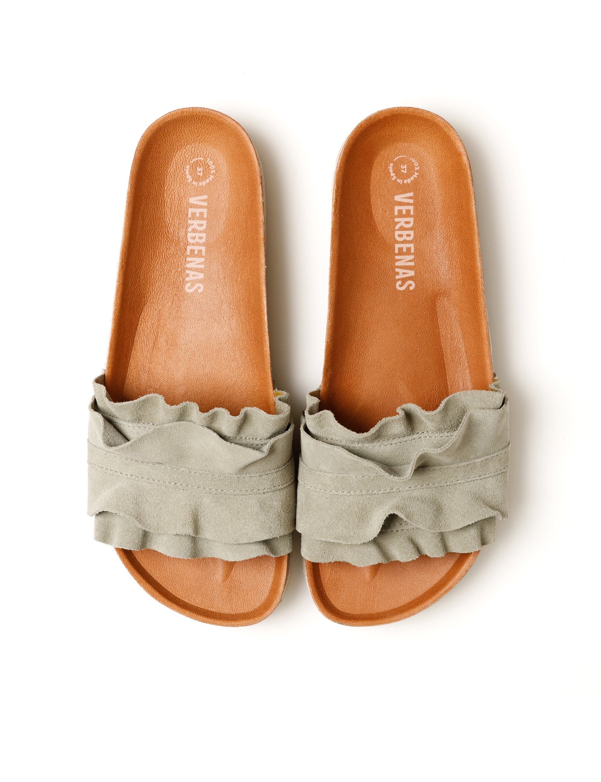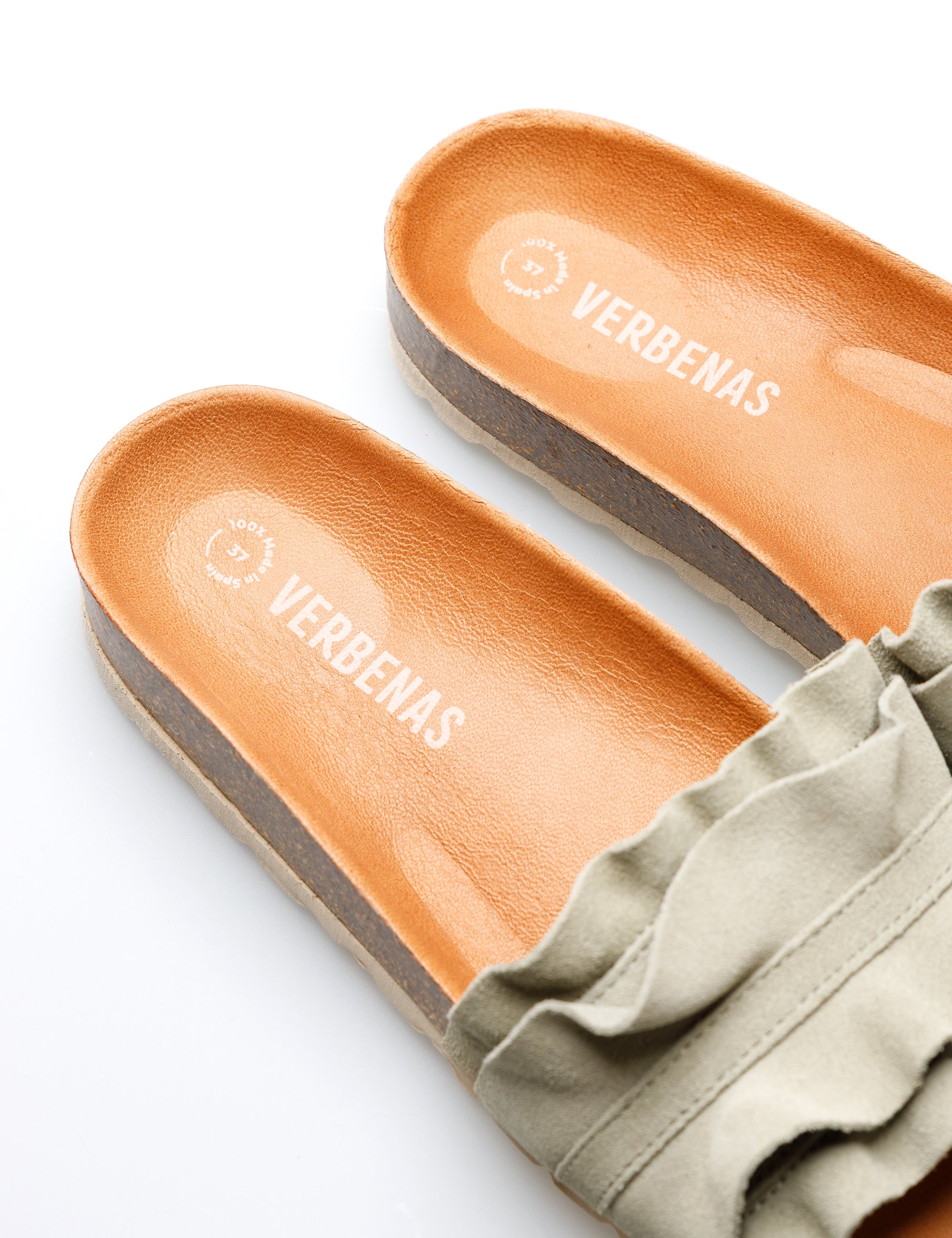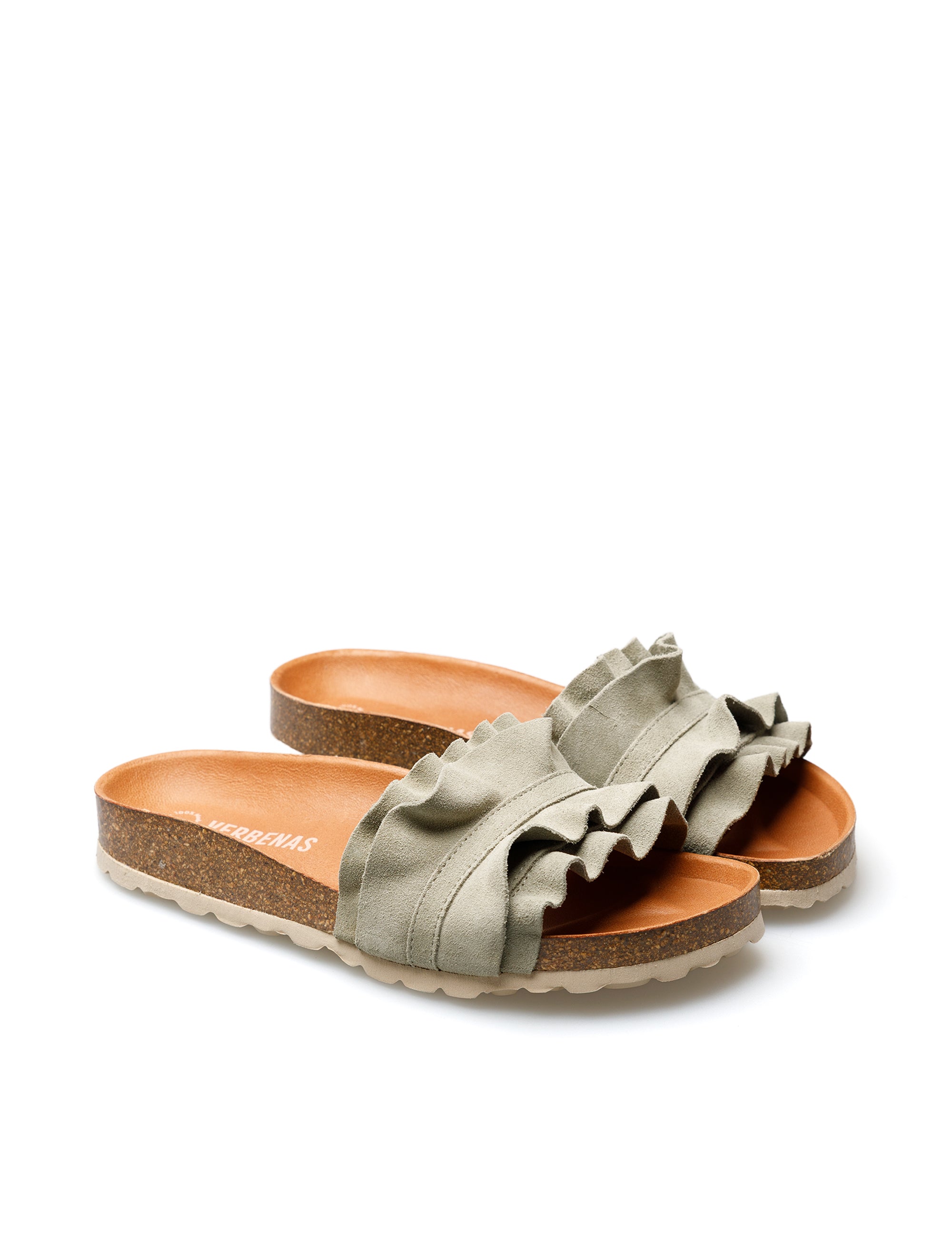 Rocio Serraje Volante Sandalen in der Farbe Bosco. Hergestellt aus Wildleder, Futter und Sohle aus Leder und Sohle aus Gummi und Kork. Hergestellt in Spanien.Rocio ist die Ikone unserer Sandalenfamilie, ein Stück, das die Essenz von Verbenas mit einem einfachen, aber charaktervollen Design repräsentiert. Inspiriert von zeitgenössischen Trends, zeichnet sich diese Sandale durch ihre doppelte Rüsche aus, ein Detail, das Bewegung, Frische und einen einzigartigen Stil mit sich bringt, der nicht unbemerkt bleibt.