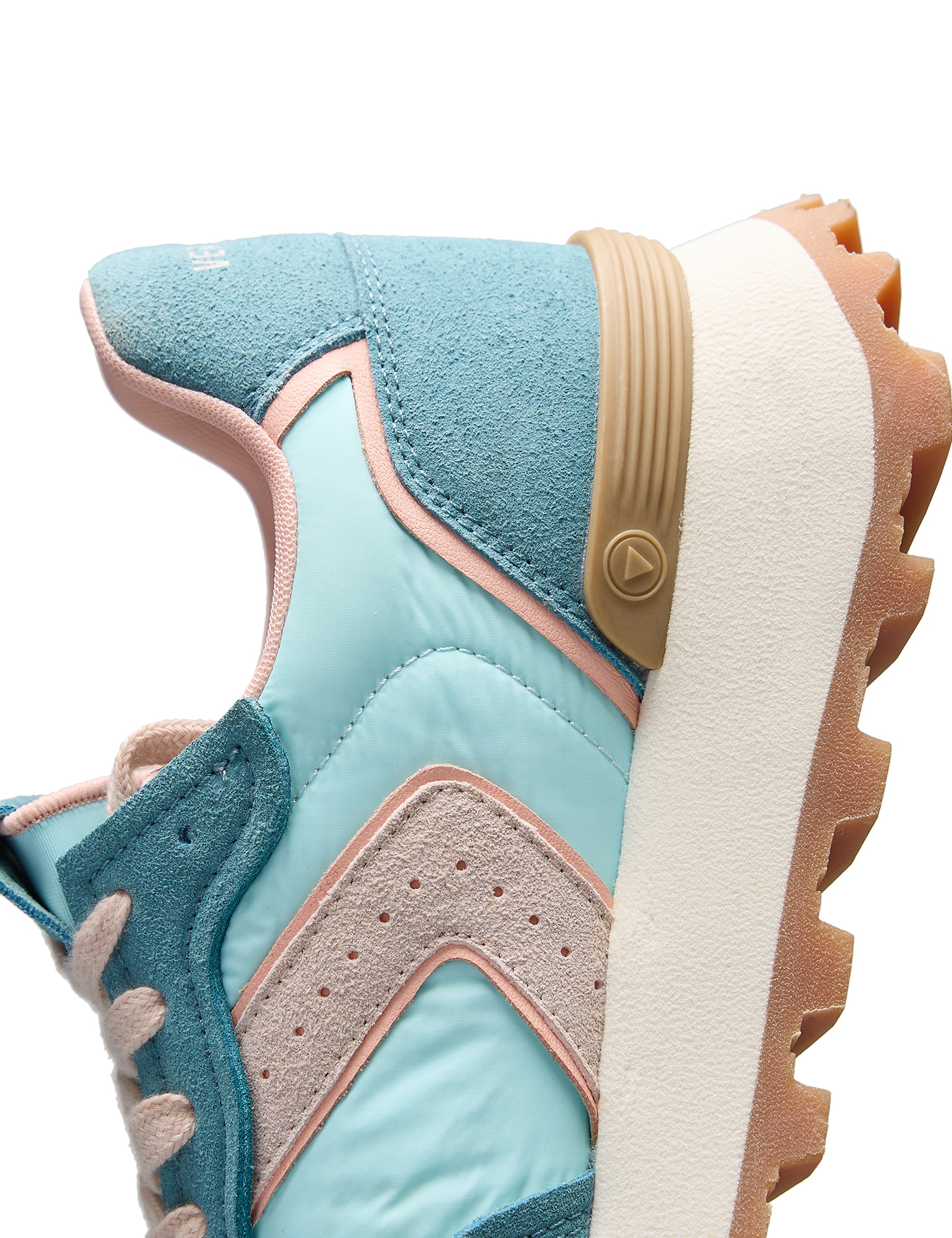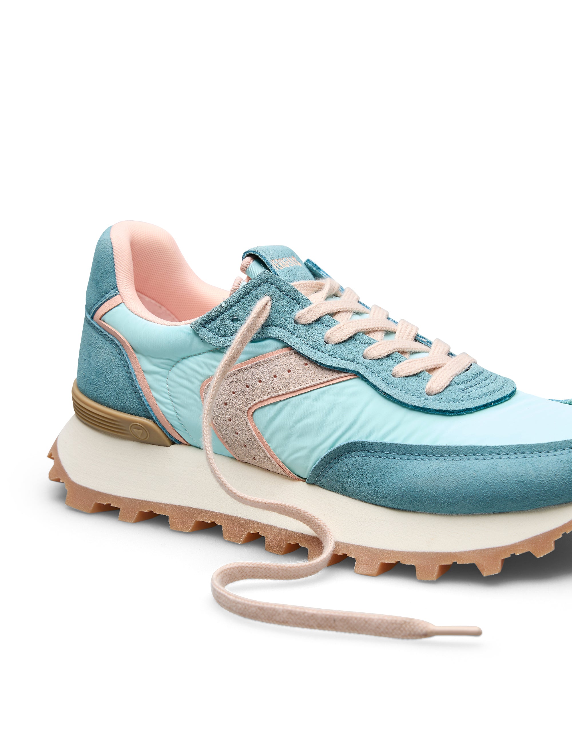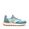 Sneakers Clodette Tessali Aqua-Blush. Hergestellt aus technischem Nylongewebe und weichem Spaltleder in den Farben Aqua-Blau. Mit gepolstertem Innenfutter, atmungsaktiver, flexibler und bequemer Sohle, die den Fuß abfedert, elastischem Neopren-Einsatz und erhöhter EVA-Sohle für zusätzliche Höhe und Komfort.