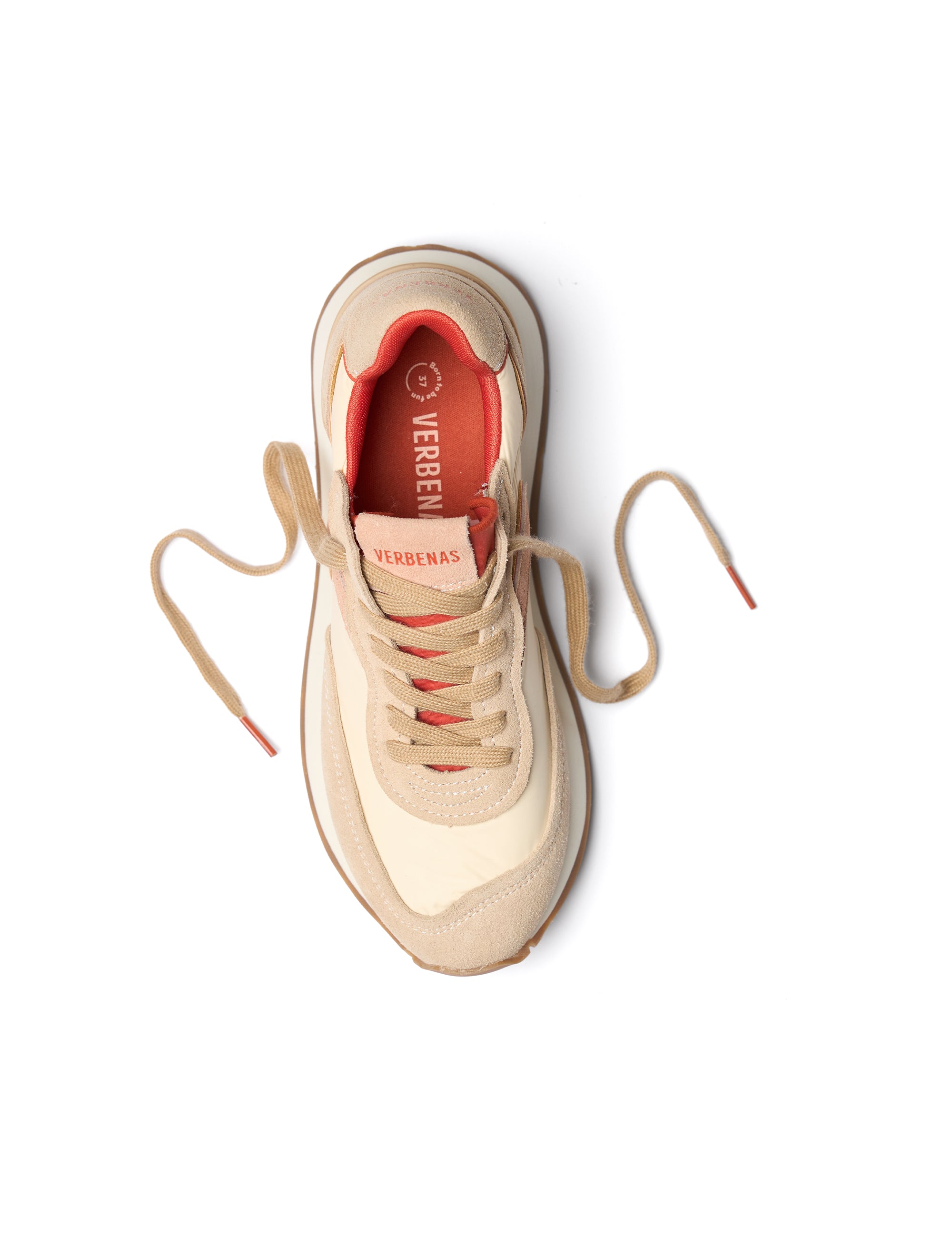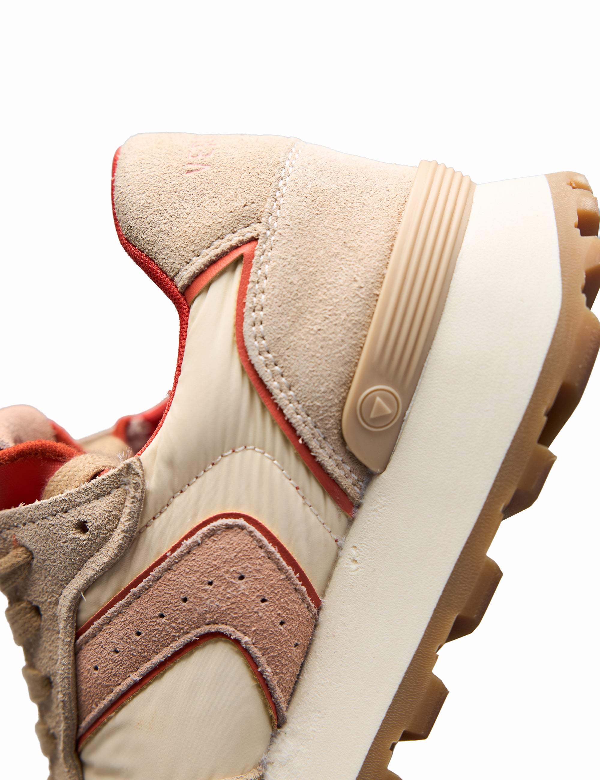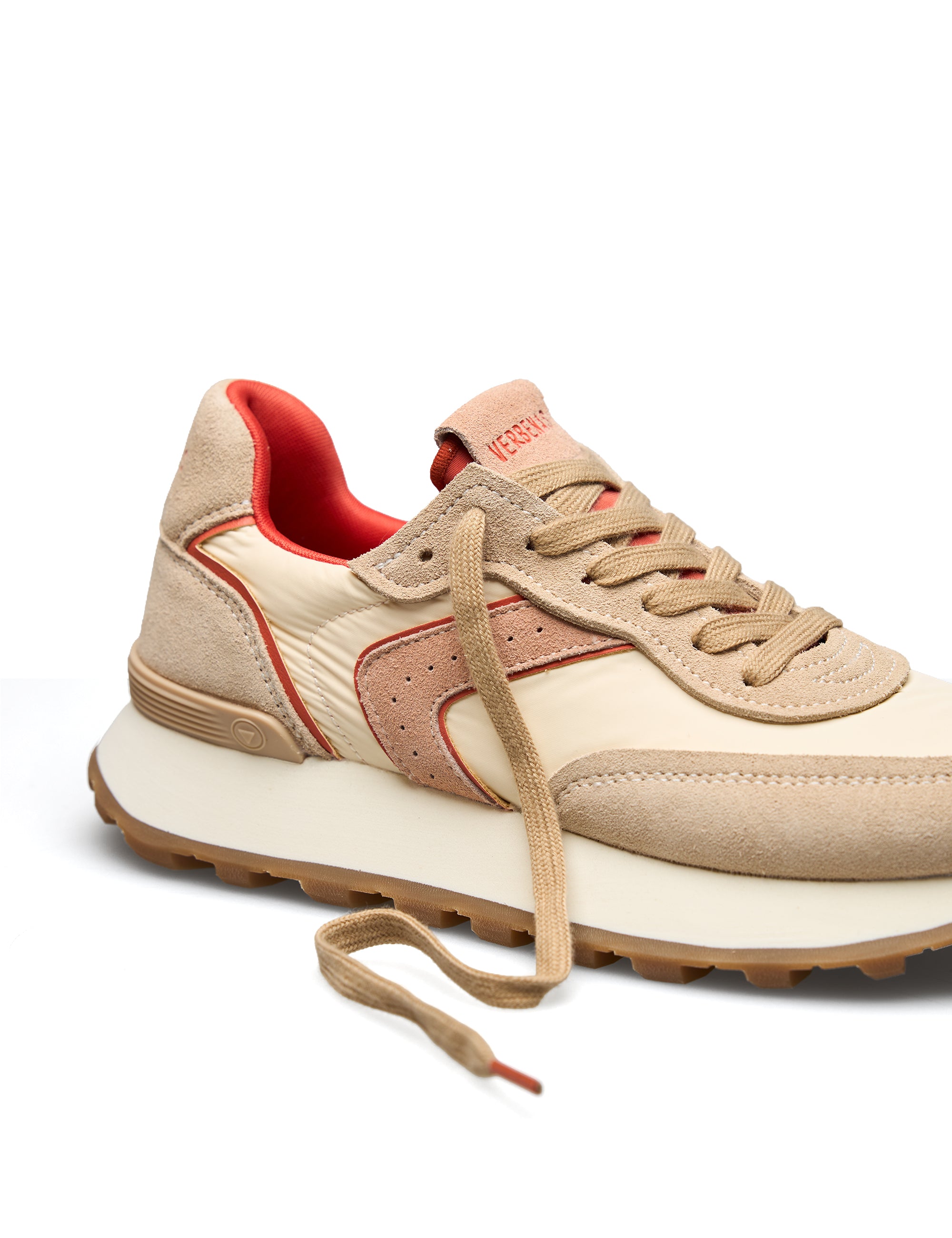 Sneakers Clodette Tessali Beig-Apricot. Hergestellt aus technischem Nylongewebe und weichem Spaltleder in den Farben Beige und Pfirsich. Mit gepolstertem Innenfutter, atmungsaktiver, flexibler und bequemer Sohle, die den Fuß abfedert, elastischem Neopren-Einsatz und erhöhter EVA-Sohle für zusätzliche Höhe und Komfort.