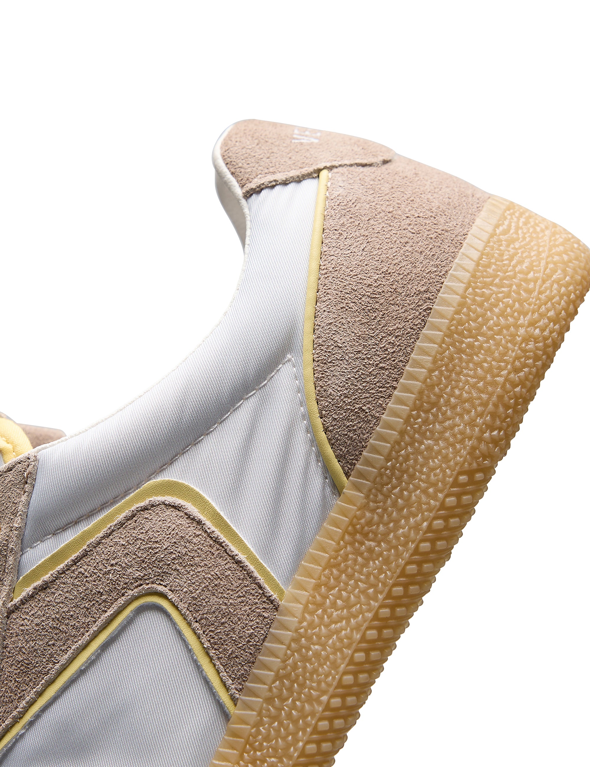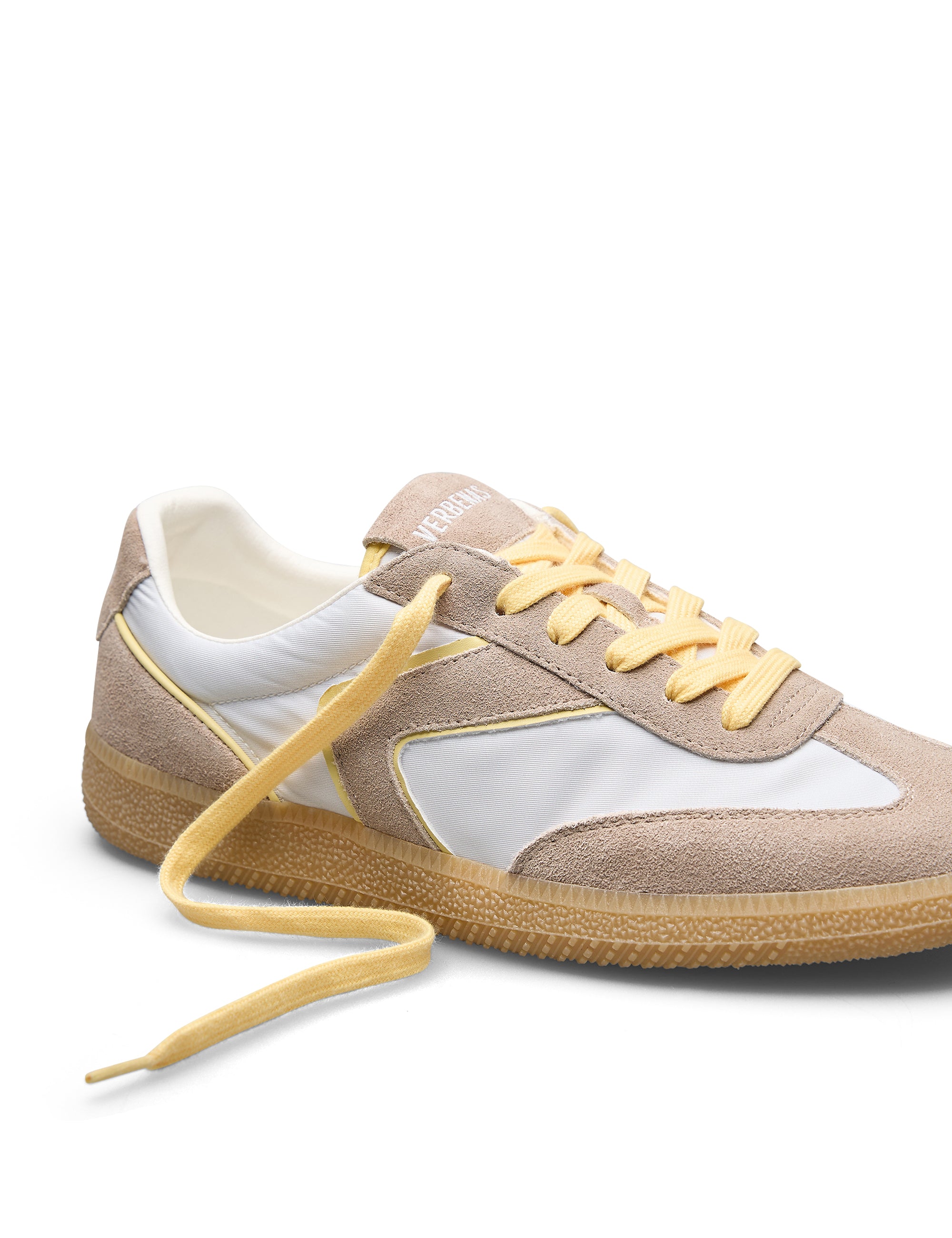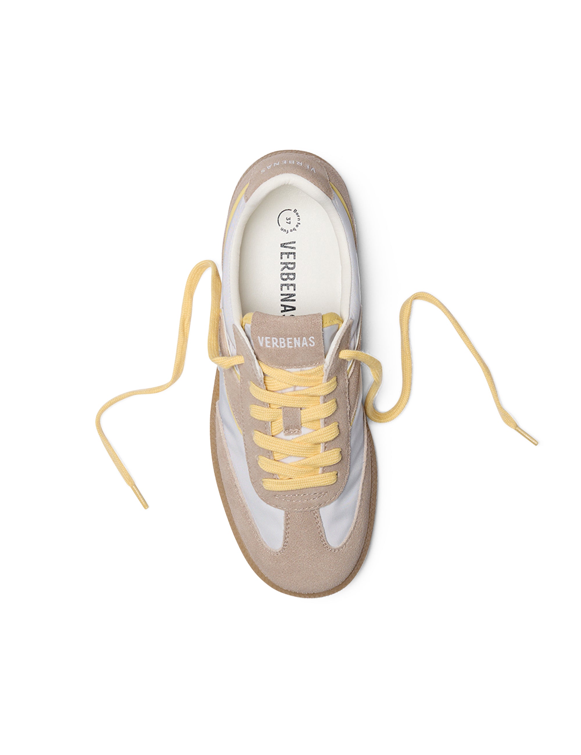 Sneakers Sound Tessali Sky-Brulee. Hergestellt aus technischem Nylongewebe und weichem Spaltleder in Himmelblau und Gelb. Mit gepolstertem Innenfutter, atmungsaktiver, flexibler und bequemer Sohle, die Stöße absorbiert, und Naturkautschuksohle. Wir präsentieren die Sneaker-Kollektion Sound, bei der Retro zu einer Lebenseinstellung wird. Designs mit unverwechselbaren Details und charakteristischen Silhouetten, die Authentizität und zeitlosen Stil vermitteln. Ein urbanes Statement, um den Vintage-Spirit mit einem modernen Look zu leben.