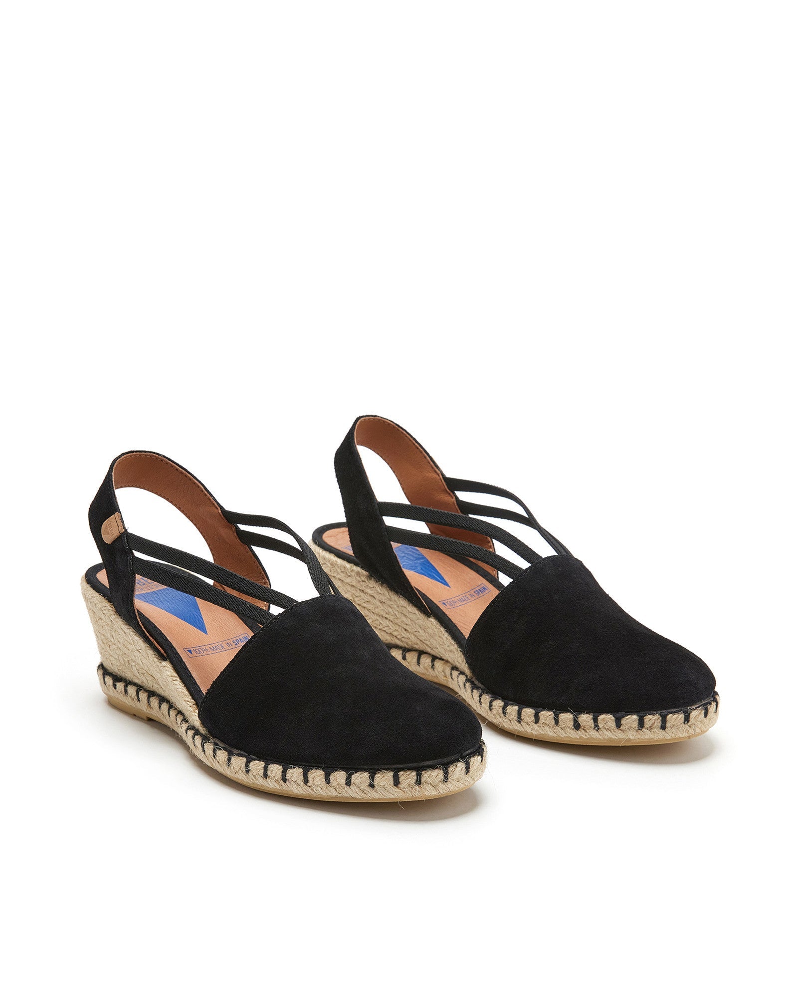 Espadrilles with wedge Maika Serraje in black. Made with suede material, leather lining and sole and jute and rubber sole. Wedge height 5.5 cm. Made in Spain. With an exclusive design that fuses tradition with modernity, this model adapts to both the city and themodel adapts to both the city and the coast, making it the perfect shoe for any occasion.any occasion. Its jute stitching and wedge connect with the roots of the sea and the land, while its natural material honours the legacy of the craftsmen.