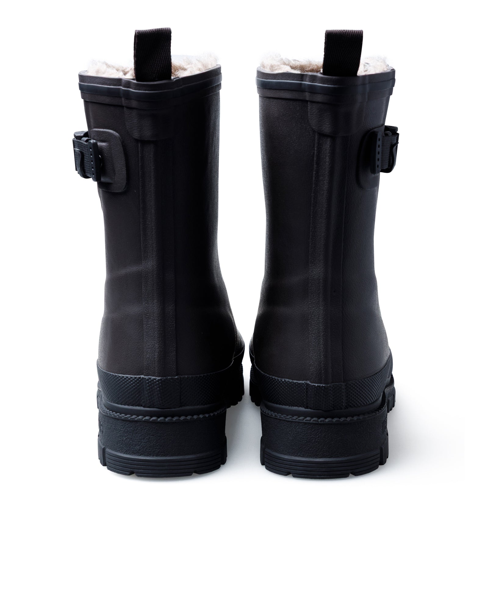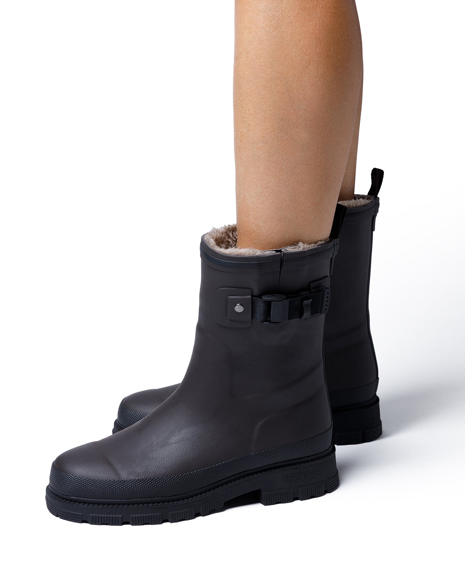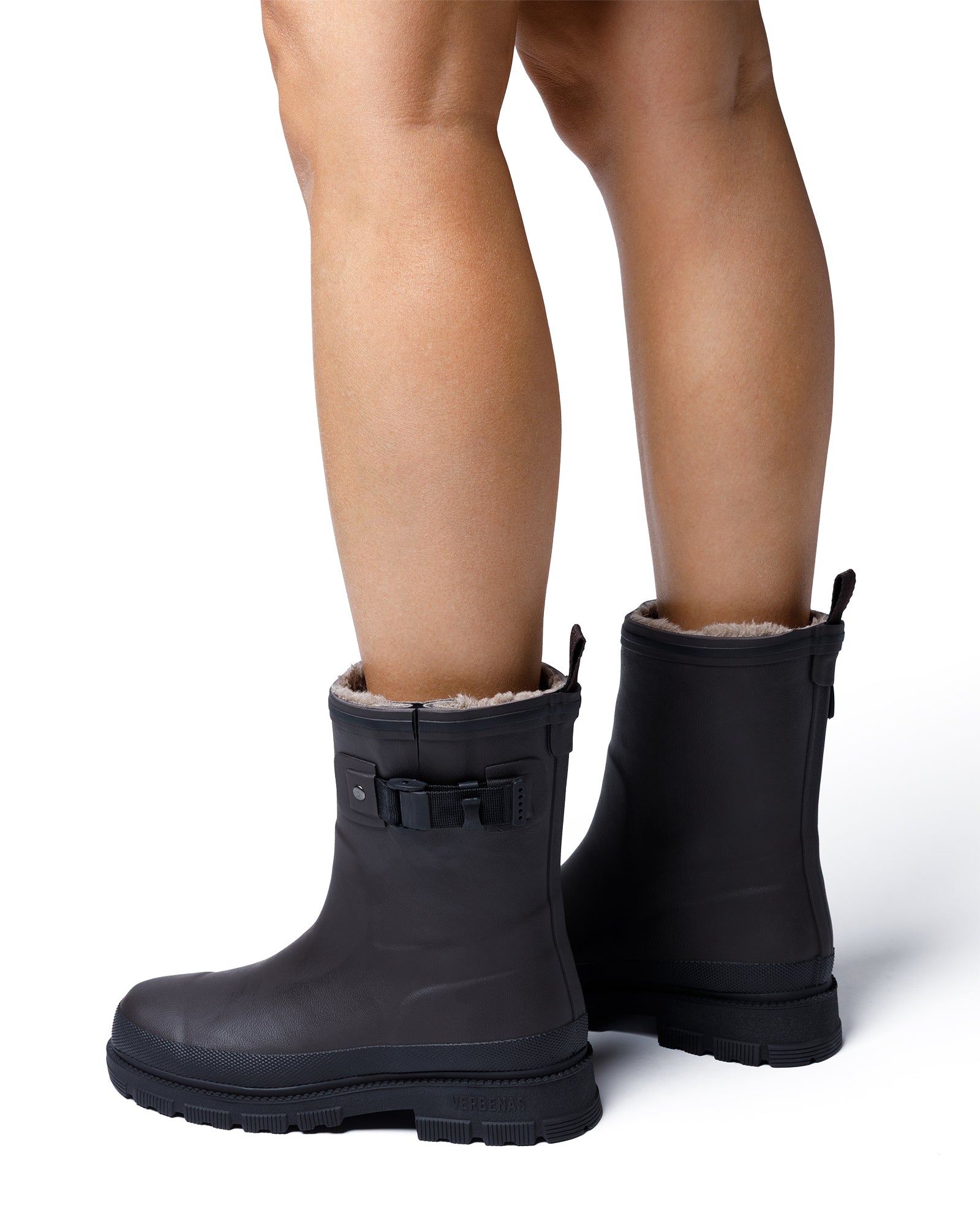 Lina Mate Combi Fur Brown Black Wellies. Made from brown natural rubber. Comfortable and warm thanks to their synthetic fur lining and EVA sole. Buckle details, elastic band and sole in the same black tone. Boot shaft height: 19 cm. The Verbenas universe expands with this versatile and unique design. Mid-calf silhouette, open top and decorative detail on the side. LINA is made of natural rubber, with a lightweight sole and wide fit, making it the perfect choice for those seeking warmth, comfort and style. Created for those who don't just walk the city... they reinterpret it.