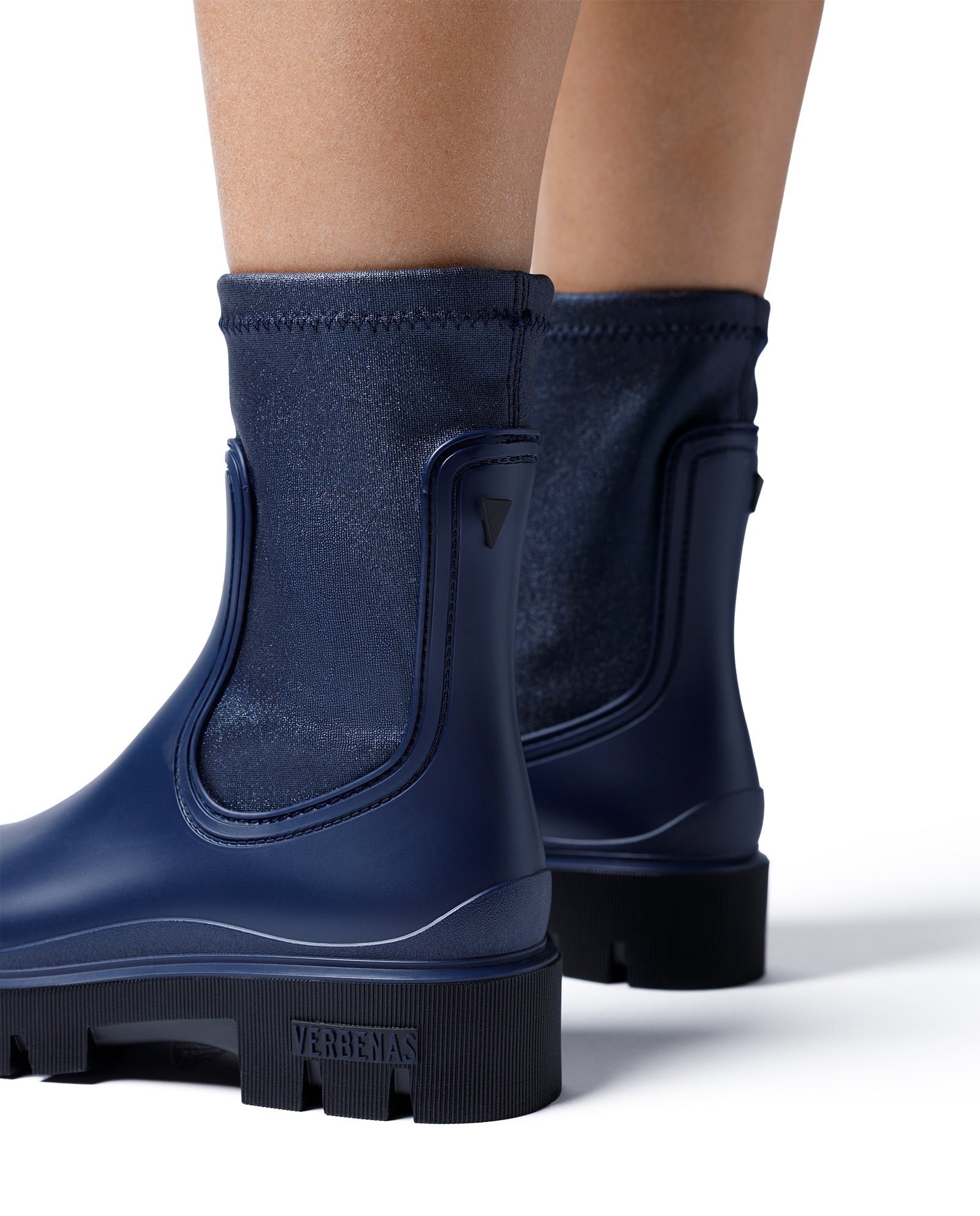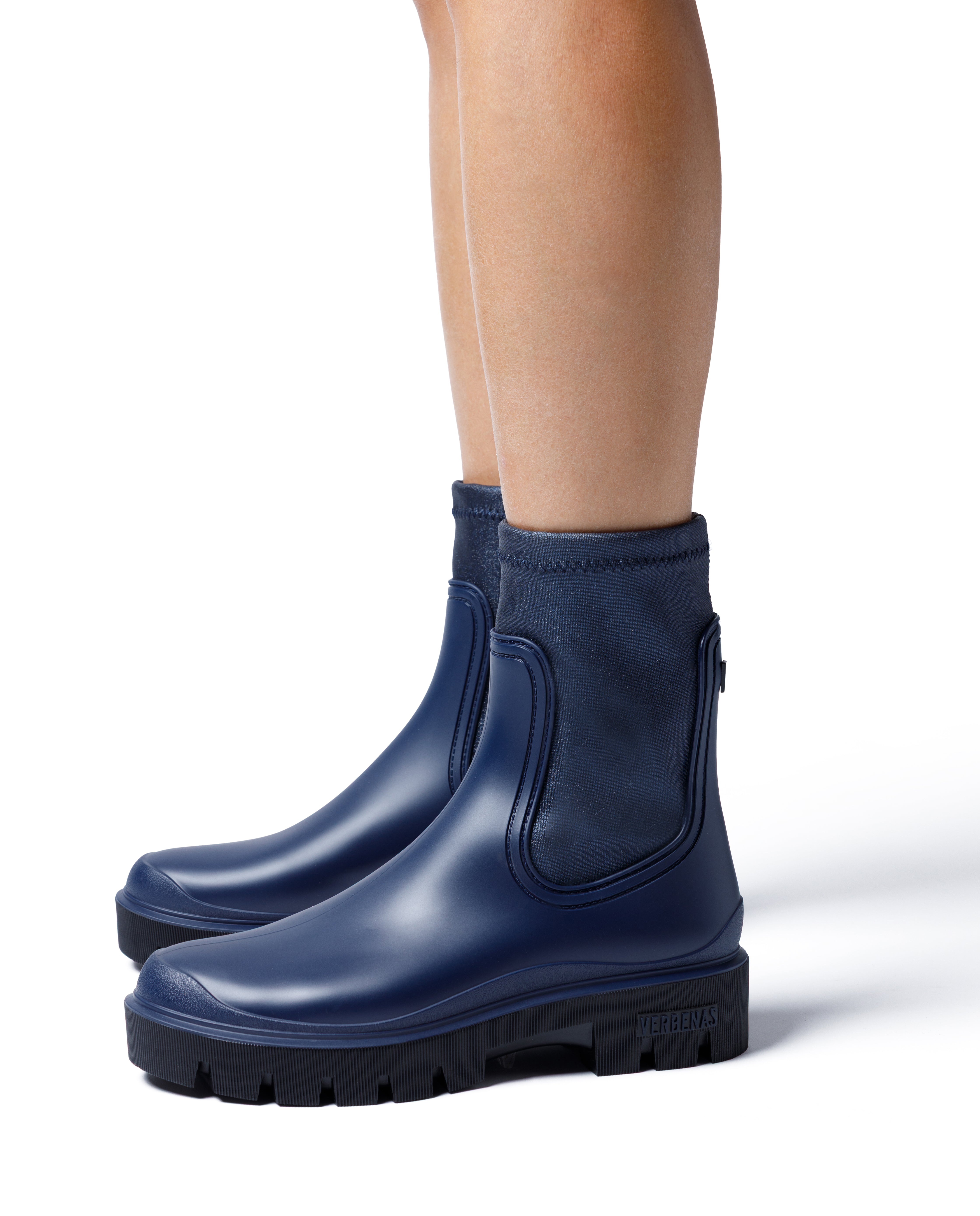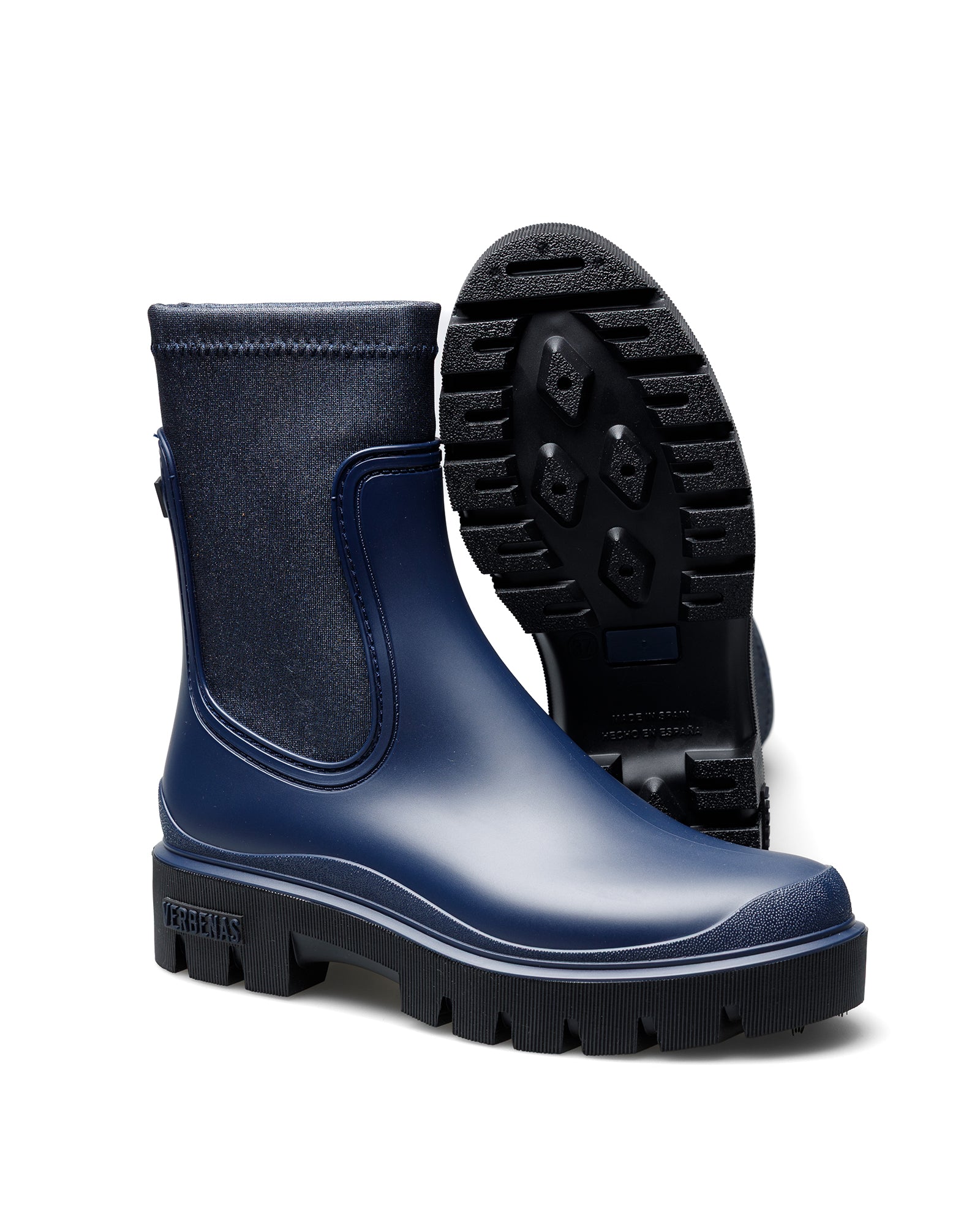 Muki Mate Galaxy Rain Boot in Navy. Made with synthetic upper, textile lining and insole and rubber sole. Boot shaft height: 18 cm. Made in Spain. The combination of track sole and high-shaft boot stands out. We present our collection inspired by the technical boot in its most chic version. Muki is ideal for those looking for a versatile and modern style with the functionality of a technical boot.