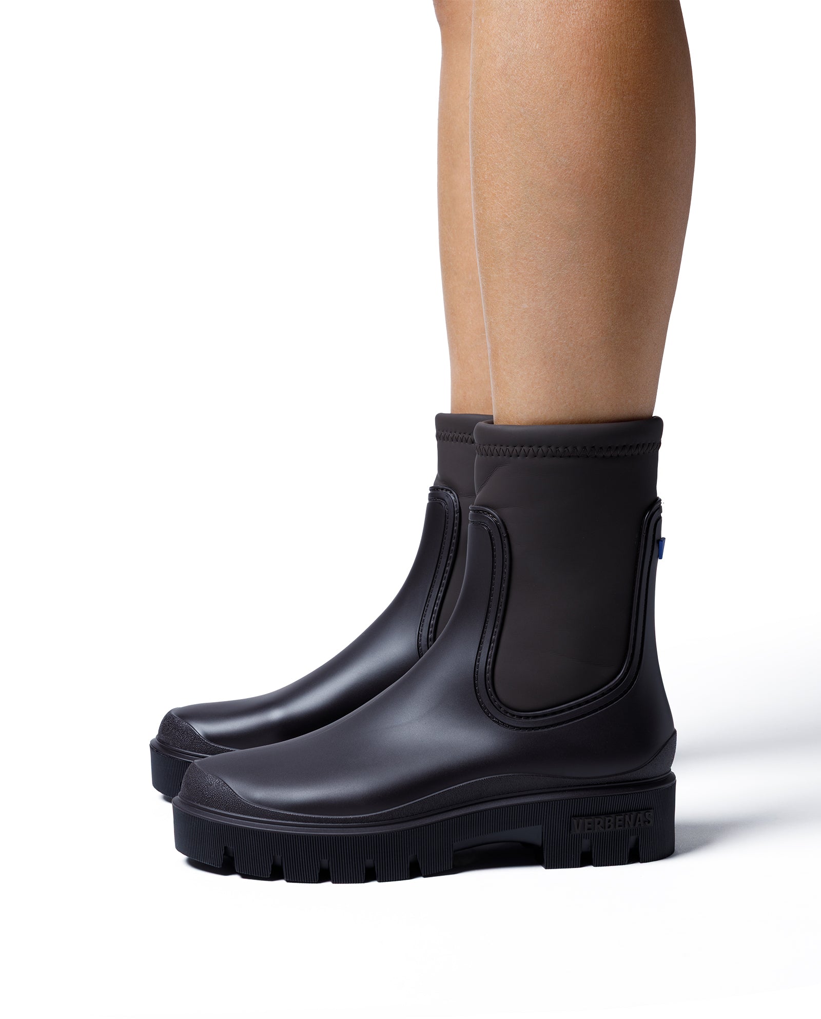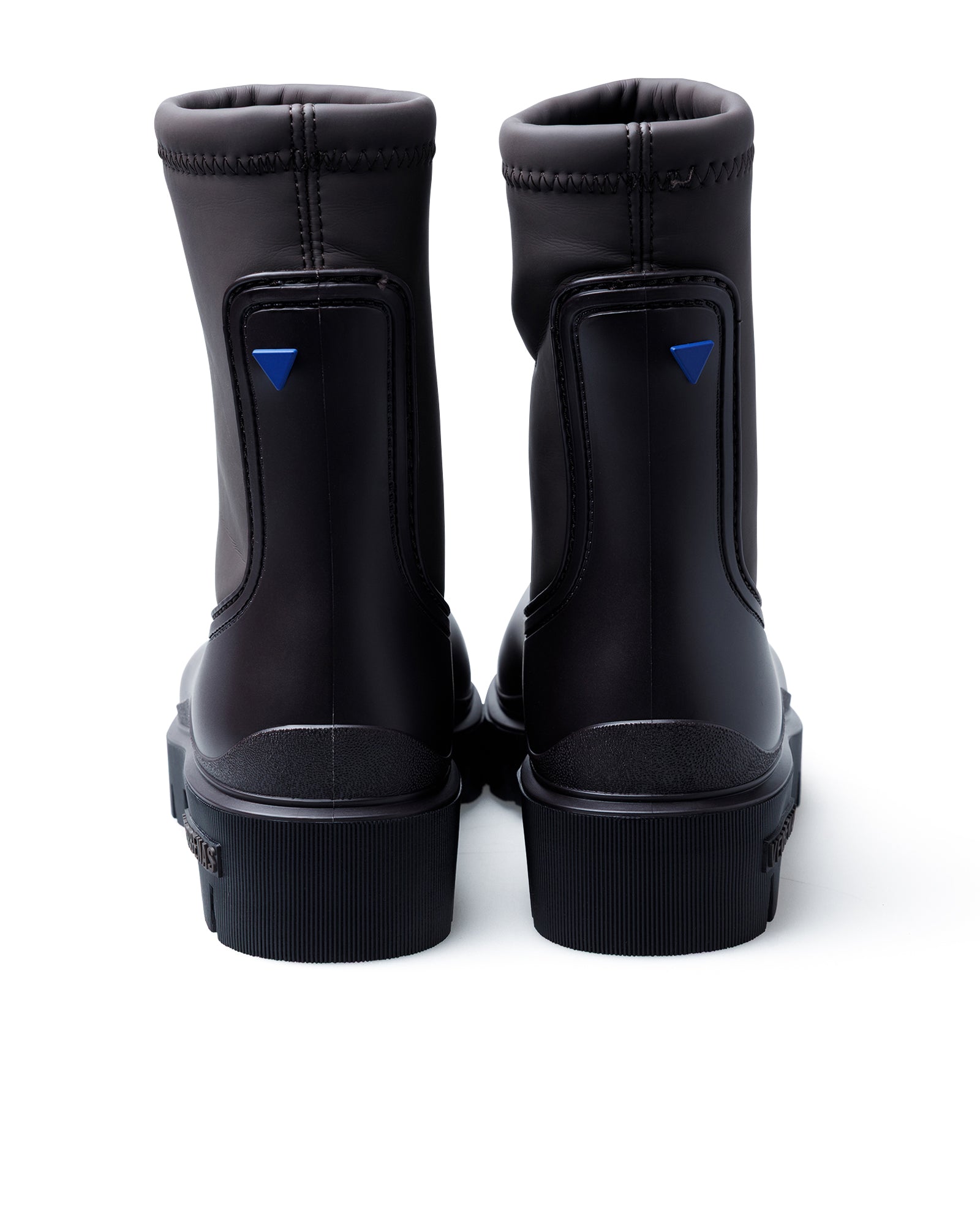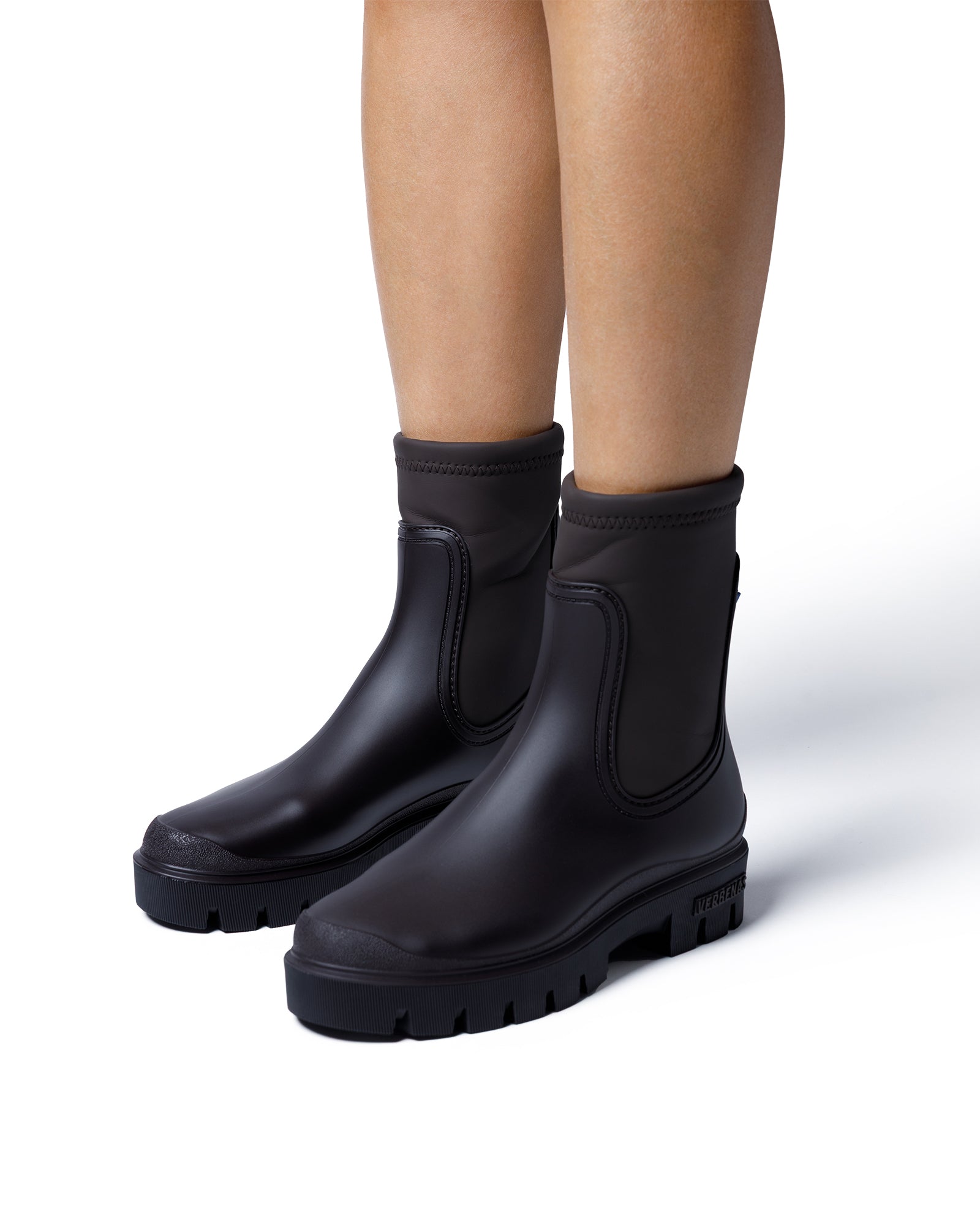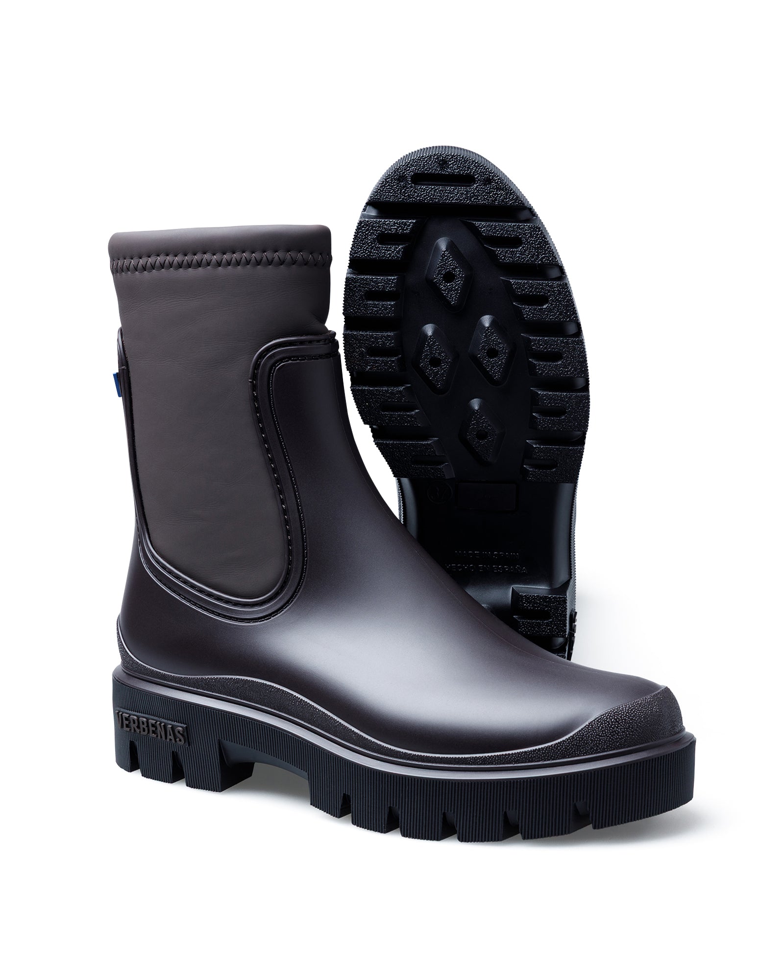 Muki Mate rain boots in Dark Brown. Made with synthetic upper, textile lining and sole and rubber sole. Boot height: 18 cm. The combination of a track sole and high-top bootie stands out. Muki is ideal for those looking for a versatile and modern style with the functionality of a technical boot.