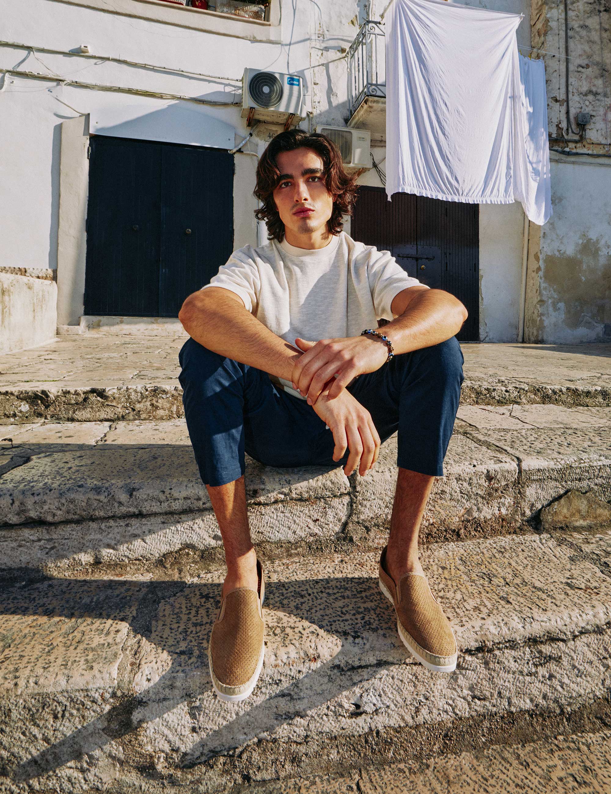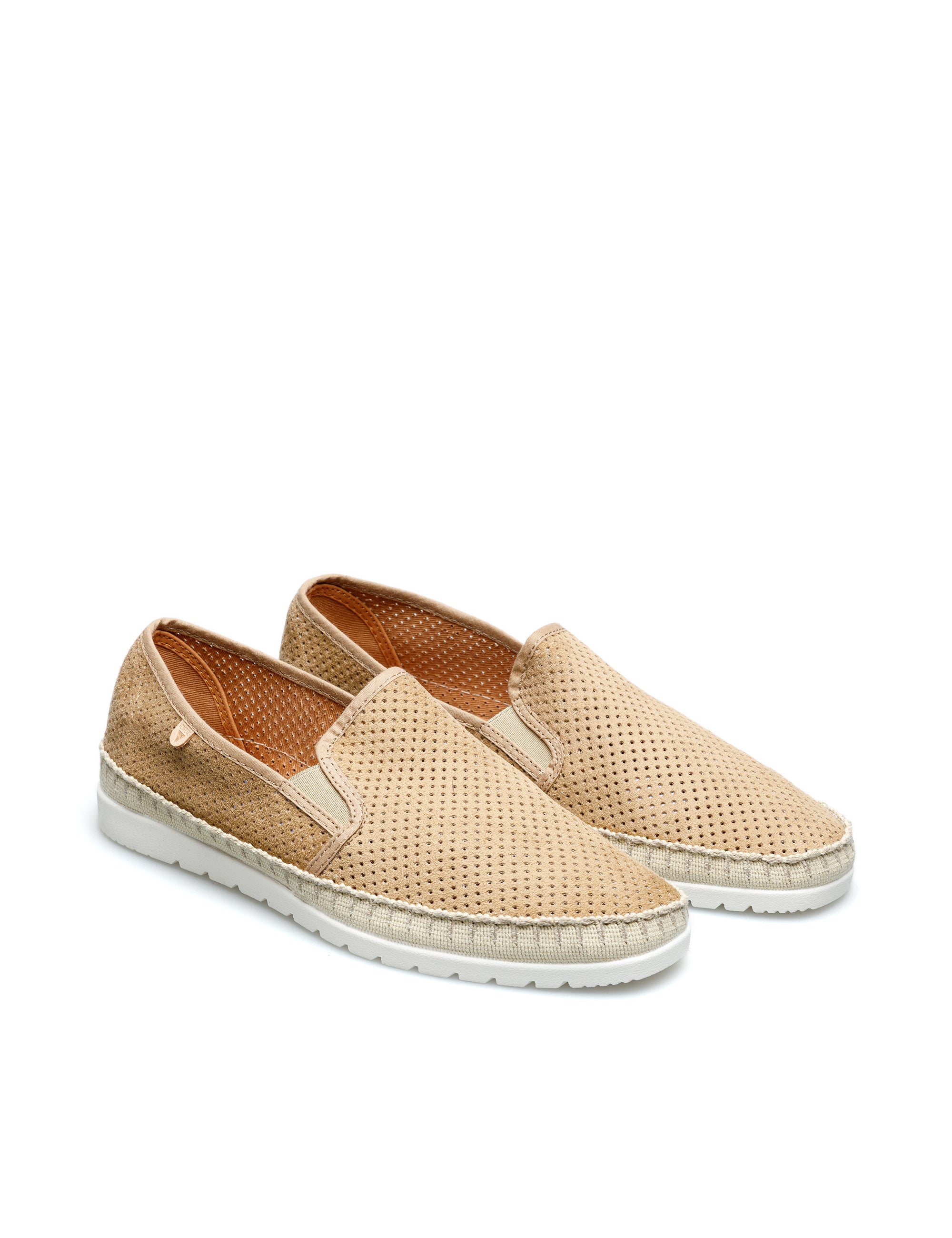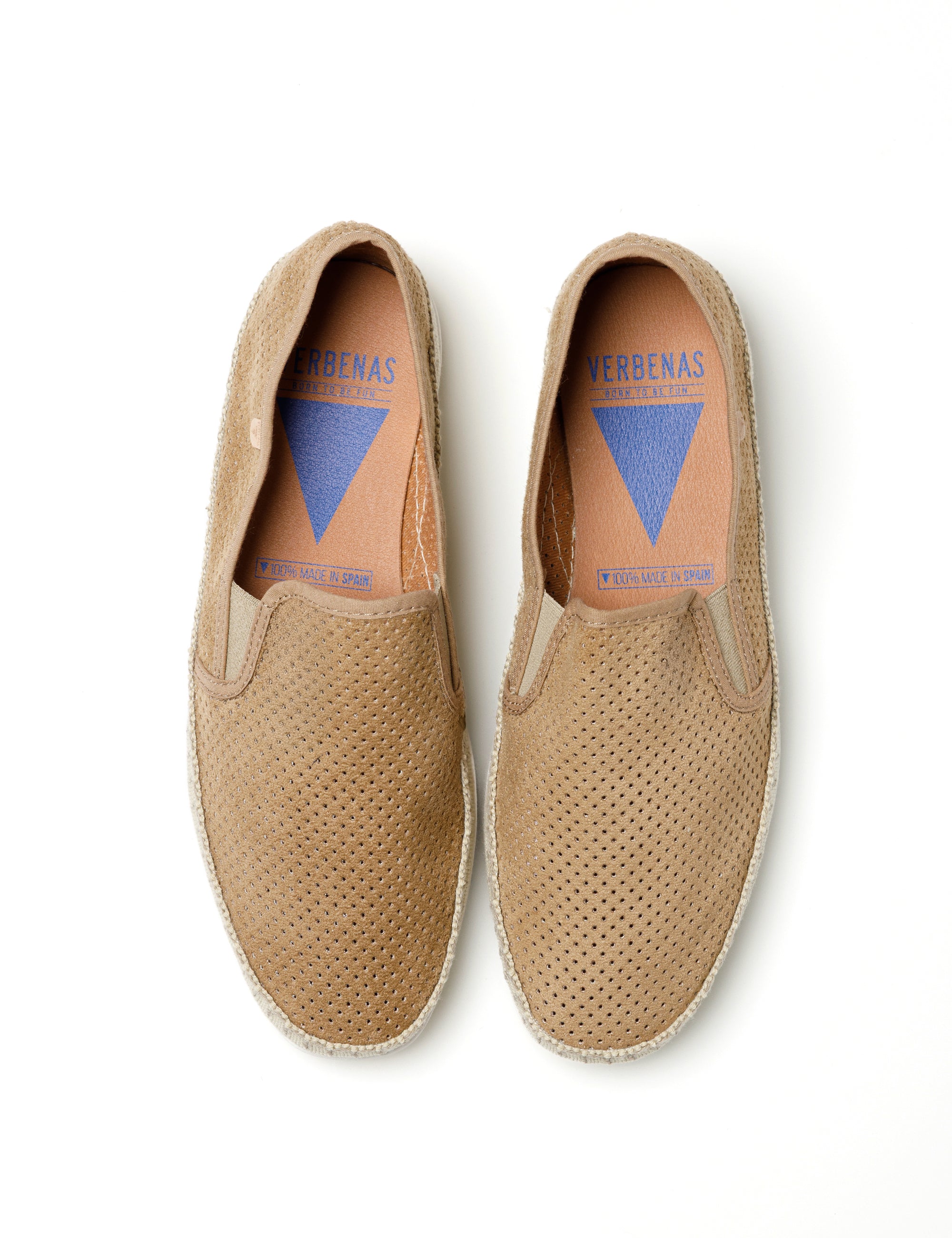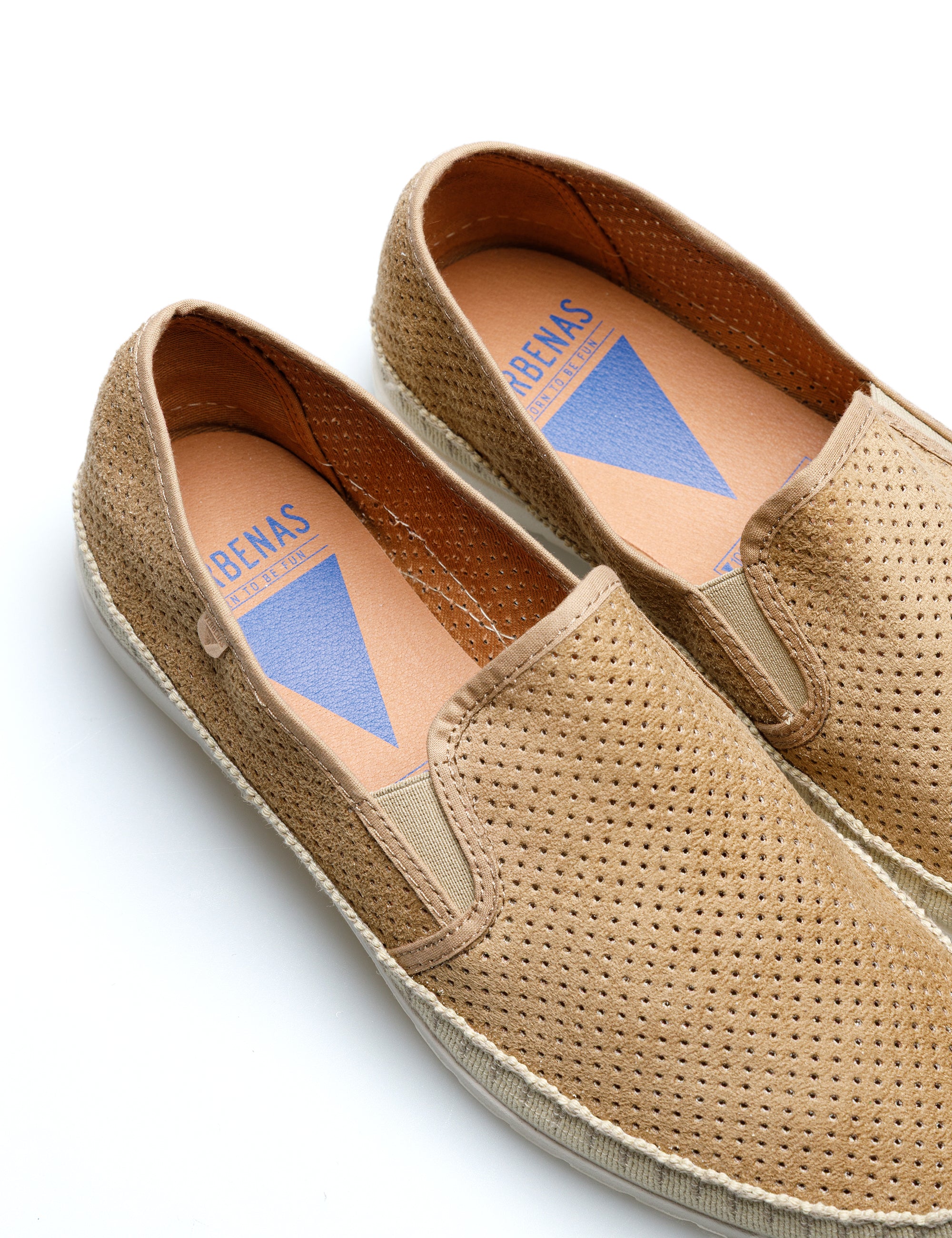 Boris Hole Gallery espadrilles in Oak colour. Made in Spain with micro-perforated textile material, leather lining and sole and ultra-flexible rubber sole. It has two side elastics that make it easy to adapt to the foot.With Boris, simplicity becomes elegance, offering practical footwear for the man who is looking for a unique and comfortable touch without losing the connection with Mediterranean roots.