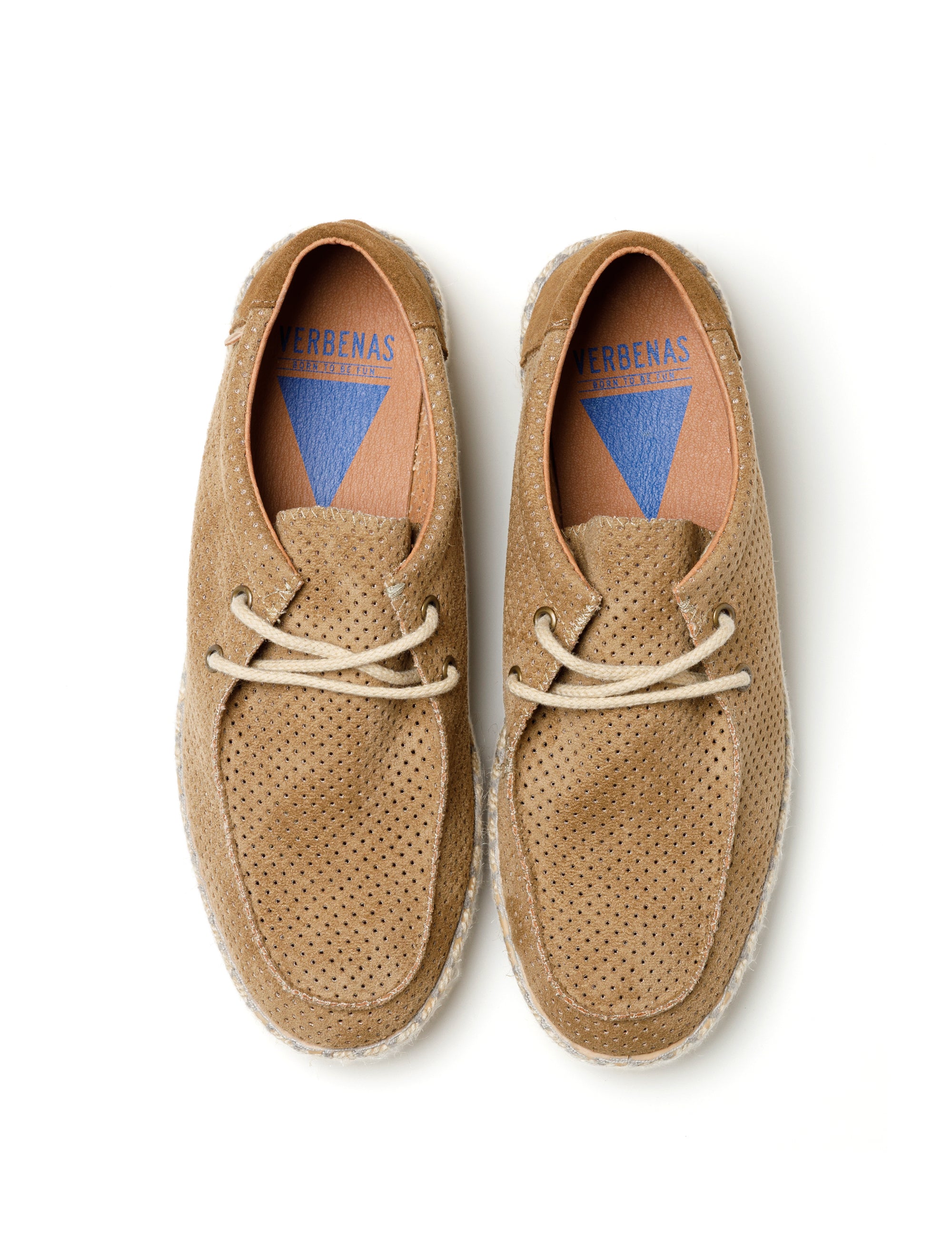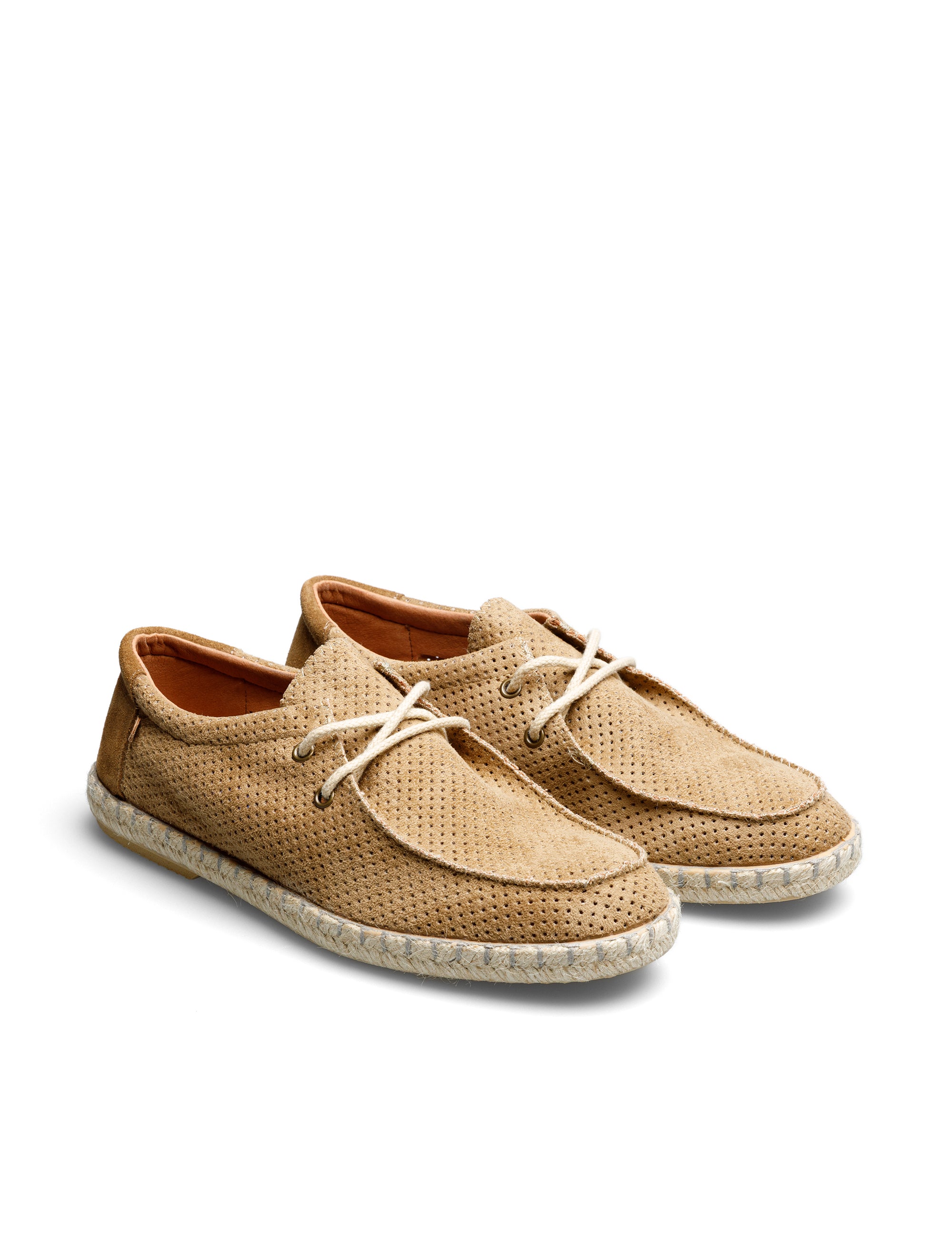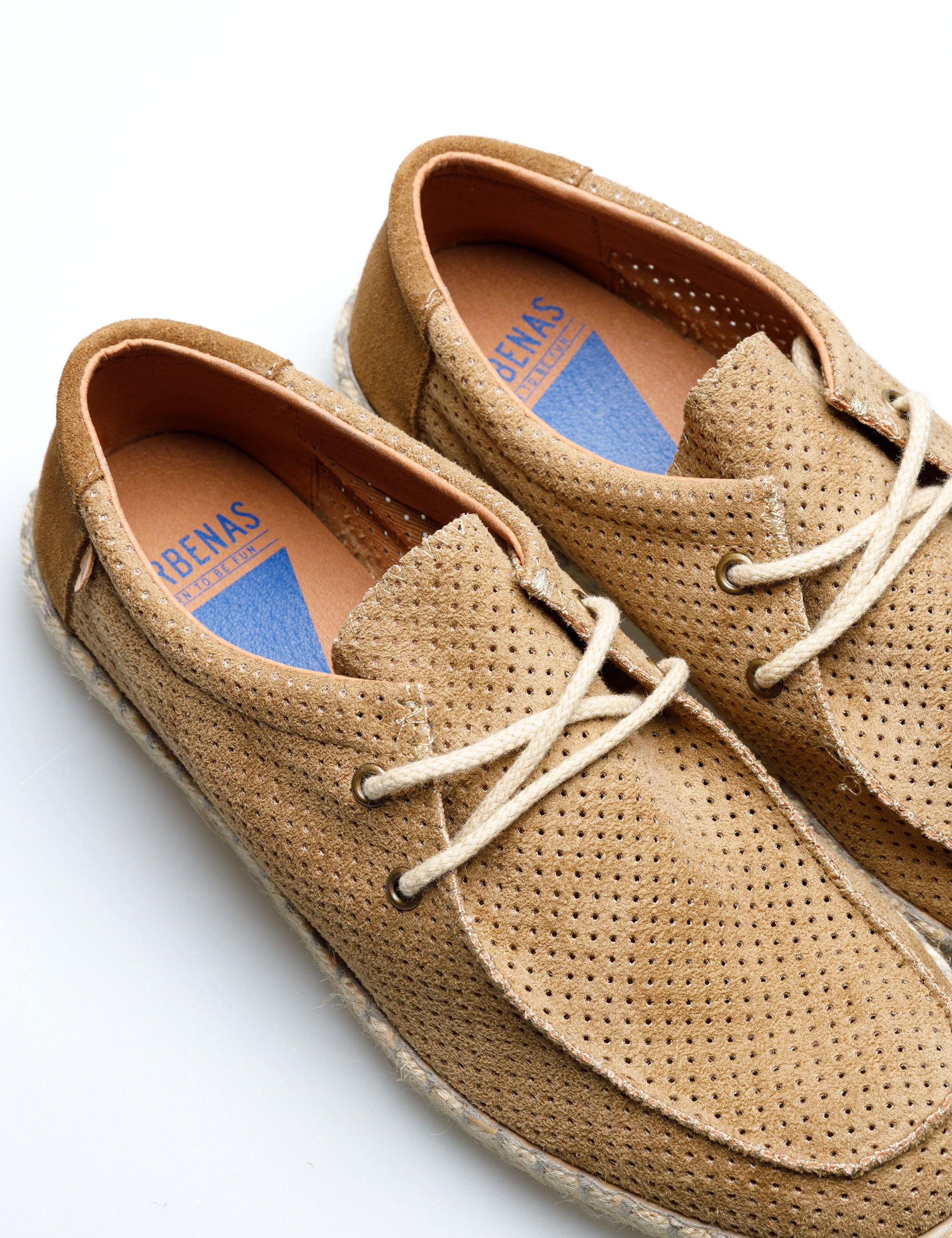 Truman Hole espadrilles in Oak colour. Made in Spain with textile material, leather lining and sole and jute and rubber sole. Truman is an ode to Mediterranean tradition, a piece that encapsulates the essence of the most authentic men's footwear, fusing the past with the freshness of the present.