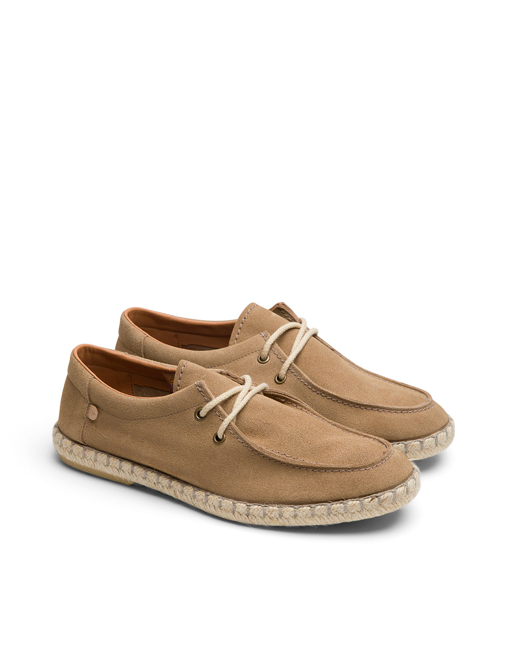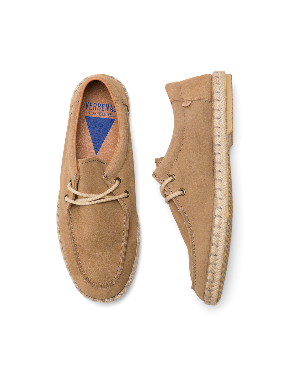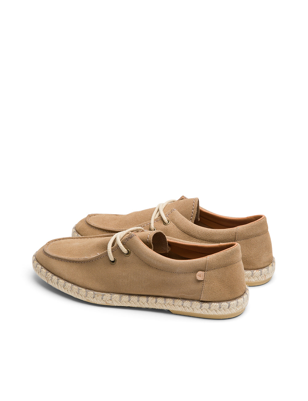 Truman Serraje espadrilles in mud colour. Made in Spain with split suede material, leather lining and sole and jute and rubber sole. Truman is an ode to Mediterranean tradition, a piece that encapsulates the essence of the most authentic men's footwear, fusing the past with the freshness of the present.
