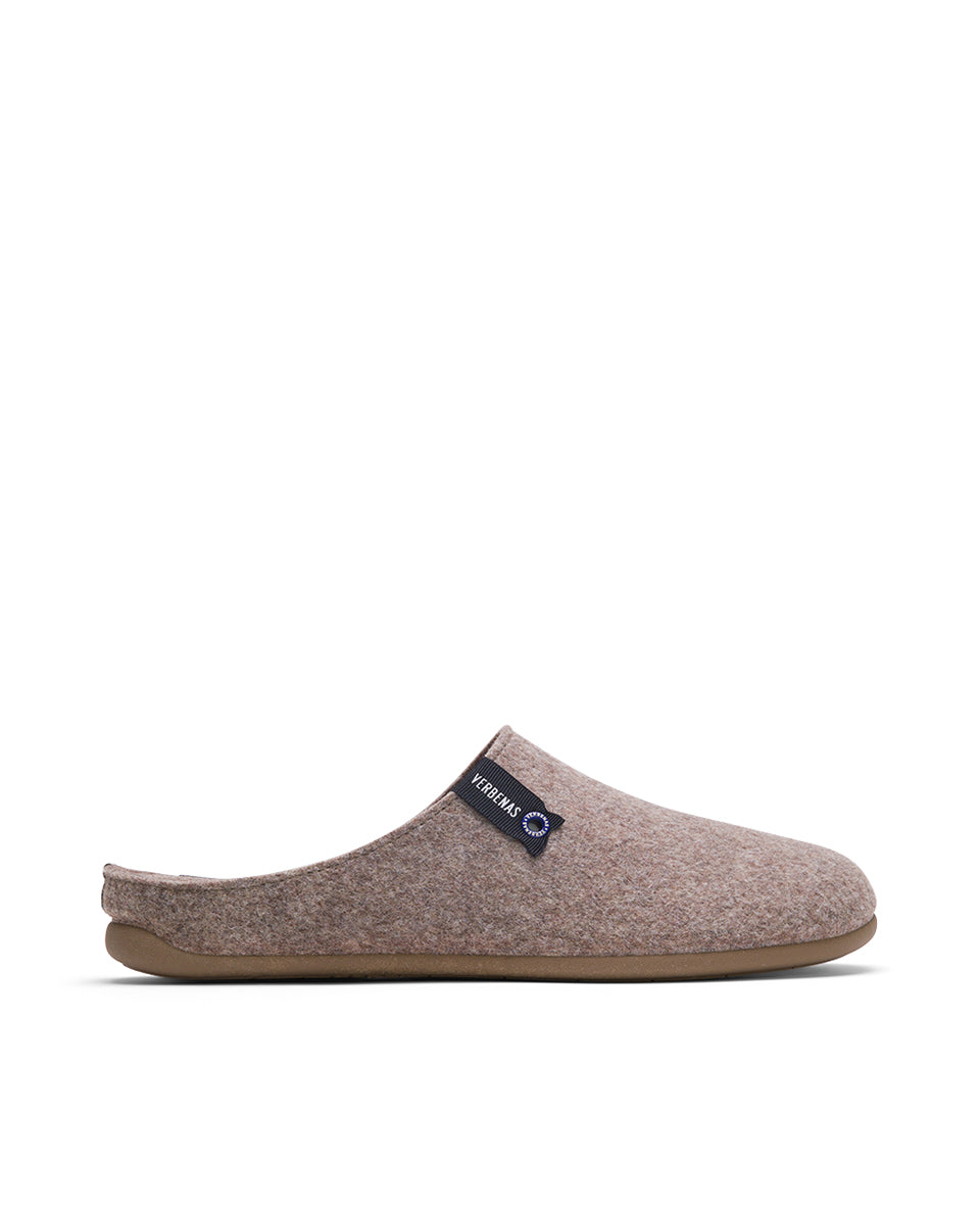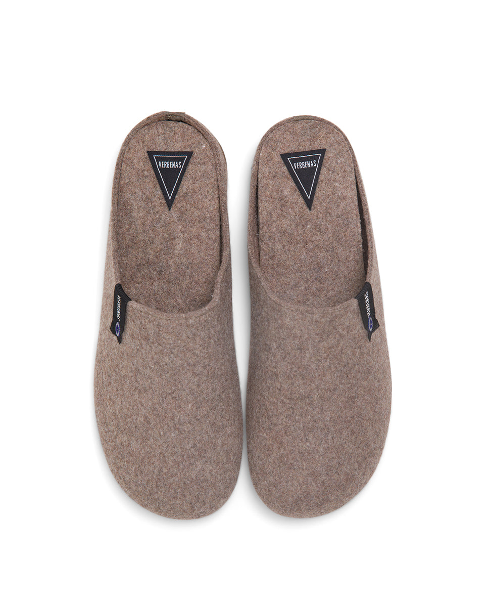 Eagle Felt Pet slippers in Earth colour. Made from recycled PET felt, with 100% PES lining and sole, and 100% rubber sole. Made in Spain. Features felt exterior and interior. Eagle, with its classic clog design, offers a perfect balance between structure and softness. Easy to wear and incredibly comfortable.