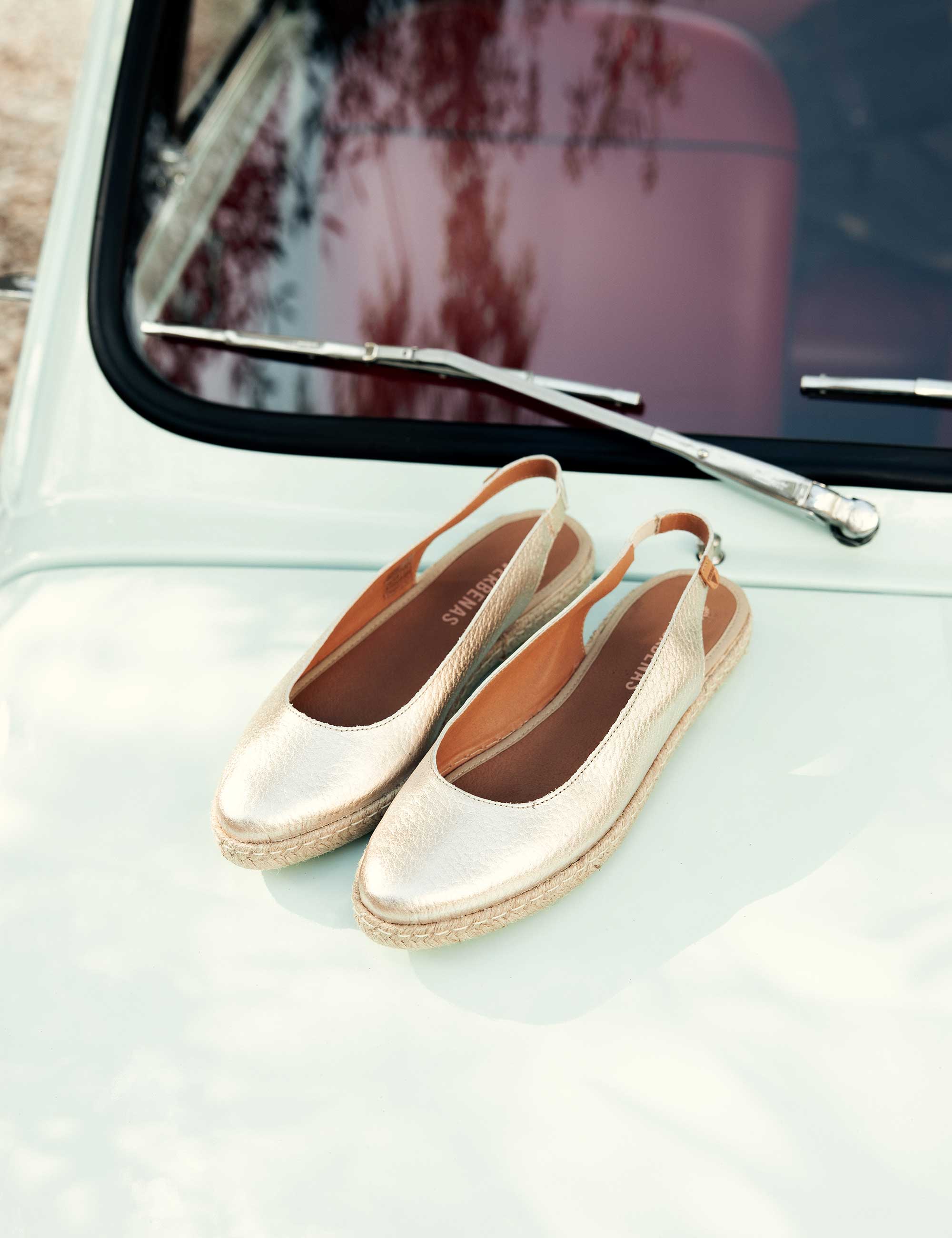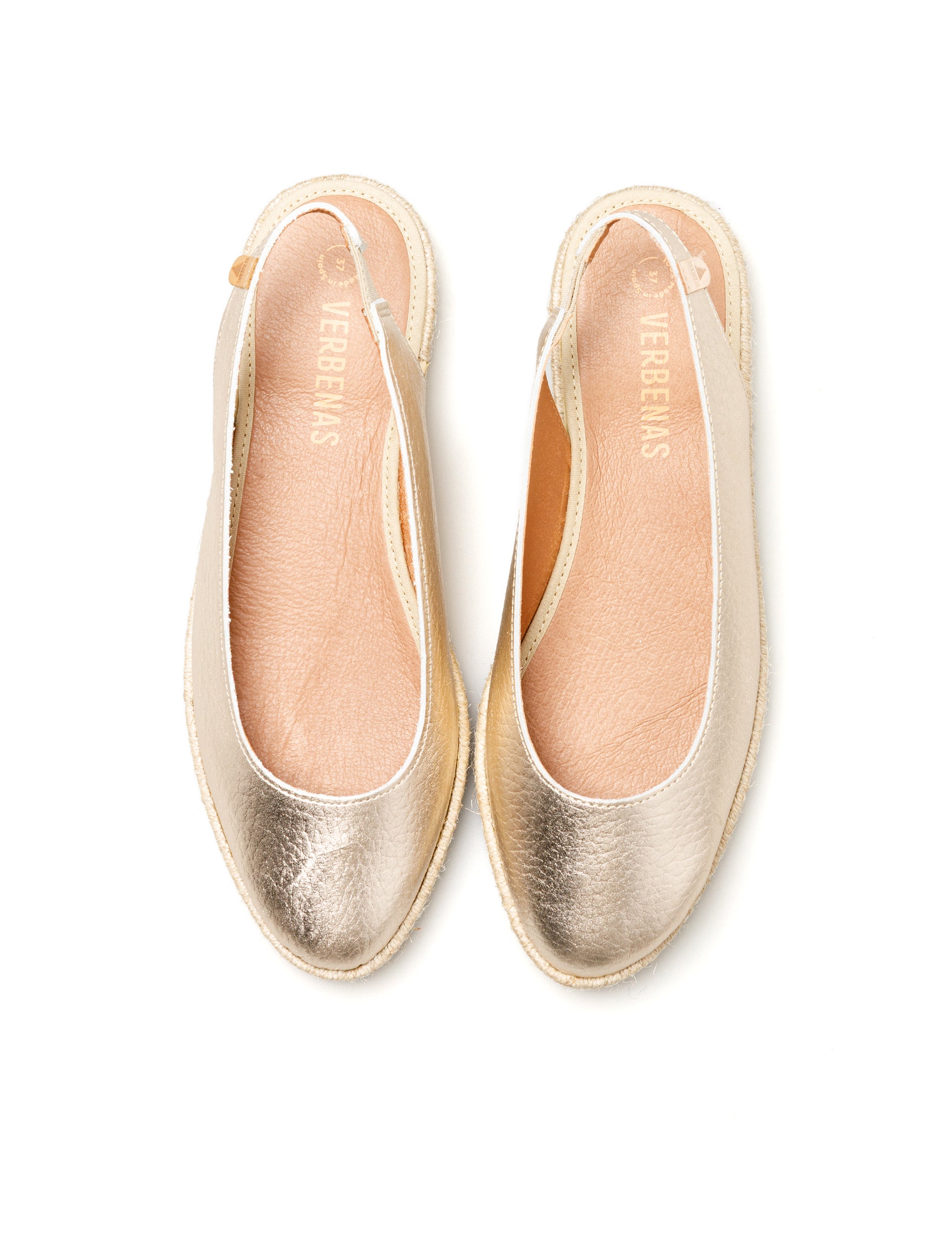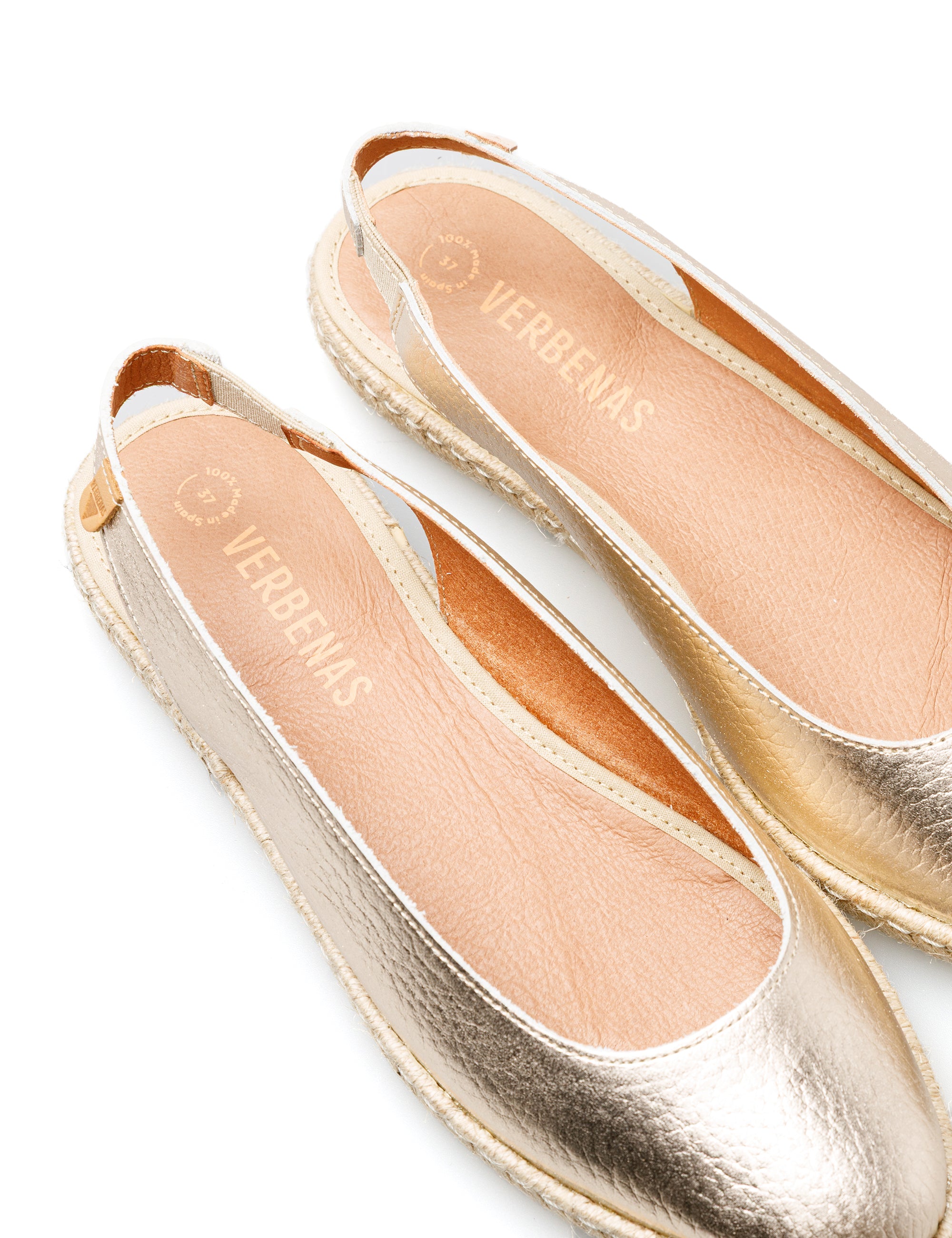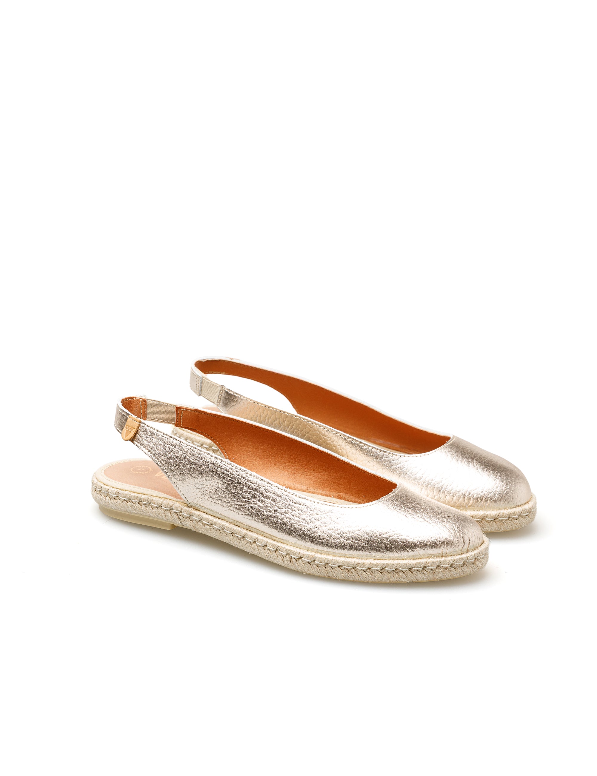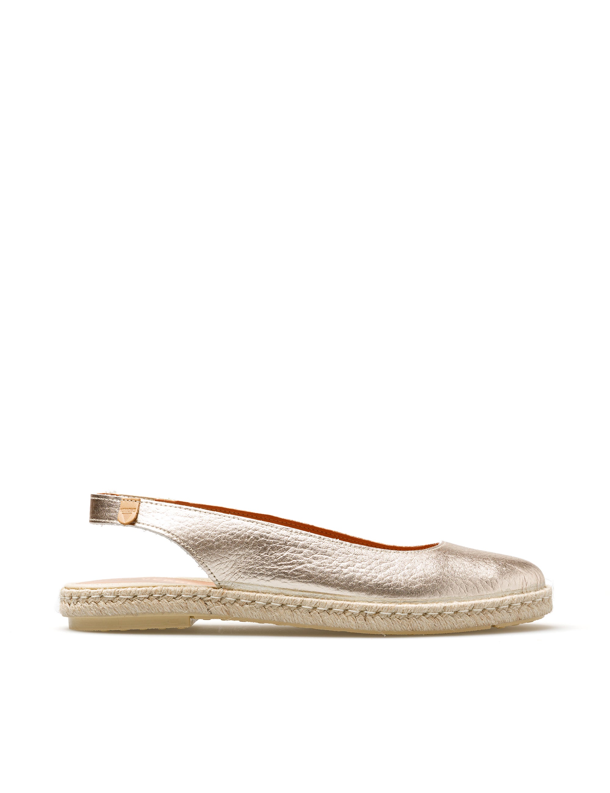 Kiara Núcleo Metal flat espadrilles in gold. Made with textured nappa leather material, leather lining and sole and jute and rubber sole. Made in Spain. Kiara is an espadrille that fuses the classic elegance of penny loafers with the handcrafted essence of the Mediterranean. Its jute sole and stitching pay homage to the tradition of Mediterranean craftsmanship, while its contemporary design, with clean, sophisticated lines, brings freshness and modernity.