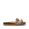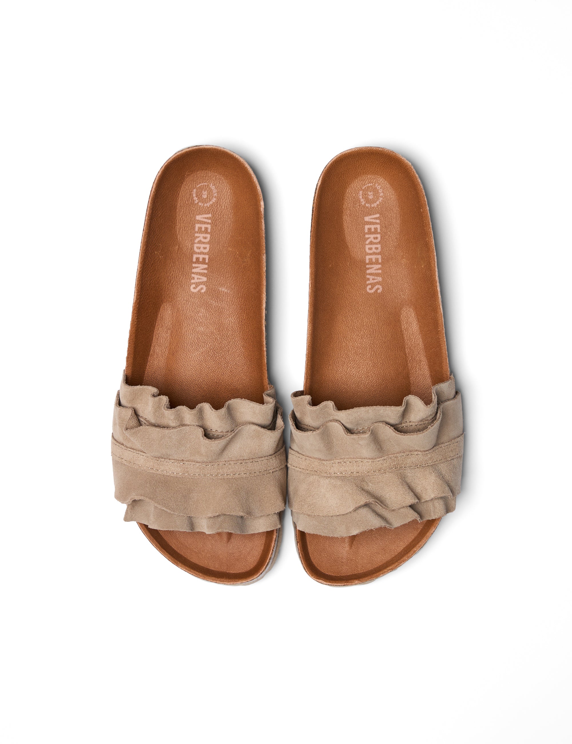 Rocio Volante sandals in stone colour. Made with split suede material, leather lining and sole and rubber and cork sole. Made in Spain.Rocio is the icon of our family of sandals, a piece that represents the essence of Verbenas with a simple design but full of character. Inspired by contemporary trends, this sandal is distinguished by its double ruffle, a detail that brings movement, freshness and a unique style that does not go unnoticed.