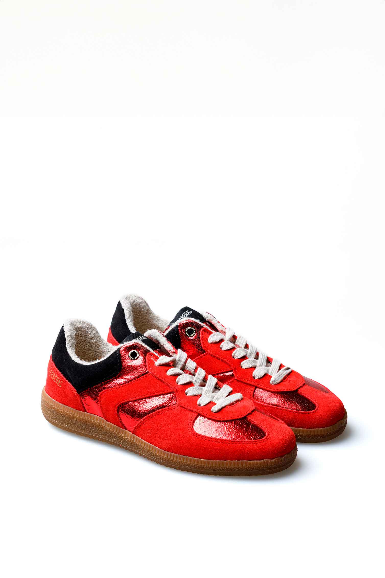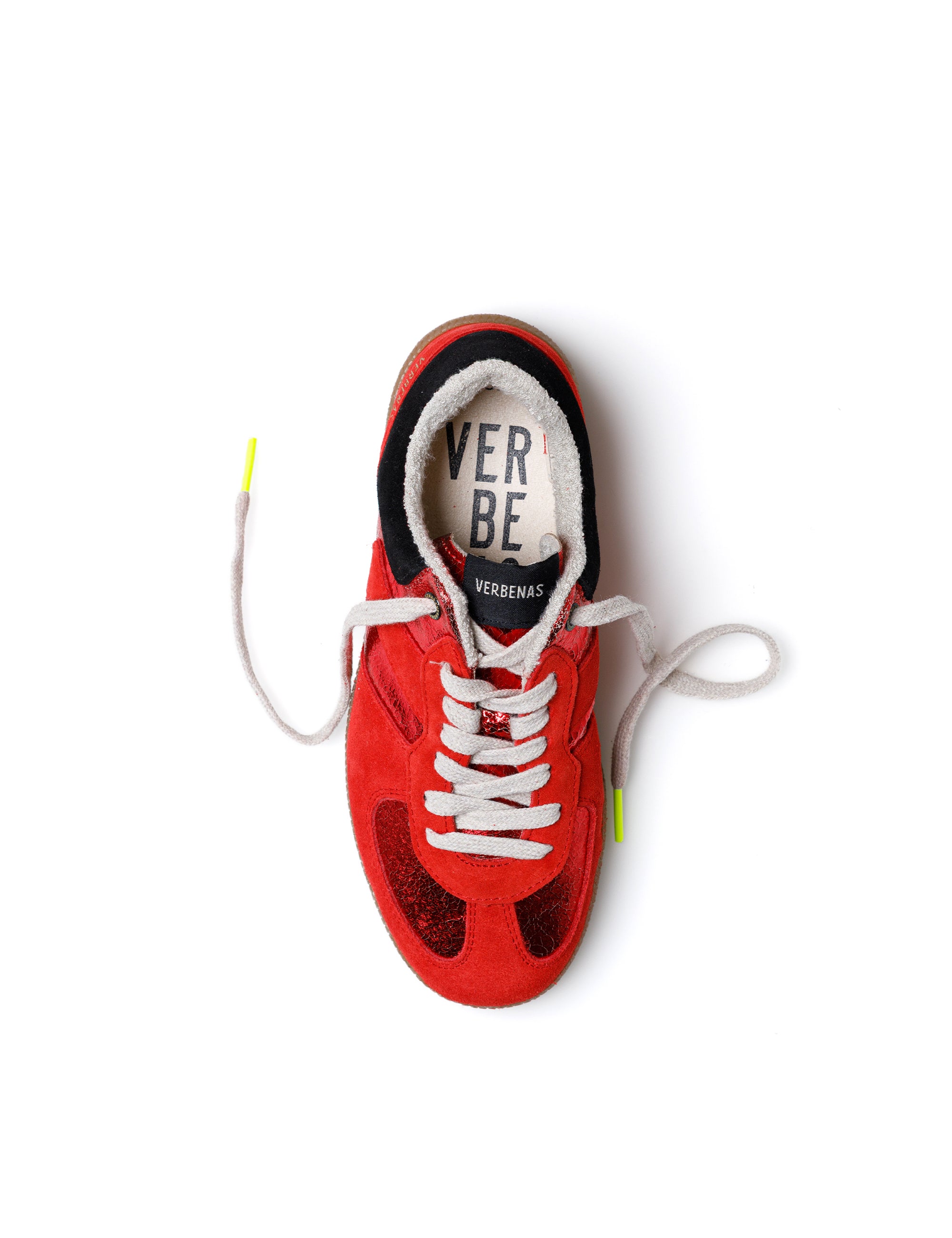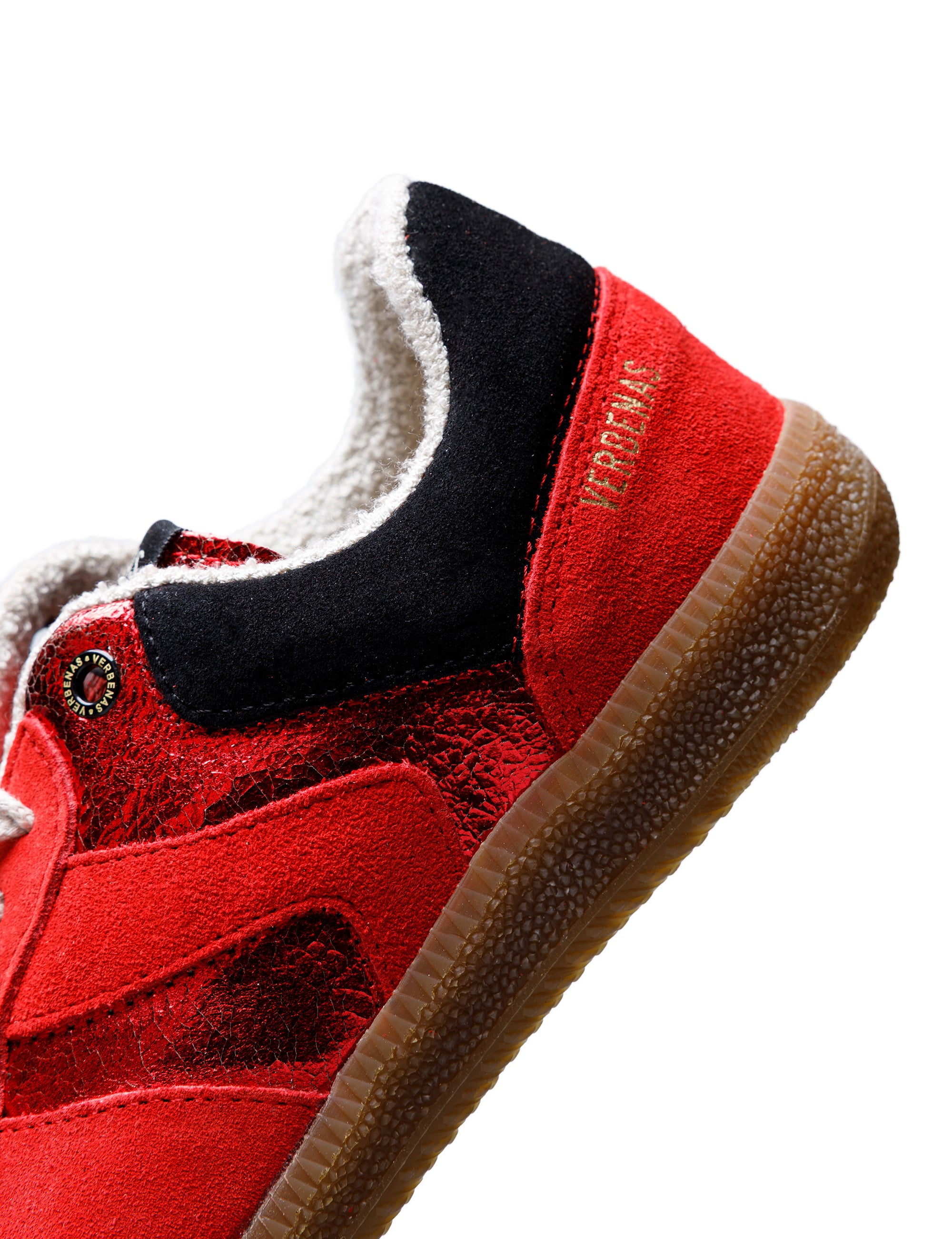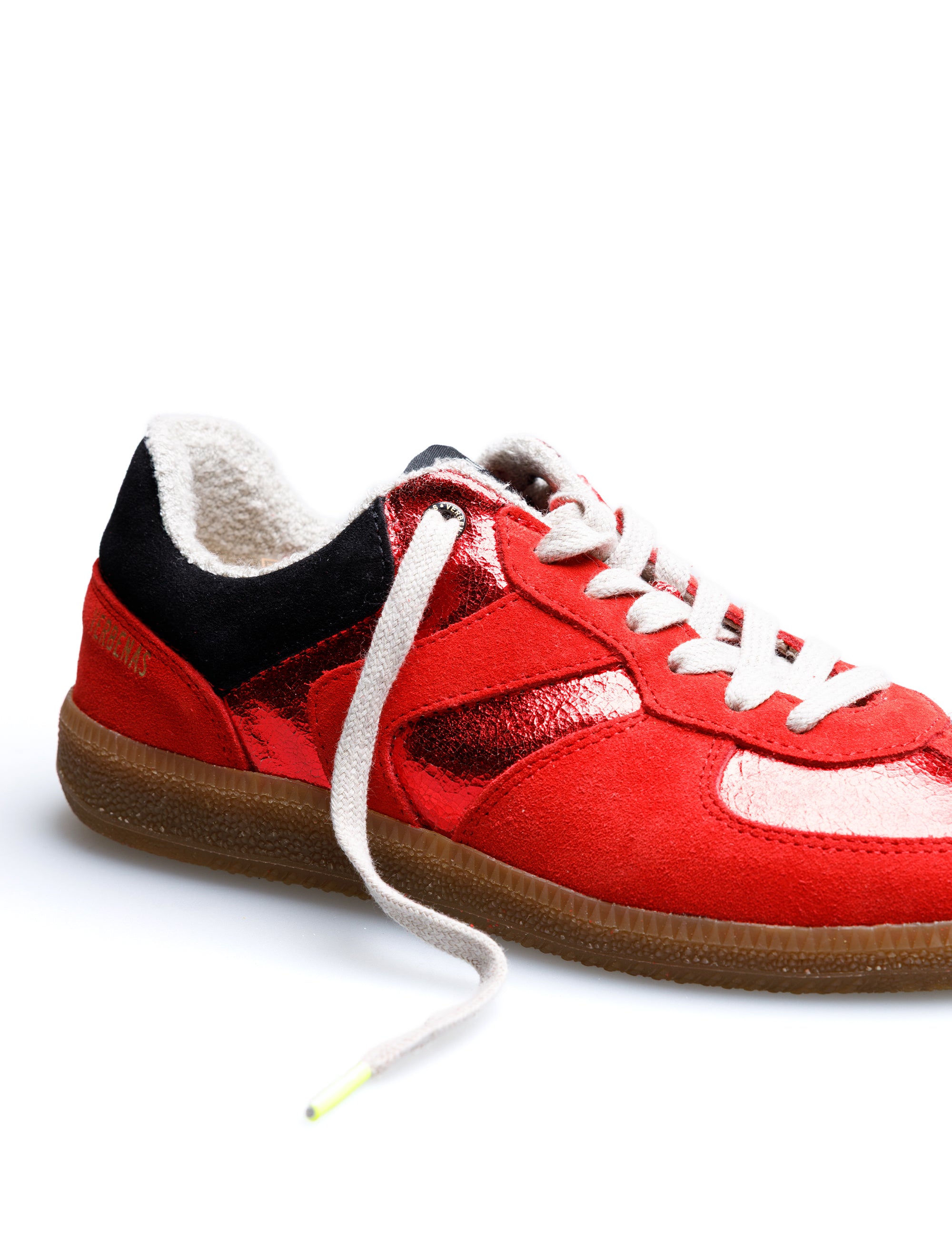 Sora Cracking/Suede Sneakers in Red/Red/Black. Made of suede and suede material with a laminated and treated finish, they have a bamboo fiber terry lining, a breathable, flexible and comfortable insole that absorbs the tread and a natural rubber sole. Introducing our Sora sneaker collection, a true retro-style icon. With iconic details and bold shapes, each design exudes authenticity and timeless style. Explore the urban spirit and celebrate retro style with every step.