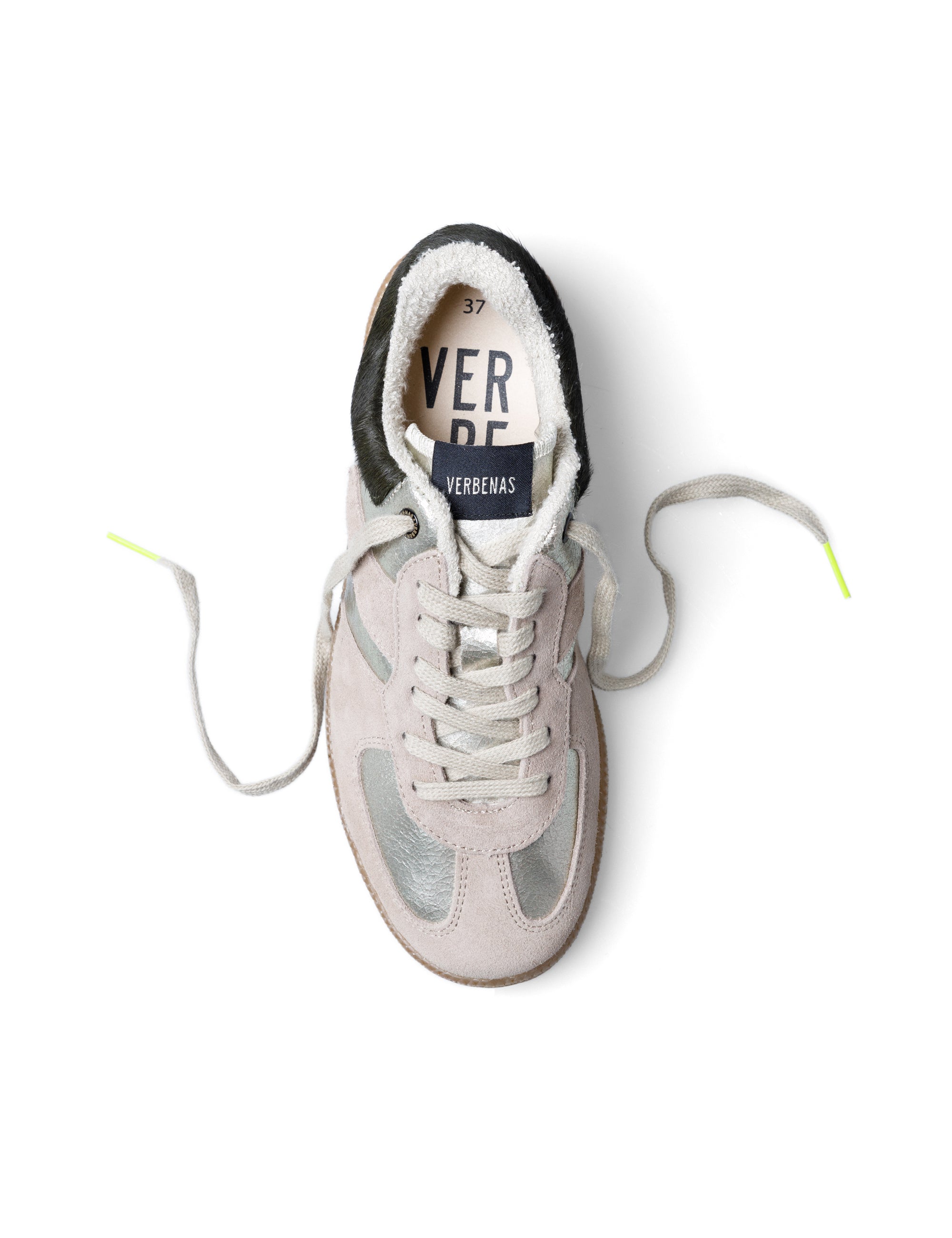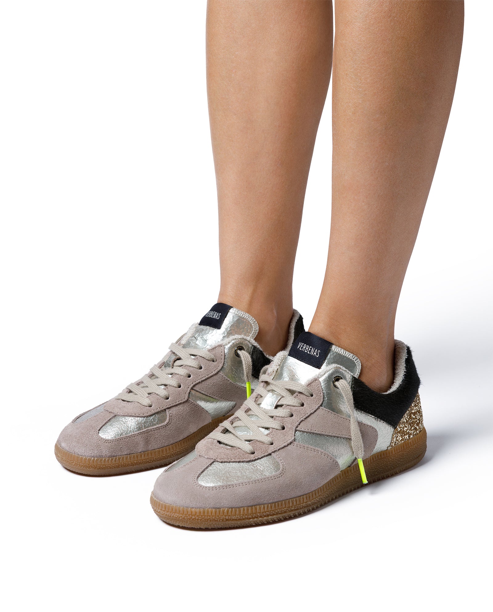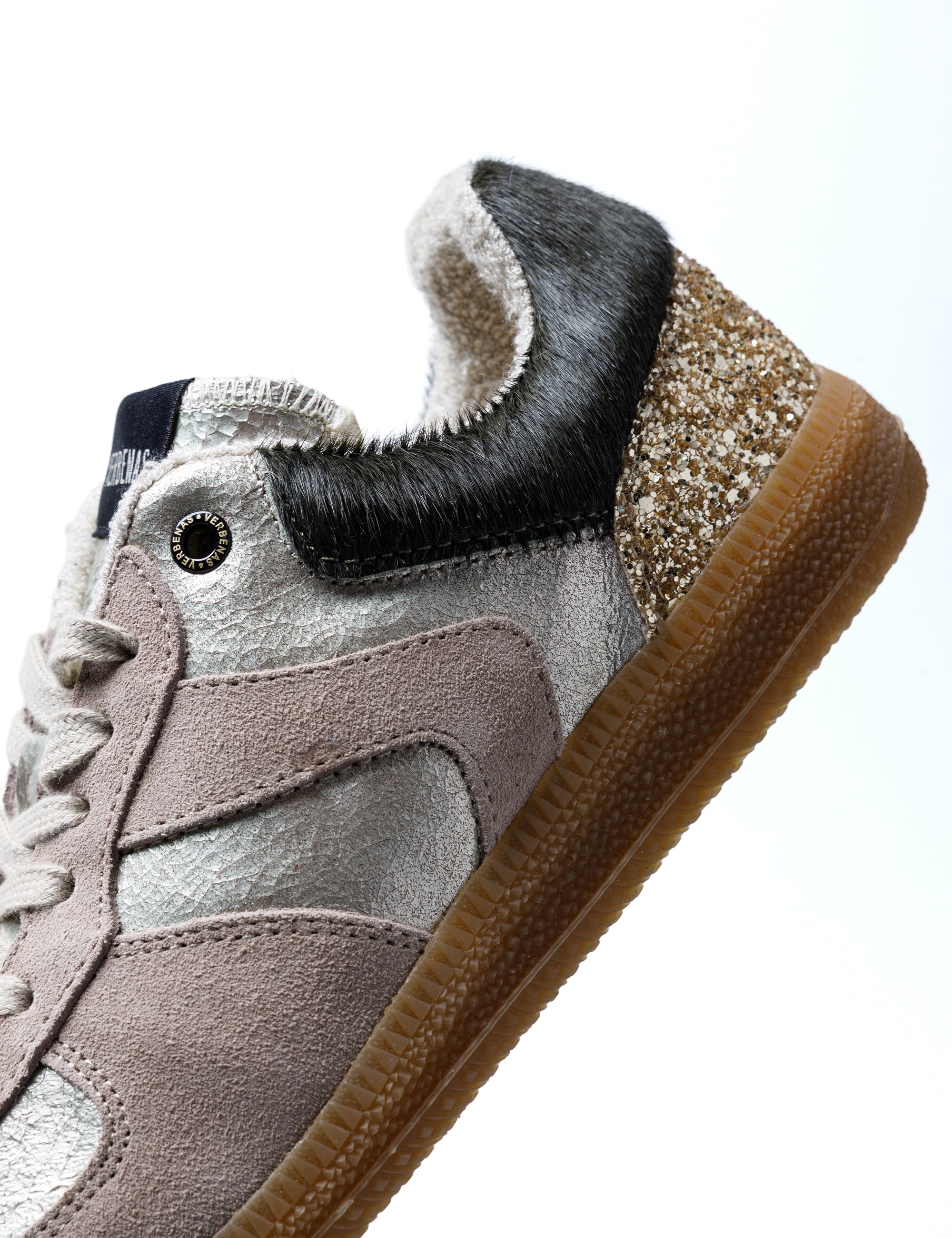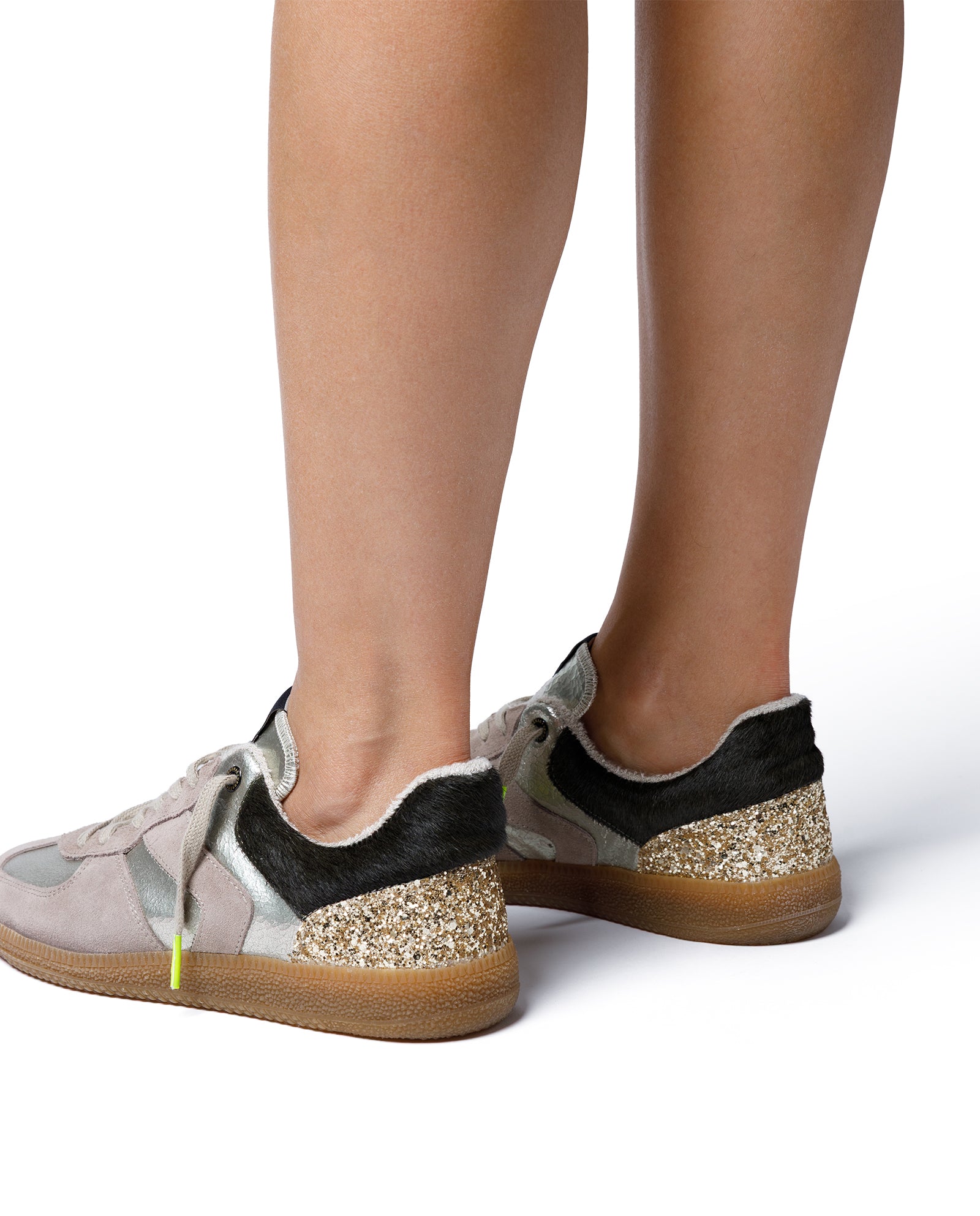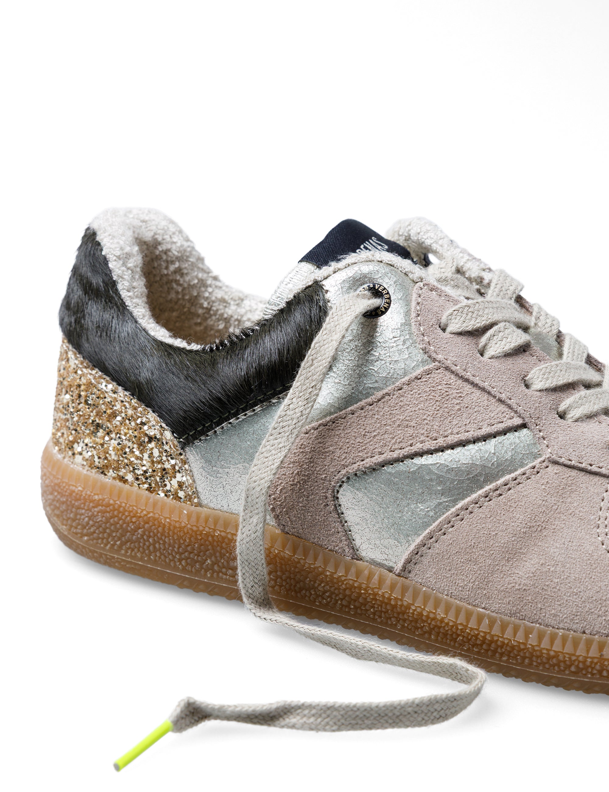 Sora Fantasy sneakers in Gold/Stone/Kaki. Made of suede material with a laminated finish combined with suede, glitter and pony hair, they have a bamboo fibre terry lining, a breathable, flexible and comfortable insole that absorbs the tread and a natural rubber sole. Introducing our Sora sneaker collection, a true retro-style icon. With iconic details and bold shapes, each design exudes authenticity and timeless style. Explore the urban spirit and celebrate retro style with every step.