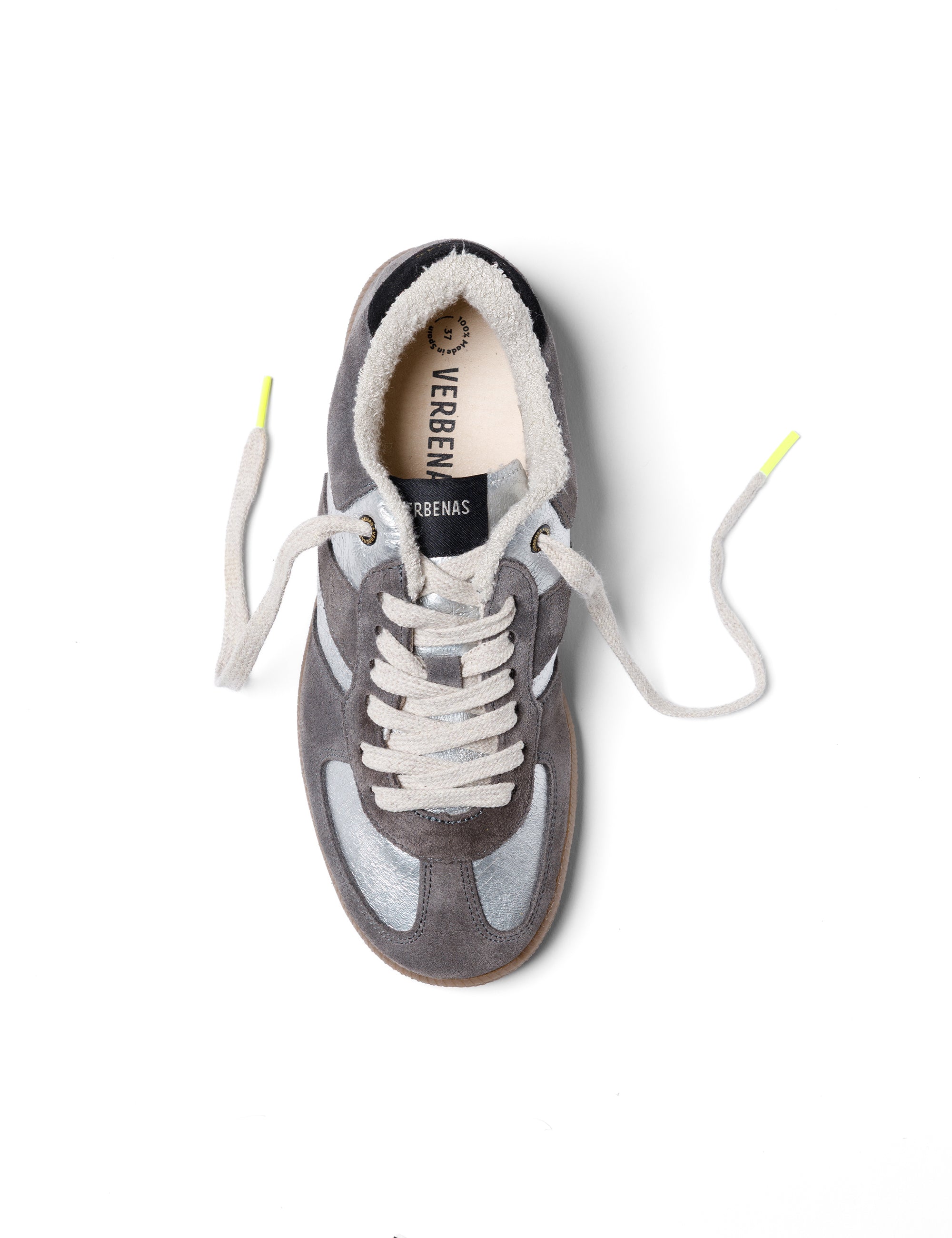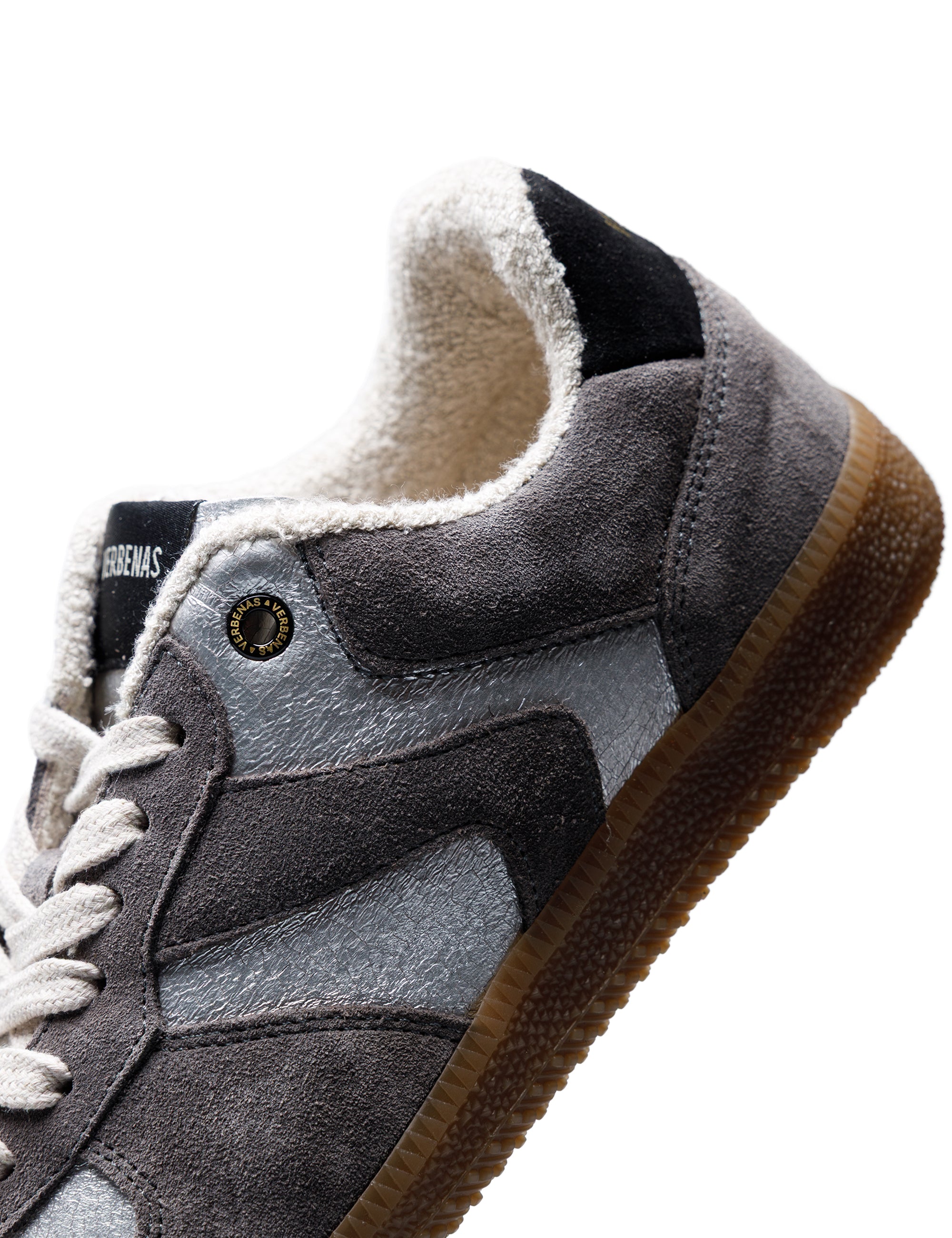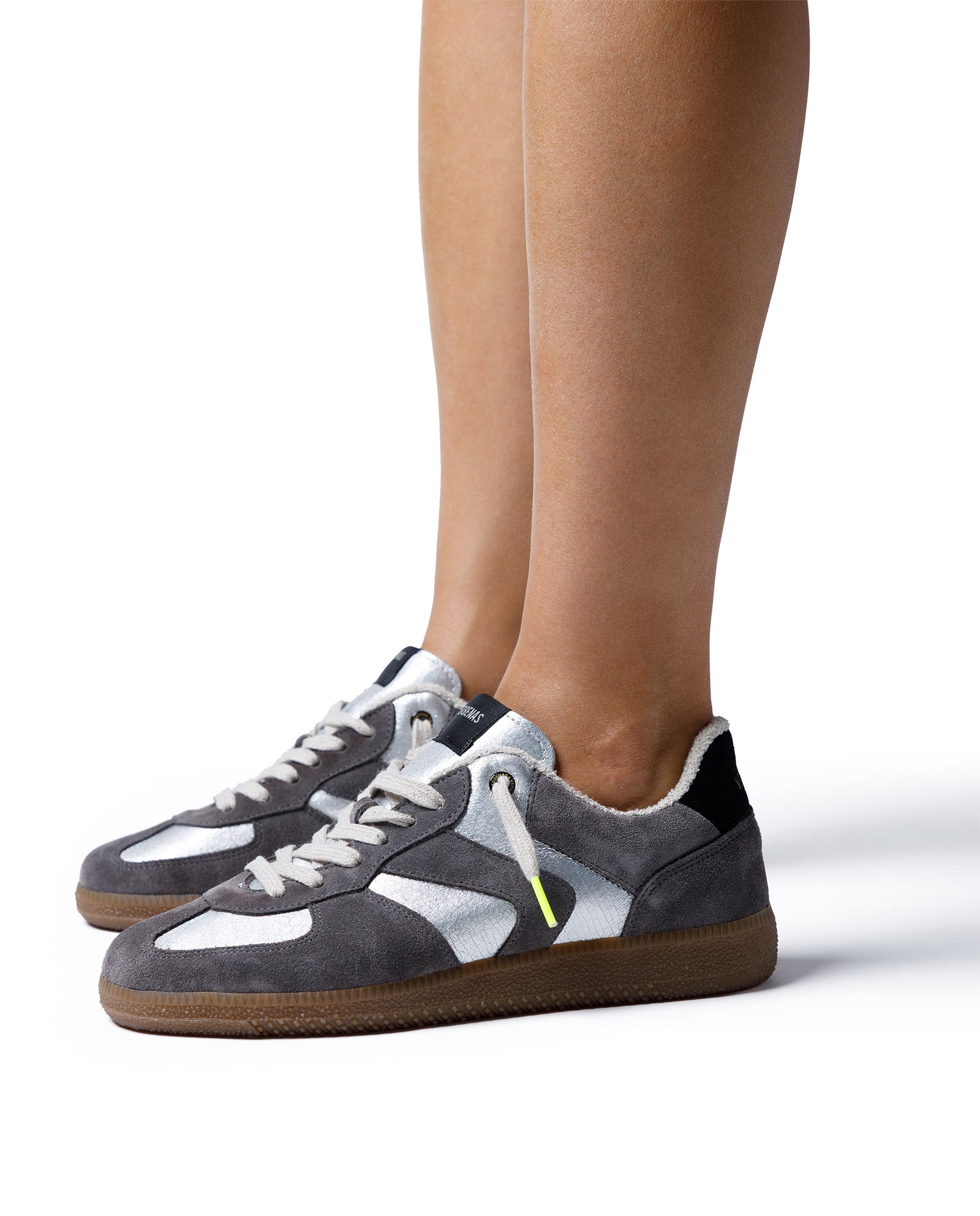 Sora Cracking/Suede Sneakers in Silver/Anthracite/Black. Made of suede and split leather with a laminated and treated finish, they have a bamboo fibre terry lining, a breathable, flexible and comfortable sole that absorbs the tread and a natural rubber sole. Introducing our Sora sneaker collection, a true retro-style icon. With iconic details and bold shapes, each design exudes authenticity and timeless style. Explore the urban spirit and celebrate retro style with every step.