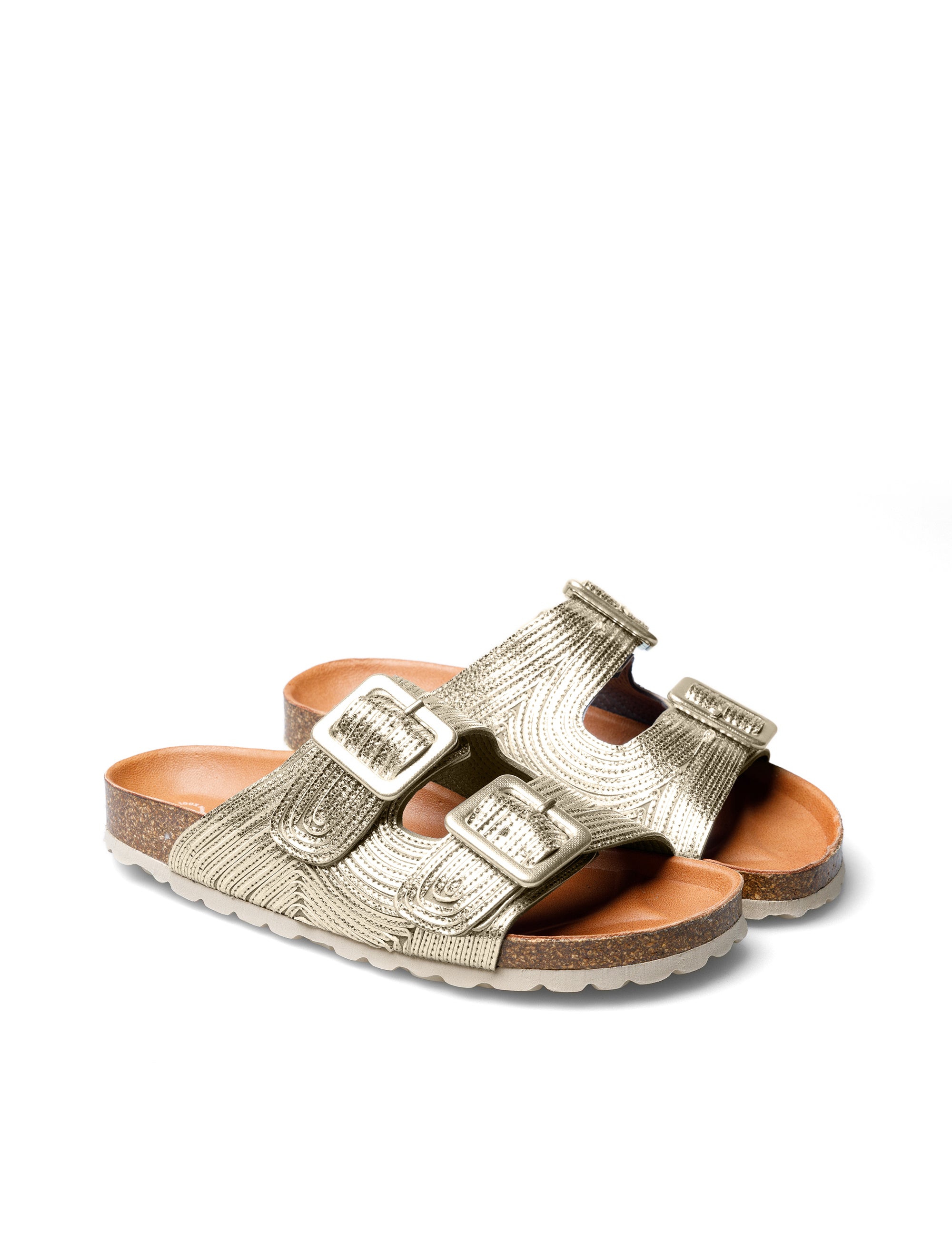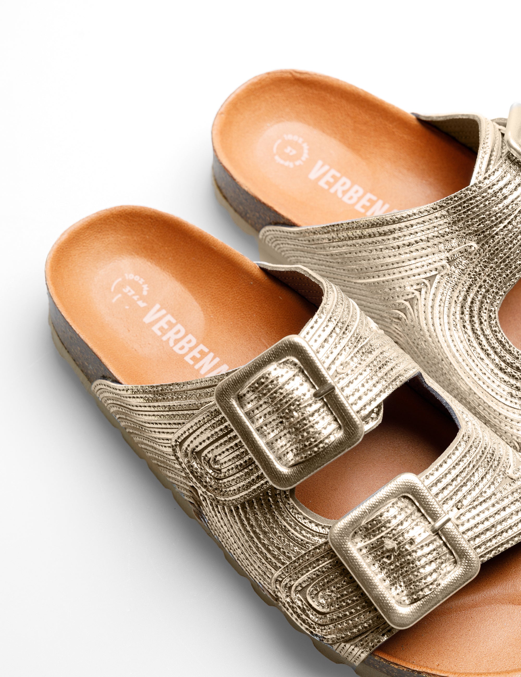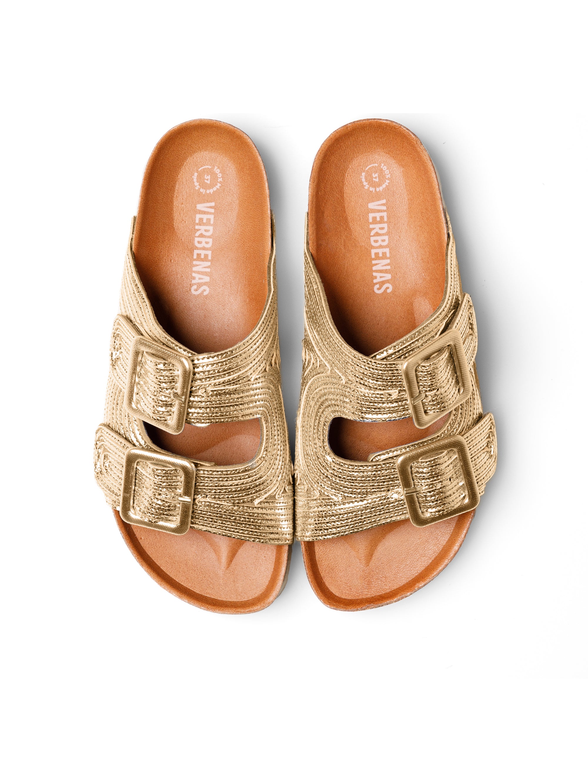 Sandales en métal Ruth Lato de couleur dorée. Fabriquées en cuir synthétique, doublure et semelle en cuir, semelle en caoutchouc et liège, fabriquées en Espagne. Ruth offre un équilibre parfait entre classique et moderne, idéal pour celles qui recherchent un design alliant style et authenticité.